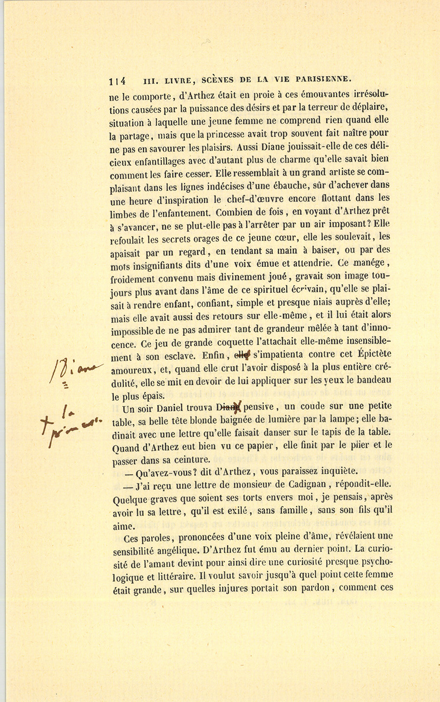 Un soir Daniel trouva la princesse pensive, un coude sur une petite table, sa belle tête blonde baignée de lumière par la lampe ; elle badinait avec une lettre qu’elle faisait danser sur le tapis de la table. Quand d’Arthez eut bien vu ce papier, elle finit par le plier et le passer dans sa ceinture.