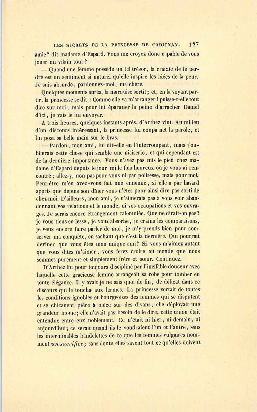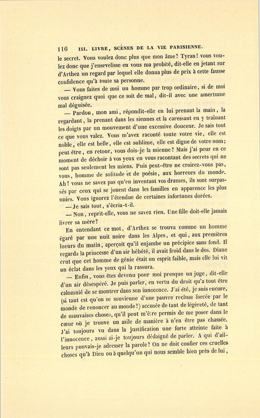 – Monsieur de Cadignan n’a pas cru nécessaire de me demander {p. 116} le secret. Vous voulez donc plus que mon âme ? Tyran ! vous voulez donc que j’ensevelisse en vous ma probité, dit-elle en jetant sur d’Arthez un regard par lequel elle donna plus de prix à cette fausse confidence qu’à toute sa personne.
