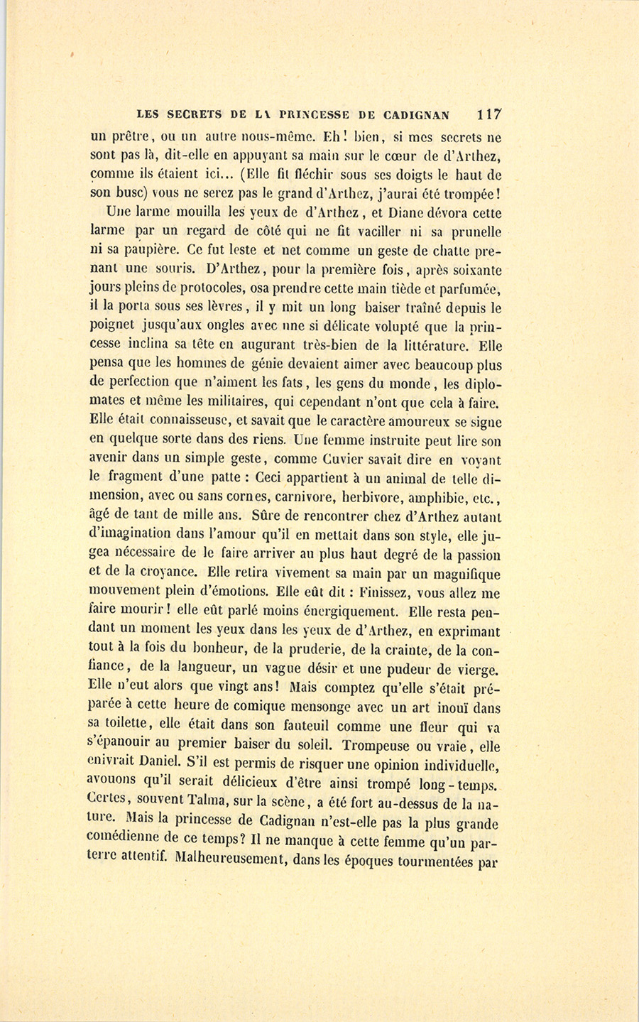 Une larme mouilla les yeux de d’Arthez, et Diane dévora cette larme par un regard de côté qui ne fit vaciller ni sa prunelle ni sa paupière. Ce fut leste et net comme un geste de chatte prenant une souris. D’Arthez, pour la première fois, après soixante jours pleins de protocoles, osa prendre cette main tiède et parfumée, il la porta sous ses lèvres, il y mit un long baiser traîné depuis le poignet jusqu’aux ongles avec une si délicate volupté que la princesse inclina sa tête en augurant très-bien de la littérature. Elle pensa que les hommes de génie devaient aimer avec beaucoup plus de perfection que n’aiment les fats, les gens du monde, les diplomates et même les militaires, qui cependant n’ont que cela à faire. Elle était connaisseuse, et savait que le caractère amoureux se signe en quelque sorte dans des riens. Une femme instruite peut lire son avenir dans un simple geste, comme Cuvier savait dire en voyant le fragment d’une patte : Ceci appartient à un animal de telle dimension, avec ou sans cornes, carnivore, herbivore, amphibie, etc., âgé de tant de mille ans. Sûre de rencontrer chez d’Arthez autant d’imagination dans l’amour qu’il en mettait dans son style, elle jugea nécessaire de le faire arriver au plus haut degré de la passion et de la croyance. Elle retira vivement sa main par un magnifique mouvement plein d’émotions. Elle eût dit : Finissez, vous allez me faire mourir ! elle eût parlé moins énergiquement. Elle resta pendant un moment les yeux dans les yeux de d’Arthez, en exprimant tout à la fois du bonheur, de la pruderie, de la crainte, de la confiance, de la langueur, un vague désir et une pudeur de vierge. Elle n’eut alors que vingt ans ! Mais comptez qu’elle s’était préparée à cette heure de comique mensonge avec un art inouï dans sa toilette, elle était dans son fauteuil comme une fleur qui va s’épanouir au premier baiser du soleil. Trompeuse ou vraie, elle enivrait Daniel. S’il est permis de risquer une opinion individuelle, avouons qu’il serait délicieux d’être ainsi trompé long-temps. Certes, souvent Talma, sur la scène, a été fort au-dessus de la nature. Mais la princesse de Cadignan n’est-elle pas la plus grande comédienne de ce temps ? Il ne manque à cette femme qu’un parterre attentif. Malheureusement, dans les époques tourmentées par {p. 118} les orages politiques, les femmes disparaissent comme les lys des eaux, qui, pour fleurir et s’étaler à nos regards ravis, ont besoin d’un ciel pur et des plus tièdes zéphyrs.