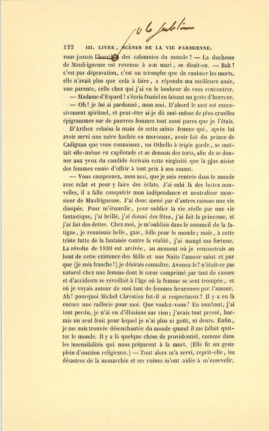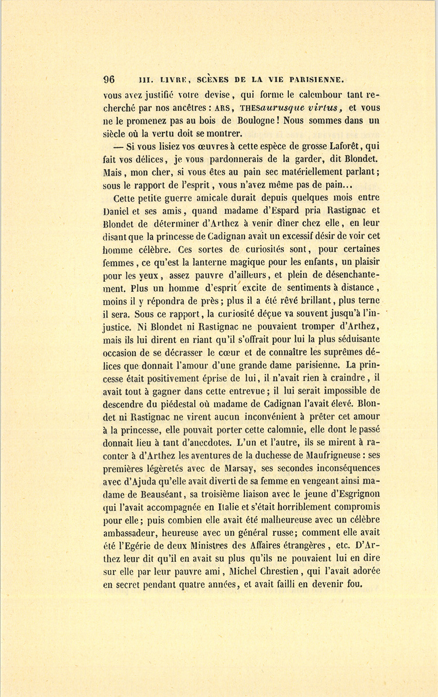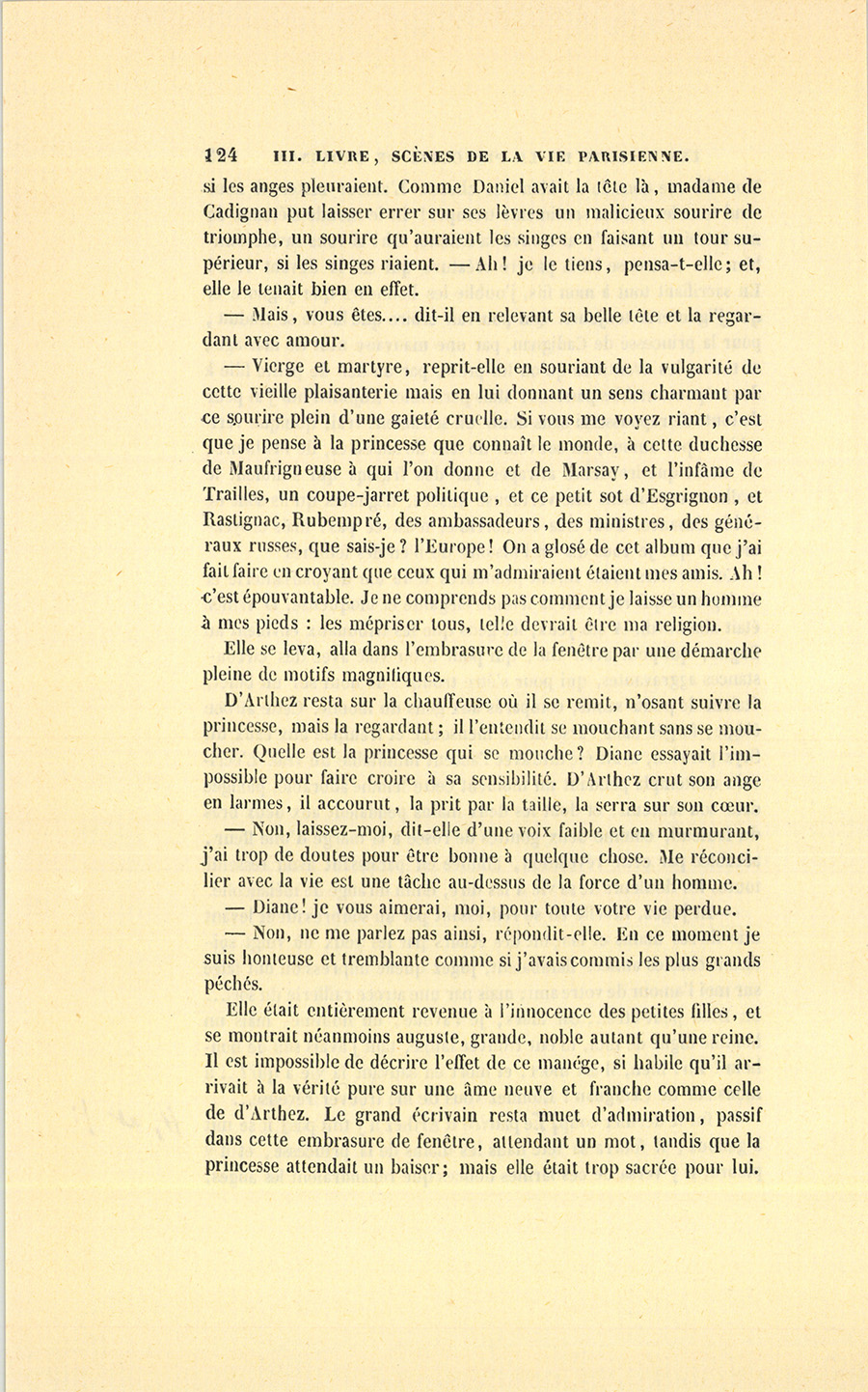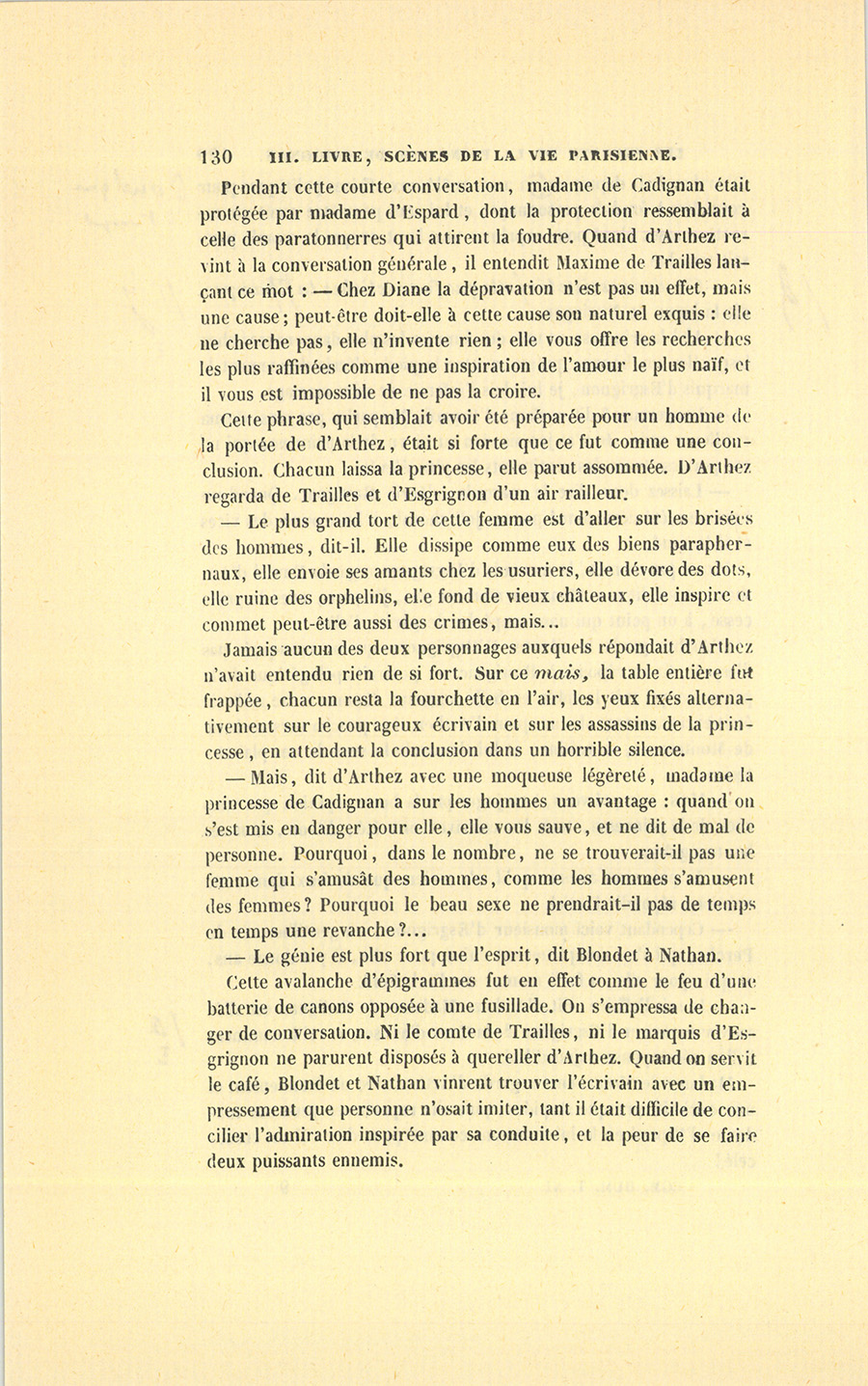 {p. 130} Pendant cette courte conversation, madame de Cadignan était protégée par madame d’Espard, dont la protection ressemblait à celle des paratonnerres qui attirent la foudre. Quand d’Arthez revint à la conversation générale, il entendit Maxime de Trailles lançant ce mot : – Chez Diane la dépravation n’est pas un effet, mais une cause ; peut-être doit-elle à cette cause son naturel exquis : elle ne cherche pas, elle n’invente rien ; elle vous offre les recherches les plus raffinées comme une inspiration de l’amour le plus naïf, et il vous est impossible de ne pas la croire.