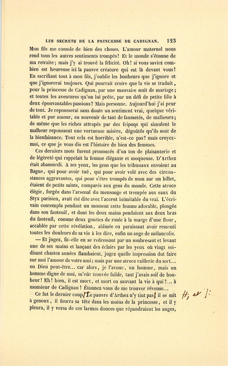 – Vous comprenez, mon ami, que je suis rentrée dans le monde avec éclat et pour y faire des éclats. J’ai subi là des luttes nouvelles, il a fallu conquérir mon indépendance et neutraliser monsieur de Maufrigneuse. J’ai donc mené par d’autres raisons une vie dissipée. Pour m’étourdir, pour oublier la vie réelle par une vie fantastique, j’ai brillé, j’ai donné des fêtes, j’ai fait la princesse, et j’ai fait des dettes. Chez moi, je m’oubliais dans le sommeil de la fatigue, je renaissais belle, gaie, folle pour le monde ; mais, à cette triste lutte de la fantaisie contre la réalité, j’ai mangé ma fortune. La révolte de 1830 est arrivée, au moment où je rencontrais au bout de cette existence des Mille et une Nuits l’amour saint et pur que (je suis franche !) je désirais connaître. Avouez-le ? n’était-ce pas naturel chez une femme dont le cœur comprimé par tant de causes et d’accidents se réveillait à l’âge où la femme se sent trompée, et où je voyais autour de moi tant de femmes heureuses par l’amour8 ? Ah ! pourquoi Michel Chrestien fut-il si respectueux ? Il y a eu là encore une raillerie pour moi. Que voulez-vous ? En tombant, j’ai tout perdu, je n’ai eu d’illusions sur rien ; j’avais tout pressé, hormis un seul fruit pour lequel je n’ai plus ni goût, ni dents. Enfin, je me suis trouvée désenchantée du monde quand il me fallait quitter le monde. Il y a là quelque chose de providentiel, comme dans les insensibilités qui nous préparent à la mort. (Elle fit un geste plein d’onction religieuse.) – Tout alors m’a servi, reprit-elle, les désastres de la monarchie et ses ruines m’ont aidée à m’ensevelir. {p. 123} Mon fils me console de bien des choses. L’amour maternel nous rend tous les autres sentiments trompés ! Et le monde s’étonne de ma retraite ; mais j’y ai trouvé la félicité. Oh ! si vous saviez combien est heureuse ici la pauvre créature qui est là devant vous ! En sacrifiant tout à mon fils, j’oublie les bonheurs que j’ignore et que j’ignorerai toujours. Qui pourrait croire que la vie se traduit, pour la princesse de Cadignan, par une mauvaise nuit de mariage ; et toutes les aventures qu’on lui prête, par un défi de petite fille à deux épouvantables passions ? Mais personne. Aujourd’hui j’ai peur de tout. Je repousserai sans doute un sentiment vrai, quelque véritable et pur amour, en souvenir de tant de faussetés, de malheurs ; de même que les riches attrapés par des fripons qui simulent le malheur repoussent une vertueuse misère, dégoûtés qu’ils sont de la bienfaisance. Tout cela est horrible, n’est-ce pas ? mais croyez-moi, ce que je vous dis est l’histoire de bien des femmes.