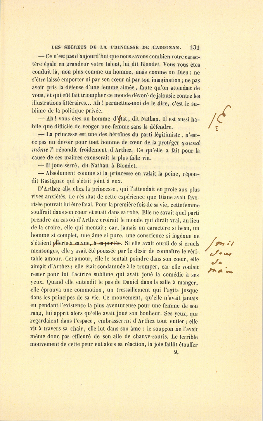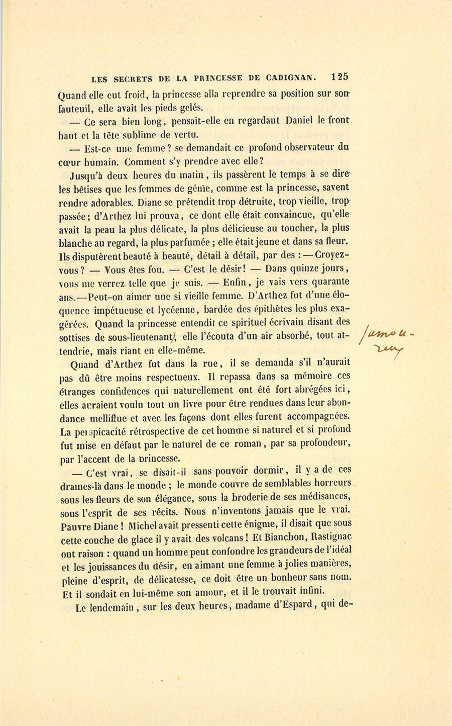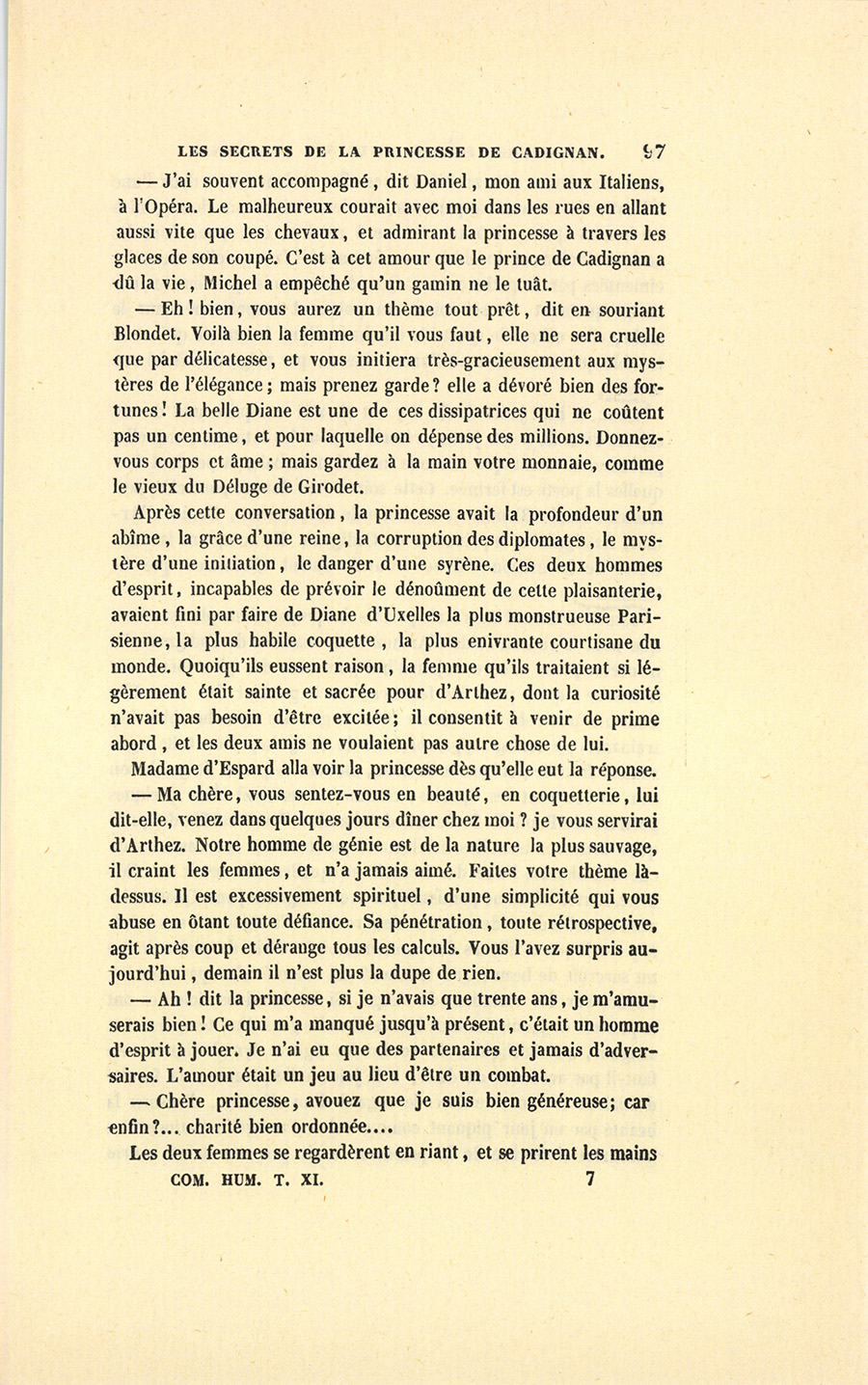 {p. 97} – J’ai souvent accompagné, dit Daniel, mon ami aux Italiens, à l’Opéra. Le malheureux courait avec moi dans les rues en allant aussi vite que les chevaux, et admirant la princesse à travers les glaces de son coupé. C’est à cet amour que le prince de Cadignan a dû la vie, Michel a empêché qu’un gamin ne le tuât.