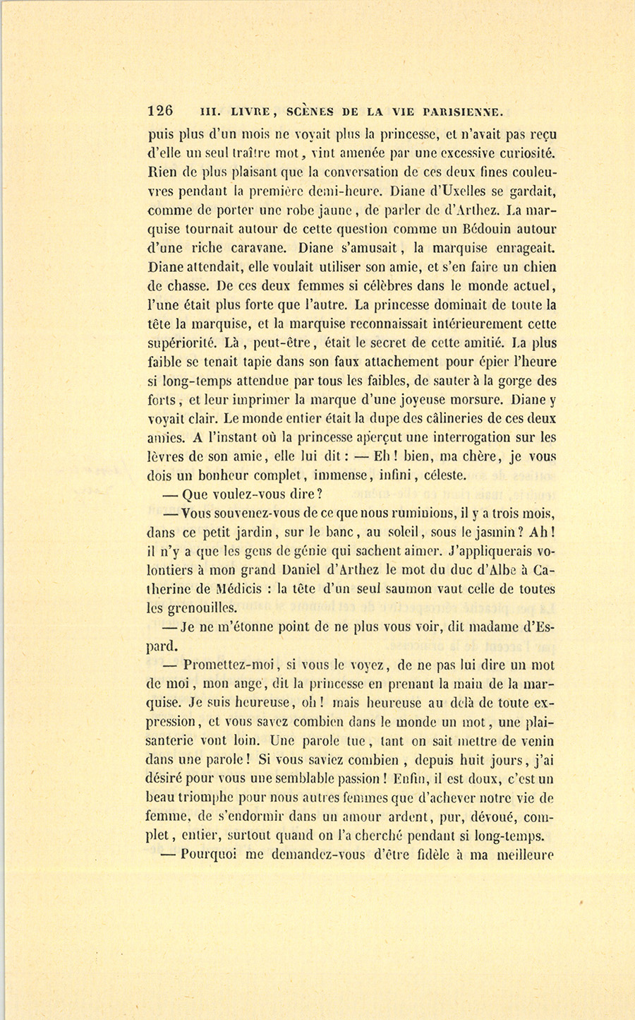 Le lendemain, sur les deux heures, madame d’Espard, qui {p. 126} depuis plus d’un mois ne voyait plus la princesse, et n’avait pas reçu d’elle un seul traître mot, vint amenée par une excessive curiosité. Rien de plus plaisant que la conversation de ces deux fines couleuvres pendant la première demi-heure. Diane d’Uxelles se gardait, comme de porter une robe jaune, de parler de d’Arthez. La marquise tournait autour de cette question comme un Bédouin autour d’une riche caravane. Diane s’amusait, la marquise enrageait. Diane attendait, elle voulait utiliser son amie, et s’en faire un chien de chasse. De ces deux femmes si célèbres dans le monde actuel, l’une était plus forte que l’autre. La princesse dominait de toute la tête la marquise, et la marquise reconnaissait intérieurement cette supériorité. Là, peut-être, était le secret de cette amitié. La plus faible se tenait tapie dans son faux attachement pour épier l’heure si long-temps attendue par tous les faibles, de sauter à la gorge des forts, et leur imprimer la marque d’une joyeuse morsure. Diane y voyait clair. Le monde entier était la dupe des câlineries de ces deux amies. À l’instant où la princesse aperçut une interrogation sur les lèvres de son amie, elle lui dit : – Eh ! bien, ma chère, je vous dois un bonheur complet, immense, infini, céleste.
