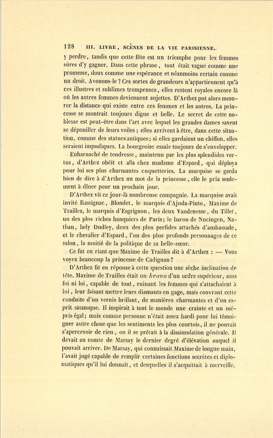 D’Arthez fit en réponse à cette question une sèche inclination de tête. Maxime de Trailles était un bravo d’un ordre supérieur, sans foi ni loi, capable de tout, ruinant les femmes qui s’attachaient à lui, leur faisant mettre leurs diamants en gage, mais couvrant cette conduite d’un vernis brillant, de manières charmantes et d’un esprit satanique. Il inspirait à tout le monde une crainte et un mépris égal ; mais comme personne n’était assez hardi pour lui témoigner autre chose que les sentiments les plus courtois, il ne pouvait s’apercevoir de rien, ou il se prêtait à la dissimulation générale. Il devait au comte de Marsay le dernier degré d’élévation auquel il pouvait arriver. De Marsay, qui connaissait Maxime de longue main, l’avait jugé capable de remplir certaines fonctions secrètes et diplomatiques qu’il lui donnait, et desquelles il s’acquittait à merveille. {p. 129} D’Arthez était depuis quelque temps assez mêlé aux affaires politiques pour connaître à fond le personnage, et lui seul peut-être avait un caractère assez élevé pour exprimer tout haut ce que le monde pensait tout bas.