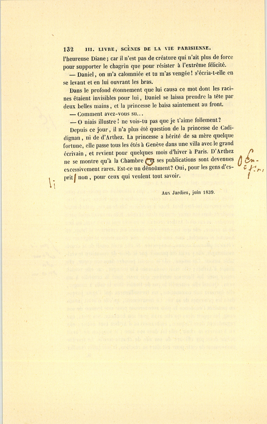Depuis ce jour, il n’a plus été question de la princesse de Cadignan, ni de d’Arthez. La princesse a hérité de sa mère quelque fortune, elle passe tous les étés à Genève dans une villa avec le grand écrivain, et revient pour quelques mois d’hiver à Paris. D’Arthez ne se montre qu’à la Chambre. Enfin ses publications sont devenues excessivement rares. Est-ce un dénoûment ? Oui, pour les gens d’esprit ; non, pour ceux qui veulent tout savoir.