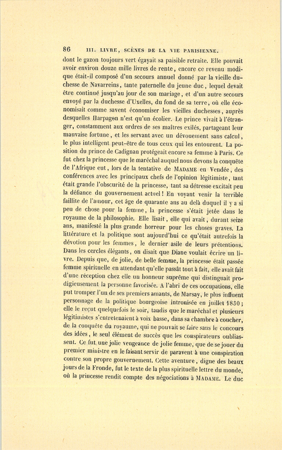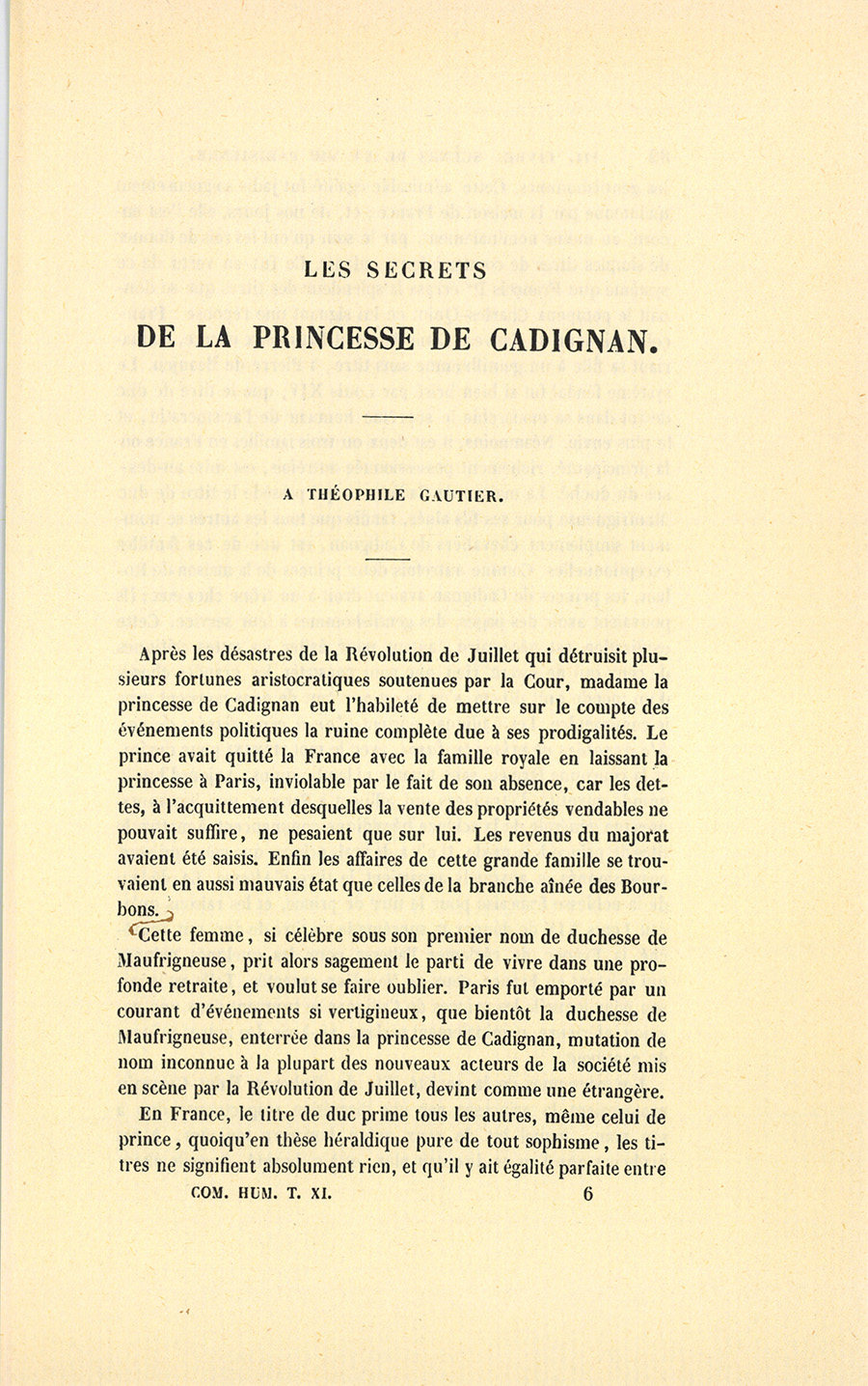 Après les désastres de la Révolution de Juillet qui détruisit plusieurs fortunes aristocratiques soutenues par la Cour, madame la princesse de Cadignan eut l’habileté de mettre sur le compte des événements politiques la ruine complète due à ses prodigalités. Le prince avait quitté la France avec la famille royale en laissant la princesse à Paris, inviolable par le fait de son absence, car les dettes, à l’acquittement desquelles la vente des propriétés vendables ne pouvait suffire, ne pesaient que sur lui. Les revenus du majorat avaient été saisis. Enfin les affaires de cette grande famille se trouvaient en aussi mauvais état que celles de la branche aînée des Bourbons. Cette femme, si célèbre sous son premier nom de duchesse de Maufrigneuse, prit alors sagement le parti de vivre dans une profonde retraite, et voulut se faire oublier. Paris fut emporté par un courant d’événements si vertigineux, que bientôt la duchesse de Maufrigneuse, enterrée dans la princesse de Cadignan, mutation de nom inconnue à la plupart des nouveaux acteurs de la société mis en scène par la Révolution de Juillet, devint comme une étrangère.