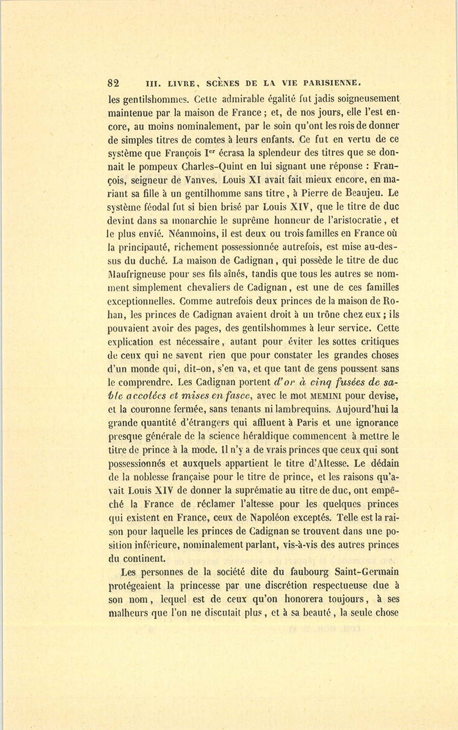 En France, le titre de duc prime tous les autres, même celui de prince, quoiqu’en thèse héraldique pure de tout sophisme, les titres ne signifient absolument rien, et qu’il y ait égalité parfaite entre {p. 82} les gentilshommes. Cette admirable égalité fut jadis soigneusement maintenue par la maison de France ; et, de nos jours, elle l’est encore, au moins nominalement, par le soin qu’ont les rois de donner de simples titres de comtes à leurs enfants. Ce fut en vertu de ce système que François Ier écrasa la splendeur des titres que se donnait le pompeux Charles-Quint en lui signant une réponse : François, seigneur de Vanves. Louis XI avait fait mieux encore, en mariant sa fille à un gentilhomme sans titre, à Pierre de Beaujeu. Le système féodal fut si bien brisé par Louis XIV, que le titre de duc devint dans sa monarchie le suprême honneur de l’aristocratie, et le plus envié. Néanmoins, il est deux ou trois familles en France où la principauté, richement possessionnée autrefois, est mise au-dessus du duché. La maison de Cadignan, qui possède le titre de duc Maufrigneuse pour ses fils aînés, tandis que tous les autres se nomment simplement chevaliers de Cadignan, est une de ces familles exceptionnelles. Comme autrefois deux princes de la maison de Rohan, les princes de Cadignan avaient droit à un trône chez eux ; ils pouvaient avoir des pages, des gentilshommes à leur service. Cette explication est nécessaire, autant pour éviter les sottes critiques de ceux qui ne savent rien que pour constater les grandes choses d’un monde qui, dit-on, s’en va, et que tant de gens poussent sans le comprendre. Les Cadignan portent d’or à cinq fusées de sable accolées et mises en fasce, avec le mot memini pour devise, et la couronne fermée, sans tenants ni lambrequins. Aujourd’hui la grande quantité d’étrangers qui affluent à Paris et une ignorance presque générale de la science héraldique commencent à mettre le titre de prince à la mode. Il n’y a de vrais princes que ceux qui sont possessionnés et auxquels appartient le titre d’Altesse. Le dédain de la noblesse française pour le titre de prince, et les raisons qu’avait Louis XIV de donner la suprématie au titre de duc, ont empêché la France de réclamer l’altesse pour les quelques princes qui existent en France, ceux de Napoléon exceptés. Telle est la raison pour laquelle les princes de Cadignan se trouvent dans une position inférieure, nominalement parlant, vis-à-vis des autres princes du continent.