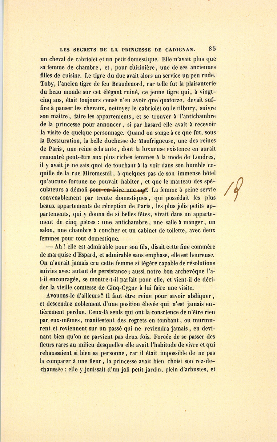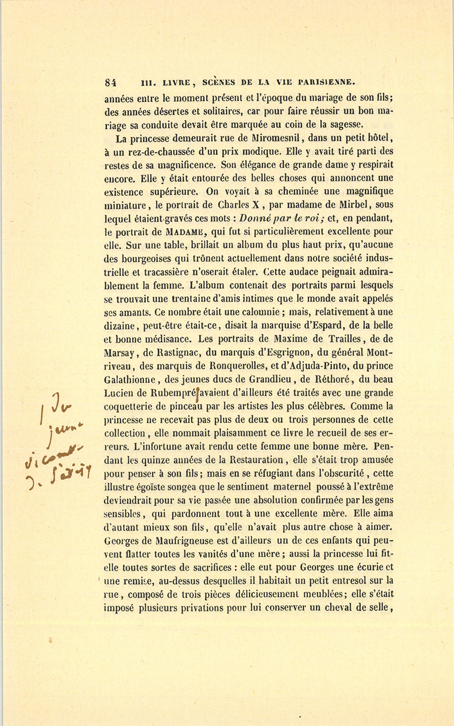 La princesse demeurait rue de Miromesnil, dans un petit hôtel, à un rez-de-chaussée d’un prix modique. Elle y avait tiré parti des restes de sa magnificence. Son élégance de grande dame y respirait encore. Elle y était entourée des belles choses qui annoncent une existence supérieure. On voyait à sa cheminée une magnifique miniature, le portrait de Charles X, par madame de Mirbel, sous lequel étaient gravés ces mots : Donné par le roi ; et, en pendant, le portrait de Madame, qui fut si particulièrement excellente pour elle. Sur une table, brillait un album du plus haut prix, qu’aucune des bourgeoises qui trônent actuellement dans notre société industrielle et tracassière n’oserait étaler. Cette audace peignait admirablement la femme. L’album contenait des portraits parmi lesquels se trouvait une trentaine d’amis intimes que le monde avait appelés ses amants. Ce nombre était une calomnie ; mais, relativement à une dizaine, peut-être était-ce, disait la marquise d’Espard, de la belle et bonne médisance. Les portraits de Maxime de Trailles, de de Marsay, de Rastignac, du marquis d’Esgrignon, du général Montriveau, des marquis de Ronquerolles et d’Ajuda-Pinto1, du prince Galathionne, des jeunes ducs de Grandlieu, de Rhétoré2, du beau Lucien de Rubempré, du jeune vicomte de Sérizy avaient d’ailleurs été traités avec une grande coquetterie de pinceau par les artistes les plus célèbres. Comme la princesse ne recevait pas plus de deux ou trois personnes de cette collection, elle nommait plaisamment ce livre le recueil de ses erreurs. L’infortune avait rendu cette femme une bonne mère. Pendant les quinze années de la Restauration, elle s’était trop amusée pour penser à son fils ; mais en se réfugiant dans l’obscurité, cette illustre égoïste songea que le sentiment maternel poussé à l’extrême deviendrait pour sa vie passée une absolution confirmée par les gens sensibles, qui pardonnent tout à une excellente mère. Elle aima d’autant mieux son fils, qu’elle n’avait plus autre chose à aimer. Georges de Maufrigneuse est d’ailleurs un de ces enfants qui peuvent flatter toutes les vanités d’une mère ; aussi la princesse lui fit-elle toutes sortes de sacrifices : elle eut pour Georges une écurie et une remise, au-dessus desquelles il habitait un petit entresol sur la rue, composé de trois pièces délicieusement meublées ; elle s’était imposé plusieurs privations pour lui conserver un cheval de selle, {p. 85} un cheval de cabriolet et un petit domestique. Elle n’avait plus que sa femme de chambre, et, pour cuisinière, une de ses anciennes filles de cuisine. Le tigre du duc avait alors un service un peu rude. Toby, l’ancien tigre de feu Beaudenord, car telle fut la plaisanterie du beau monde sur cet élégant ruiné, ce jeune tigre qui, à vingt-cinq ans, était toujours censé n’en avoir que quatorze, devait suffire à panser les chevaux, nettoyer le cabriolet ou le tilbury, suivre son maître, faire les appartements, et se trouver à l’antichambre de la princesse pour annoncer, si par hasard elle avait à recevoir la visite de quelque personnage. Quand on songe à ce que fut, sous la Restauration, la belle duchesse de Maufrigneuse, une des reines de Paris, une reine éclatante, dont la luxueuse existence en aurait remontré peut-être aux plus riches femmes à la mode de Londres, il y avait je ne sais quoi de touchant à la voir dans son humble coquille de la rue Miromesnil, à quelques pas de son immense hôtel qu’aucune fortune ne pouvait habiter, et que le marteau des spéculateurs a démoli. La femme à peine servie convenablement par trente domestiques, qui possédait les plus beaux appartements de réception de Paris, les plus jolis petits appartements, qui y donna de si belles fêtes, vivait dans un appartement de cinq pièces : une antichambre, une salle à manger, un salon, une chambre à coucher et un cabinet de toilette, avec deux femmes pour tout domestique.