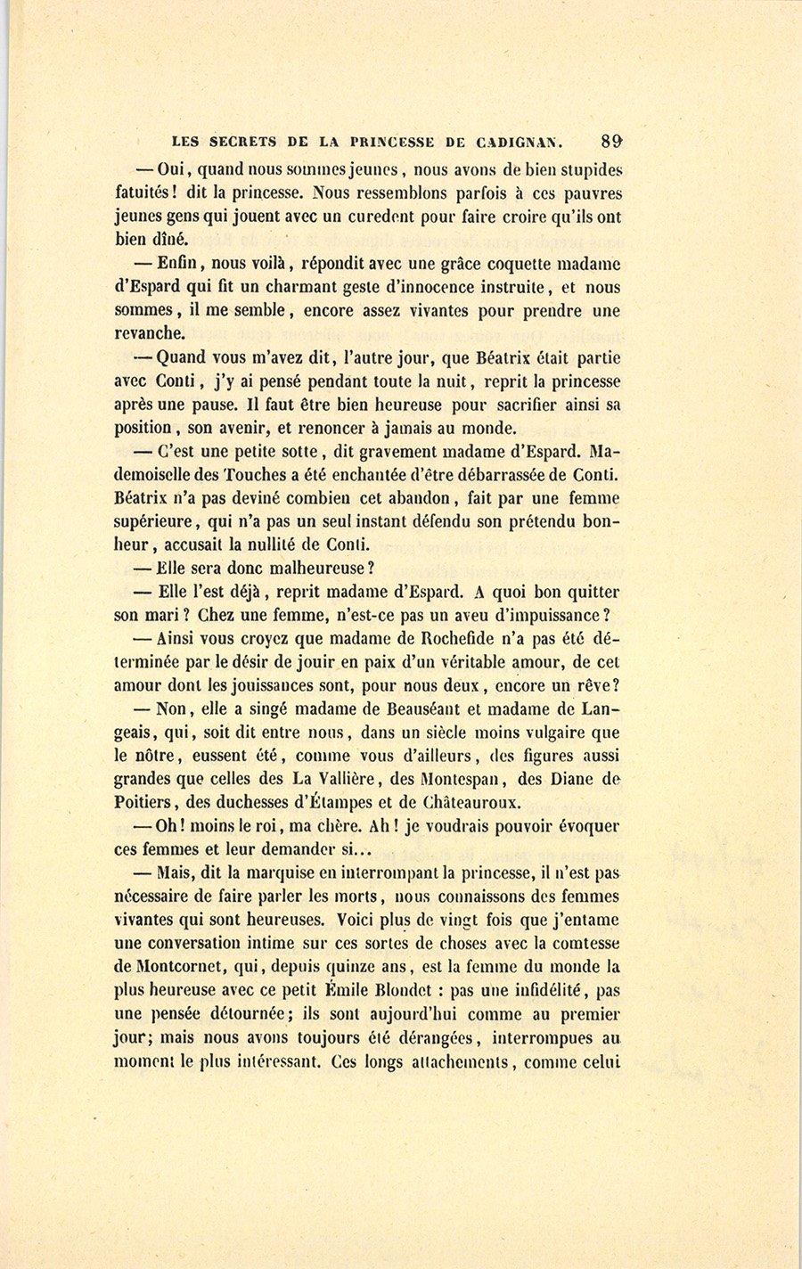 – Mais, dit la marquise en interrompant la princesse, il n’est pas nécessaire de faire parler les morts, nous connaissons des femmes vivantes qui sont heureuses. Voici plus de vingt fois que j’entame une conversation intime sur ces sortes de choses avec la comtesse de Montcornet, qui, depuis quinze ans, est la femme du monde la plus heureuse avec ce petit Émile Blondet : pas une infidélité, pas une pensée détournée ; ils sont aujourd’hui comme au premier jour ; mais nous avons toujours été dérangées, interrompues au moment le plus intéressant. Ces longs attachements, comme celui {p. 90} de Rastignac et de madame de Nucingen, de madame de Camps, votre cousine, pour son Octave, ont un secret, et ce secret nous l’ignorons, ma chère. Le monde nous fait l’extrême honneur de nous prendre pour des rouées dignes de la cour du Régent, et nous sommes innocentes comme deux petites pensionnaires.