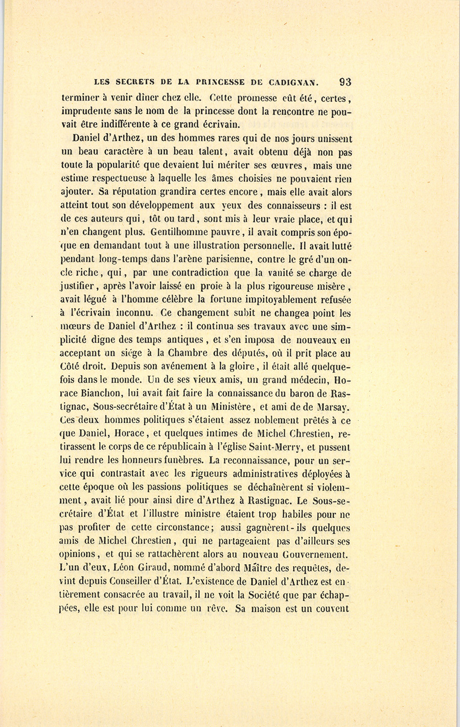 Cette petite guerre amicale durait depuis quelques mois entre Daniel et ses amis, quand madame d’Espard pria Rastignac et Blondet de déterminer d’Arthez à venir dîner chez elle, en leur disant que la princesse de Cadignan avait un excessif désir de voir cet homme célèbre. Ces sortes de curiosités sont, pour certaines femmes, ce qu’est la lanterne magique pour les enfants, un plaisir pour les yeux, assez pauvre d’ailleurs, et plein de désenchantement. Plus un homme d’esprit excite de sentiments à distance, moins il y répondra de près ; plus il a été rêvé brillant, plus terne il sera. Sous ce rapport, la curiosité déçue va souvent jusqu’à l’injustice. Ni Blondet ni Rastignac ne pouvaient tromper d’Arthez, mais ils lui dirent en riant qu’il s’offrait pour lui la plus séduisante occasion de se décrasser le cœur et de connaître les suprêmes délices que donnait l’amour d’une grande dame parisienne. La princesse était positivement éprise de lui, il n’avait rien à craindre, il avait tout à gagner dans cette entrevue ; il lui serait impossible de descendre du piédestal où madame de Cadignan l’avait élevé. Blondet ni Rastignac ne virent aucun inconvénient à prêter cet amour à la princesse, elle pouvait porter cette calomnie, elle dont le passé donnait lieu à tant d’anecdotes. L’un et l’autre, ils se mirent à raconter à d’Arthez les aventures de la duchesse de Maufrigneuse : ses premières légèretés avec de Marsay, ses secondes inconséquences avec d’Ajuda qu’elle avait diverti de sa femme en vengeant ainsi madame de Beauséant, sa troisième liaison avec le jeune d’Esgrignon qui l’avait accompagnée en Italie et s’était horriblement compromis pour elle ; puis combien elle avait été malheureuse avec un célèbre ambassadeur, heureuse avec un général russe ; comment elle avait été l’Égérie de deux Ministres des Affaires étrangères, etc. D’Arthez leur dit qu’il en avait su plus qu’ils ne pouvaient lui en dire sur elle par leur pauvre ami, Michel Chrestien, qui l’avait adorée en secret pendant quatre années, et avait failli en devenir fou.