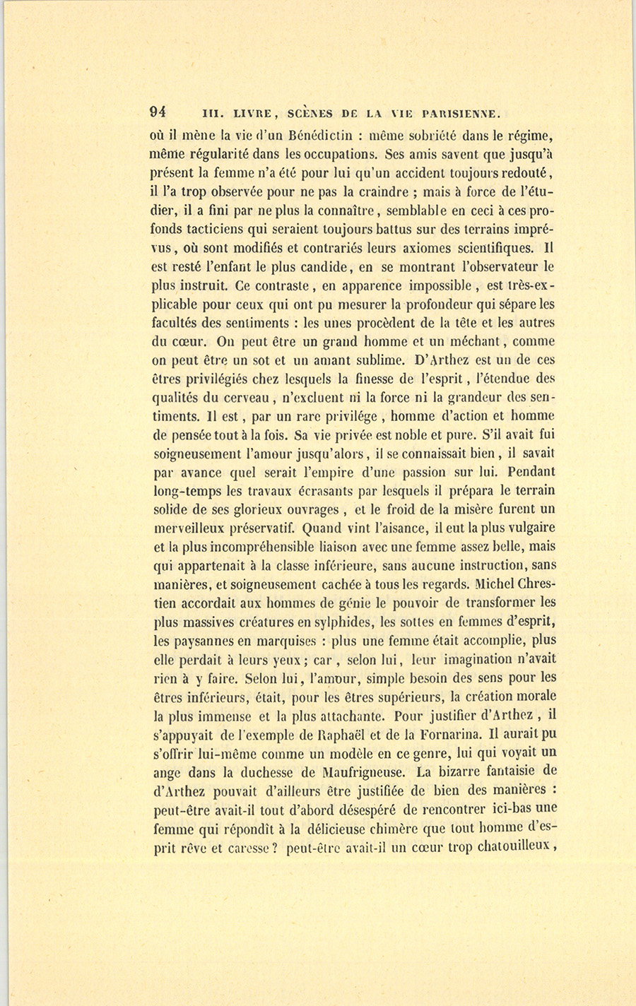 Daniel d’Arthez, un des hommes rares qui de nos jours unissent un beau caractère à un beau talent, avait obtenu déjà non pas toute la popularité que devaient lui mériter ses œuvres, mais une estime respectueuse à laquelle les âmes choisies ne pouvaient rien ajouter. Sa réputation grandira certes encore, mais elle avait alors atteint tout son développement aux yeux des connaisseurs : il est de ces auteurs qui, tôt ou tard, sont mis à leur vraie place, et qui n’en changent plus. Gentilhomme pauvre, il avait compris son époque en demandant tout à une illustration personnelle. Il avait lutté pendant long-temps dans l’arène parisienne, contre le gré d’un oncle riche, qui, par une contradiction que la vanité se charge de justifier, après l’avoir laissé en proie à la plus rigoureuse misère, avait légué à l’homme célèbre la fortune impitoyablement refusée à l’écrivain inconnu. Ce changement subit ne changea point les mœurs de Daniel d’Arthez : il continua ses travaux avec une simplicité digne des temps antiques, et s’en imposa de nouveaux en acceptant un siège à la Chambre des députés, où il prit place au Côté droit. Depuis son avènement à la gloire, il était allé quelquefois dans le monde. Un de ses vieux amis, un grand médecin, Horace Bianchon, lui avait fait faire la connaissance du baron de Rastignac, Sous-secrétaire d’État à un Ministère, et ami de de Marsay. Ces deux hommes politiques s’étaient assez noblement prêtés à ce que Daniel, Horace, et quelques intimes de Michel Chrestien, retirassent le corps de ce républicain à l’église Saint-Merry, et pussent lui rendre les honneurs funèbres. La reconnaissance, pour un service qui contrastait avec les rigueurs administratives déployées à cette époque où les passions politiques se déchaînèrent si violemment, avait lié pour ainsi dire d’Arthez à Rastignac. Le Sous-secrétaire d’État et l’illustre ministre étaient trop habiles pour ne pas profiter de cette circonstance ; aussi gagnèrent-ils quelques amis de Michel Chrestien, qui ne partageaient pas d’ailleurs ses opinions, et qui se rattachèrent alors au nouveau Gouvernement. L’un d’eux, Léon Giraud, nommé d’abord Maître des requêtes, devint depuis Conseiller d’État. L’existence de Daniel d’Arthez est entièrement consacrée au travail, il ne voit la Société que par échappées, elle est pour lui comme un rêve. Sa maison est un couvent {p. 94} où il mène la vie d’un Bénédictin : même sobriété dans le régime, même régularité dans les occupations. Ses amis savent que jusqu’à présent la femme n’a été pour lui qu’un accident toujours redouté, il l’a trop observée pour ne pas la craindre ; mais à force de l’étudier, il a fini par ne plus la connaître, semblable en ceci à ces profonds tacticiens qui seraient toujours battus sur des terrains imprévus, où sont modifiés et contrariés leurs axiomes scientifiques. Il est resté l’enfant le plus candide, en se montrant l’observateur le plus instruit. Ce contraste, en apparence impossible, est très-explicable pour ceux qui ont pu mesurer la profondeur qui sépare les facultés des sentiments : les unes procèdent de la tête et les autres du cœur. On peut être un grand homme et un méchant, comme on peut être un sot et un amant sublime. D’Arthez est un de ces êtres privilégiés chez lesquels la finesse de l’esprit, l’étendue des qualités du cerveau, n’excluent ni la force ni la grandeur des sentiments. Il est, par un rare privilège, homme d’action et homme de pensée tout à la fois. Sa vie privée est noble et pure. S’il avait fui soigneusement l’amour jusqu’alors, il se connaissait bien, il savait par avance quel serait l’empire d’une passion sur lui. Pendant long-temps les travaux écrasants par lesquels il prépara le terrain solide de ses glorieux ouvrages, et le froid de la misère furent un merveilleux préservatif. Quand vint l’aisance, il eut la plus vulgaire et la plus incompréhensible liaison avec une femme assez belle, mais qui appartenait à la classe inférieure, sans aucune instruction, sans manières, et soigneusement cachée à tous les regards. Michel Chrestien accordait aux hommes de génie le pouvoir de transformer les plus massives créatures en sylphides, les sottes en femmes d’esprit, les paysannes en marquises : plus une femme était accomplie, plus elle perdait à leurs yeux ; car, selon lui, leur imagination n’avait rien à y faire. Selon lui, l’amour, simple besoin des sens pour les êtres inférieurs, était, pour les êtres supérieurs, la création morale la plus immense et la plus attachante. Pour justifier d’Arthez, il s’appuyait de l’exemple de Raphaël et de la Fornarina. Il aurait pu s’offrir lui-même comme un modèle en ce genre, lui qui voyait un ange dans la duchesse de Maufrigneuse. La bizarre fantaisie de d’Arthez pouvait d’ailleurs être justifiée de bien des manières : peut-être avait-il tout d’abord désespéré de rencontrer ici-bas une femme qui répondît à la délicieuse chimère que tout homme d’esprit rêve et caresse ? peut-être avait-il un cœur trop chatouilleux, {p. 95} trop délicat pour le livrer à une femme du monde ? peut-être aimait-il mieux faire la part à la Nature et garder ses illusions en cultivant son Idéal ? peut-être avait-il écarté l’amour comme incompatible avec ses travaux, avec la régularité d’une vie monacale où la passion eût tout dérangé. Depuis quelques mois, d’Arthez était l’objet des railleries de Blondet et de Rastignac qui lui reprochaient de ne connaître ni le monde ni les femmes. À les entendre, ses œuvres étaient assez nombreuses et assez avancées pour qu’il se permît des distractions : il avait une belle fortune et vivait comme un étudiant ; il ne jouissait de rien, ni de son or ni de sa gloire ; il ignorait les exquises jouissan