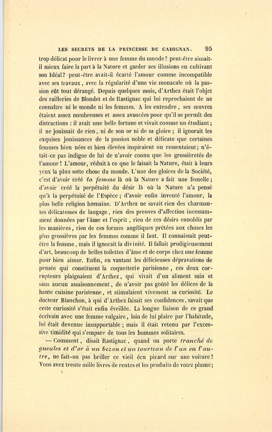– Comment, disait Rastignac, quand on porte tranché de gueules et d’or à un bezan et un tourteau de l’un en l’autre, ne fait-on pas briller ce vieil écu picard sur une voiture ? Vous avez trente mille livres de rentes et les produits de votre plume ; {p. 96} vous avez justifié votre devise, qui forme le calembour tant recherché par nos ancêtres : ars, thesaurusque virtus, et vous ne le promenez pas au bois de Boulogne ! Nous sommes dans un siècle où la vertu doit se montrer.
