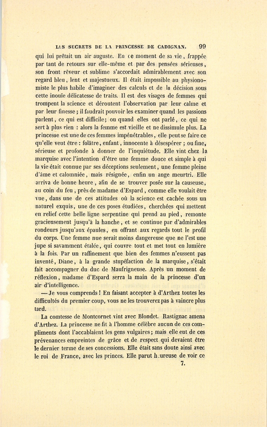 Les deux femmes se regardèrent en riant, et se prirent les mains {p. 98} en se les serrant avec amitié. Certes elles avaient toutes deux l’une à l’autre des secrets importants, et n’en étaient sans doute, ni à un homme près, ni à un service à rendre ; car, pour faire les amitiés sincères et durables entre femmes, il faut qu’elles aient été cimentées par de petits crimes. Quand deux amies peuvent se tuer réciproquement, et se voient un poignard empoisonné dans la main, elles offrent le spectacle touchant d’une harmonie qui ne se trouble qu’au moment où l’une d’elles a, par mégarde, lâché son arme. Donc, à huit jours de là, il y eut chez la marquise une de ces soirées dites de petits jours, réservées pour les intimes, auxquelles personne ne vient que sur une invitation verbale, et pendant lesquelles la porte est fermée. Cette soirée était donnée pour cinq personnes : Émile Blondet et madame de Montcornet, Daniel d’Arthez, Rastignac et la princesse de Cadignan. En comptant la maîtresse de la maison, il se trouvait autant d’hommes que de femmes. Jamais le hasard ne s’était permis de préparations plus savantes que pour la rencontre de d’Arthez et de madame de Cadignan. La princesse passe encore aujourd’hui pour une des plus fortes sur la toilette, qui, pour les femmes, est le premier des Arts. [ill.] Elle avait mis une robe de velours bleu à grandes manches blanches traînantes, à corsage apparent, une de ces guimpes en tulle légèrement froncée, et bordée de bleu, montant à quatre doigts de son cou, et couvrant les épaules, comme on en voit dans quelques portraits de Raphaël. Sa femme de chambre l’avait coiffée de quelques bruyères blanches habilement posées dans ses cascades de cheveux blonds, l’une des beautés auxquelles elle devait sa célébrité. Certes Diane ne paraissait pas avoir vingt-cinq ans. Quatre années de solitude et de repos avaient rendu de la vigueur à son teint. N’y a-t-il pas d’ailleurs des moments où le désir de plaire donne un surcroît de beauté aux femmes ? La volonté n’est pas sans influence sur les variations du visage. Si les émotions violentes ont le pouvoir de jaunir les tons blancs chez les gens d’un tempérament sanguin, mélancolique, de verdir les figures lymphatiques, ne faut-il pas accorder au désir, à la joie, à l’espérance, la faculté d’éclaircir le teint, de dorer le regard d’un vif éclat, d’animer la beauté par un jour piquant comme celui d’une jolie matinée ? La blancheur si célèbre de la princesse avait pris une teinte mûrie {p. 99} qui lui prêtait un air auguste. En ce moment de sa vie, frappée par tant de retours sur elle-même et par des pensées sérieuses, son front rêveur et sublime s’accordait admirablement avec son regard bleu, lent et majestueux. Il était impossible au physionomiste le plus habile d’imaginer des calculs et de la décision sous cette inouïe délicatesse de traits. Il est des visages de femmes qui trompent la science et déroutent l’observation par leur calme et par leur finesse ; il faudrait pouvoir les examiner quand les passions parlent, ce qui est difficile ; ou quand elles ont parlé, ce qui ne sert plus à rien5 : alors la femme est vieille et ne dissimule plus. La princesse est une de ces femmes impénétrables, elle peut se faire ce qu’elle veut être : folâtre, enfant, innocente à désespérer ; ou fine, sérieuse et profonde à donner de l’inquiétude. Elle vint chez la marquise avec l’intention d’être une femme douce et simple à qui la vie était connue par ses déceptions seulement, une femme pleine d’âme et calomniée, mais résignée, enfin un ange meurtri. Elle arriva de bonne heure, afin de se trouver posée sur la causeuse, au coin du feu, près de madame d’Espard, comme elle voulait être vue, dans une de ces attitudes où la science est cachée sous un naturel exquis, une de ces poses étudiées, cherchées qui mettent en relief cette belle ligne serpentine qui prend au pied, remonte gracieusement jusqu’à la hanche, et se continue par d’admirables rondeurs jusqu’aux épaules, en offrant aux regards tout le profil du corps. Une femme nue serait moins dangereuse que ne l’est une jupe si savamment étalée, qui couvre tout et met tout en lumière à la fois. Par un raffinement que bien des femmes n’eussent pas inventé, Diane, à la grande stupéfaction de la marquise, s’était fait accompagner du duc de Maufrigneuse. Après un moment de réflexion, madame d’Espard serra la main de la princesse d’un air d’intelligence.