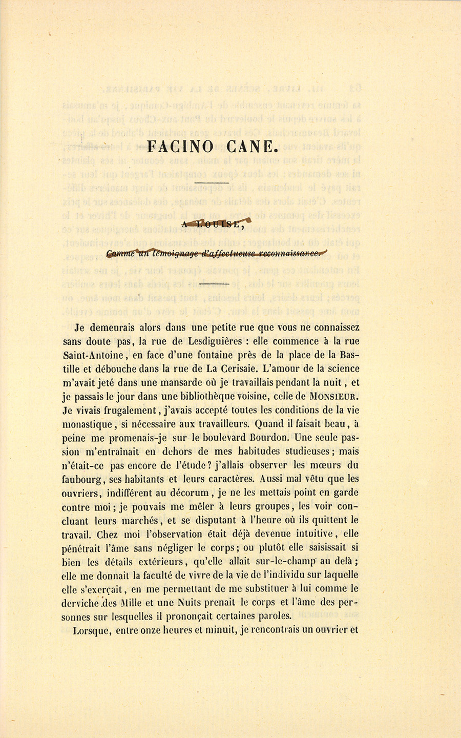 {p. 61} Je demeurais alors dans une petite rue que vous ne connaissez sans doute pas, la rue de Lesdiguières : elle commence à la rue Saint-Antoine, en face d’une fontaine près de la place de la Bastille et débouche dans la rue de La Cerisaie. L’amour de la science m’avait jeté dans une mansarde où je travaillais pendant la nuit, et je passais le jour dans une bibliothèque voisine, celle de Monsieur. Je vivais frugalement, j’avais accepté toutes les conditions de la vie monastique, si nécessaire aux travailleurs. Quand il faisait beau, à peine me promenais-je sur le boulevard Bourdon. Une seule passion m’entraînait en dehors de mes habitudes studieuses ; mais n’était-ce pas encore de l’étude ? j’allais observer les mœurs du faubourg, ses habitants et leurs caractères. Aussi mal vêtu que les ouvriers, indifférent au décorum, je ne les mettais point en garde contre moi ; je pouvais me mêler à leurs groupes, les voir concluant leurs marchés, et se disputant à l’heure où ils quittent le travail. Chez moi l’observation était déjà devenue intuitive, elle pénétrait l’âme sans négliger le corps ; ou plutôt elle saisissait si bien les détails extérieurs, qu’elle allait sur-le-champ au delà ; elle me donnait la faculté de vivre de la vie de l’individu sur laquelle elle s’exerçait, en me permettant de me substituer à lui comme le derviche des Mille et une Nuits prenait le corps et l’âme des personnes sur lesquelles il prononçait certaines paroles.