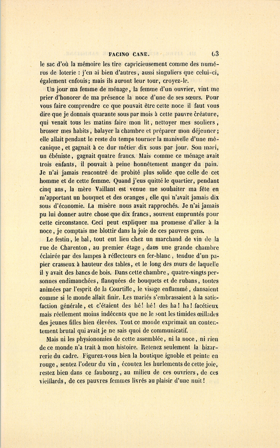 Le festin, le bal, tout eut lieu chez un marchand de vin de la rue de Charenton, au premier étage, dans une grande chambre éclairée par des lampes à réflecteurs en fer-blanc, tendue d’un papier crasseux à hauteur des tables, et le long des murs de laquelle il y avait des bancs de bois. Dans cette chambre, quatre-vingts personnes endimanchées, flanquées de bouquets et de rubans, toutes animées par l’esprit de la Courtille, le visage enflammé, dansaient comme si le monde allait finir. Les mariés s’embrassaient à la satisfaction générale, et c’étaient des hé ! hé ! des ha ! ha ! facétieux mais réellement moins indécents que ne le sont les timides œillades des jeunes filles bien élevées. Tout ce monde exprimait un contentement brutal qui avait je ne sais quoi de communicatif.
