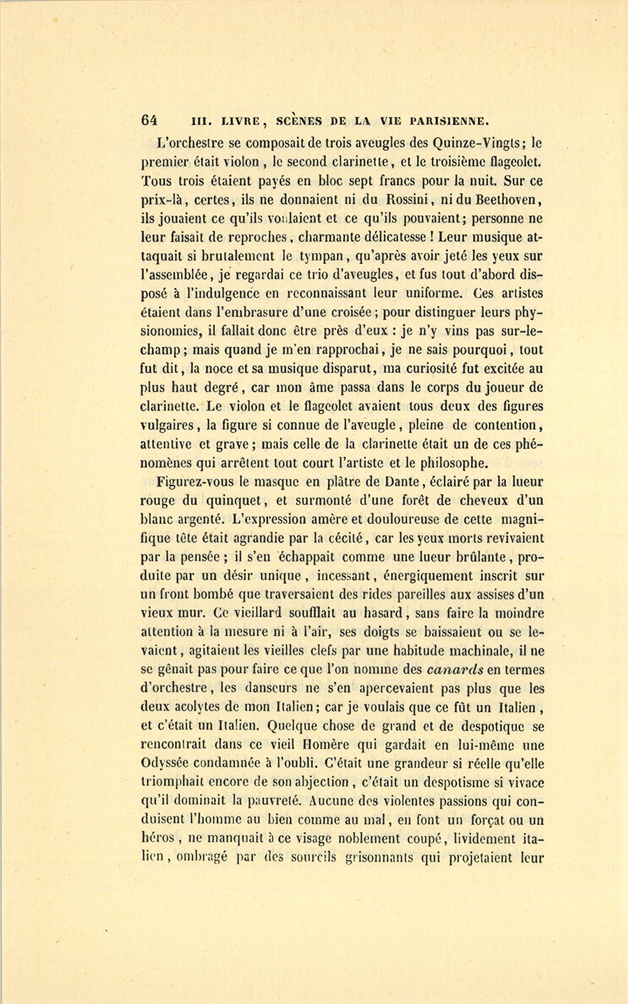 {p. 64} L’orchestre se composait de trois aveugles des Quinze-Vingts ; le premier était violon, le second clarinette, et le troisième flageolet. Tous trois étaient payés en bloc sept francs pour la nuit. Sur ce prix-là, certes, ils ne donnaient ni du Rossini, ni du Beethoven, ils jouaient ce qu’ils voulaient et ce qu’ils pouvaient ; personne ne leur faisait de reproches, charmante délicatesse ! Leur musique attaquait si brutalement le tympan, qu’après avoir jeté les yeux sur l’assemblée, je regardai ce trio d’aveugles, et fus tout d’abord disposé à l’indulgence en reconnaissant leur uniforme. Ces artistes étaient dans l’embrasure d’une croisée ; pour distinguer leurs physionomies, il fallait donc être près d’eux : je n’y vins pas sur-le-champ ; mais quand je m’en rapprochai, je ne sais pourquoi, tout fut dit, la noce et sa musique disparut, ma curiosité fut excitée au plus haut degré, car mon âme passa dans le corps du joueur de clarinette. Le violon et le flageolet avaient tous deux des figures vulgaires, la figure si connue de l’aveugle, pleine de contention, attentive et grave ; mais celle de la clarinette était un de ces phénomènes qui arrêtent tout court l’artiste et le philosophe.