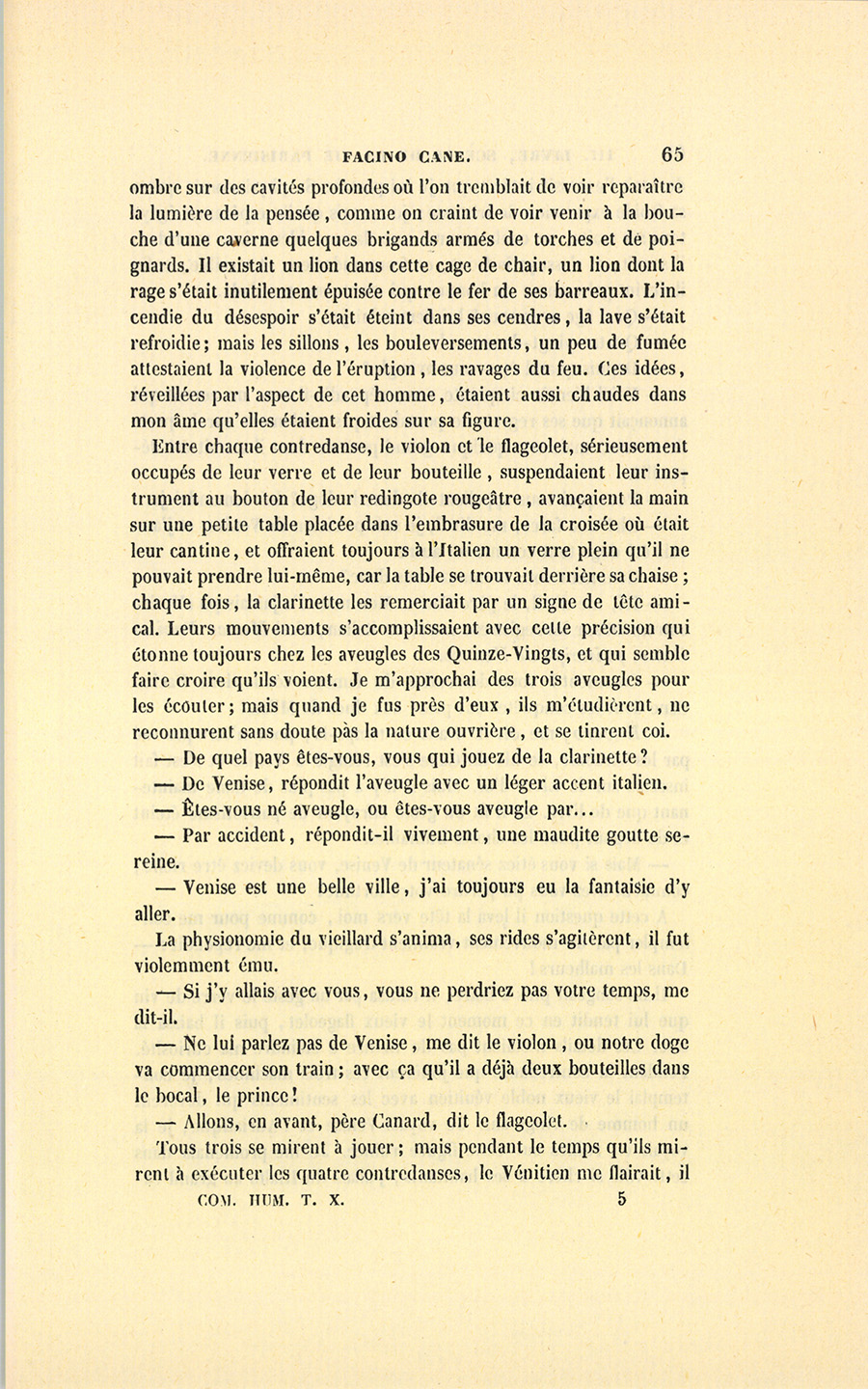 Tous trois se mirent à jouer ; mais pendant le temps qu’ils mirent à exécuter les quatre contredanses, le Vénitien me flairait, il {p. 66} devinait l’excessif intérêt que je lui portais. Sa physionomie quitta sa froide expression de tristesse ; je ne sais quelle espérance égaya tous ses traits, se coula comme une flamme bleue dans ses rides ; il sourit, et s’essuya le front, ce front audacieux et terrible ; enfin il devint gai comme un homme qui monte sur son dada.