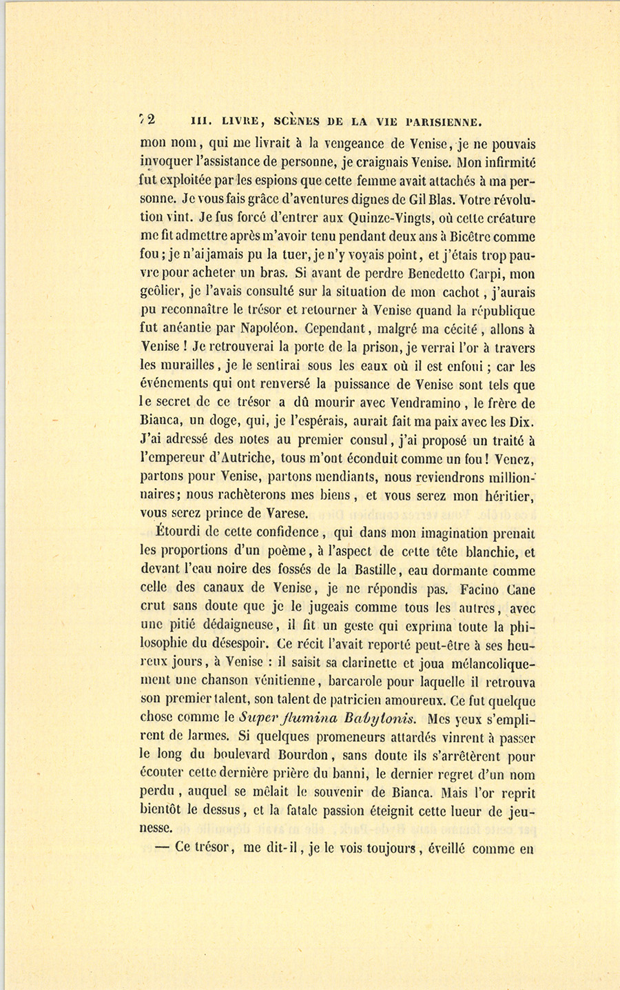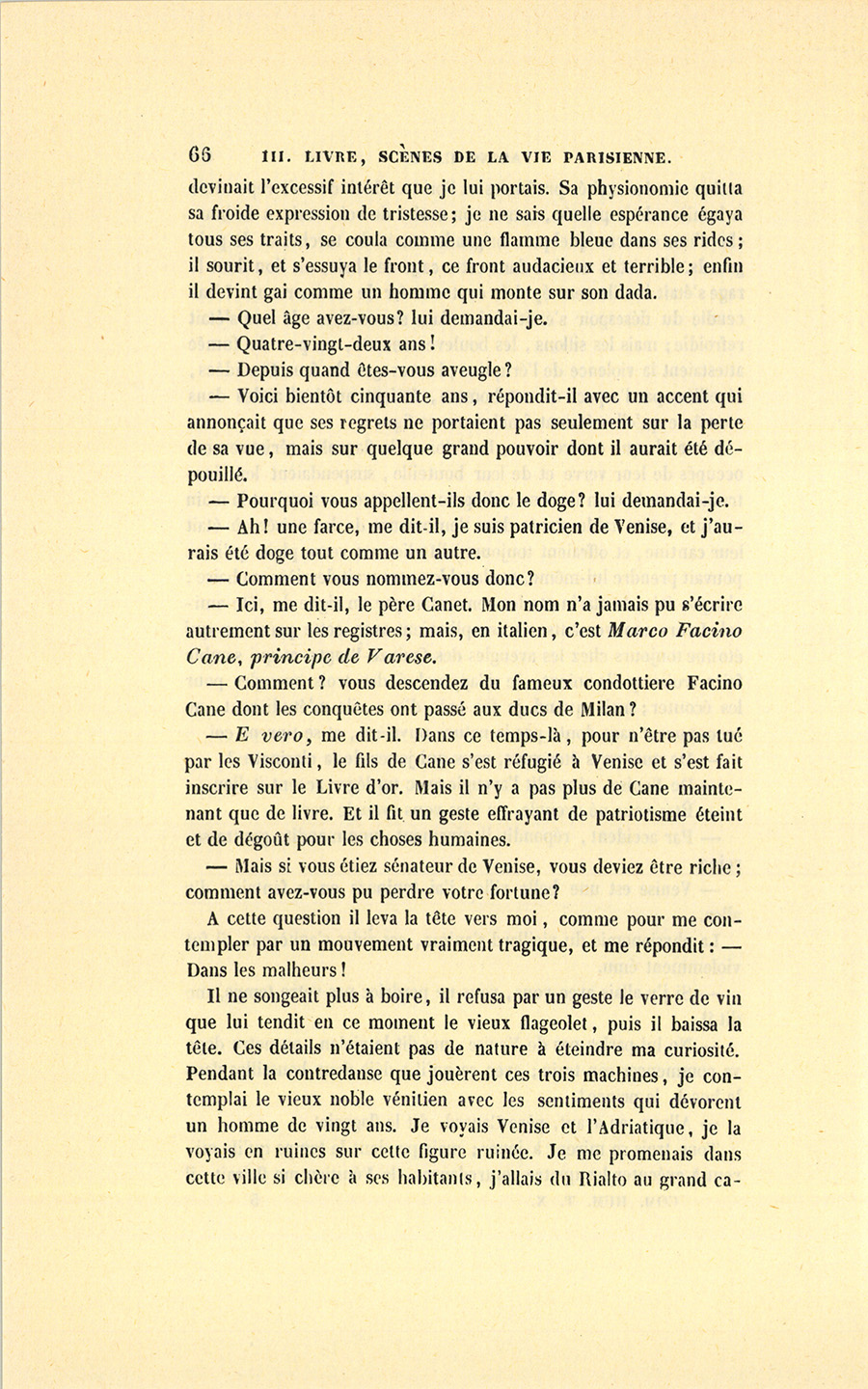 – Ne lui parlez pas de Venise, me dit le violon, ou notre doge va commencer son train ; avec ça qu’il a déjà deux bouteilles dans le bocal, le prince !