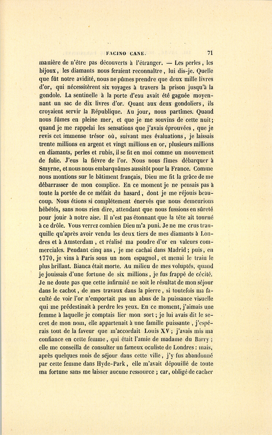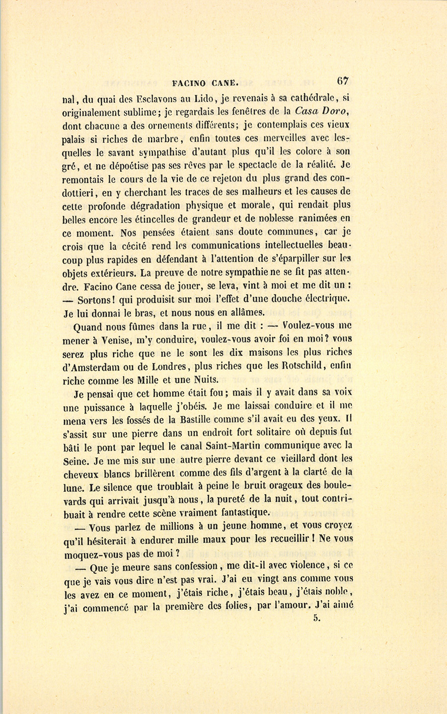 Quand nous fûmes dans la rue, il me dit : – Voulez-vous me mener à Venise, m’y conduire, voulez-vous avoir foi en moi ? vous serez plus riche que ne le sont les dix maisons les plus riches d’Amsterdam ou de Londres, plus riches que les Rotschild, enfin riche comme les Mille et une Nuits.
