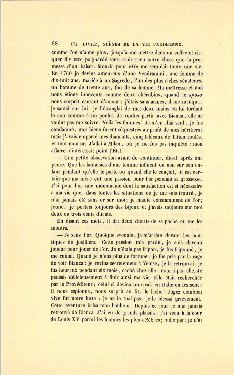– Que je meure sans confession, me dit-il avec violence, si ce que je vais vous dire n’est pas vrai. J’ai eu vingt ans comme vous les avez en ce moment, j’étais riche, j’étais beau, j’étais noble, j’ai commencé par la première des folies, par l’amour. J’ai aimé {p. 68} comme l’on n’aime plus, jusqu’à me mettre dans un coffre et risquer d’y être poignardé sans avoir reçu autre chose que la promesse d’un baiser. Mourir pour elle me semblait toute une vie. En 1760 je devins amoureux d’une Vendramini, une femme de dix-huit ans, mariée à un Sagredo, l’un des plus riches sénateurs, un homme de trente ans, fou de sa femme. Ma maîtresse et moi nous étions innocents comme deux chérubins, quand le sposo nous surprit causant d’amour ; j’étais sans armes, il me manqua, je sautai sur lui, je l’étranglai de mes deux mains en lui tordant le cou comme à un poulet. Je voulus partir avec Bianca, elle ne voulut pas me suivre. Voilà les femmes ! Je m’en allai seul, je fus condamné, mes biens furent séquestrés au profit de mes héritiers ; mais j’avais emporté mes diamants, cinq tableaux de Titien roulés, et tout mon or. J’allai à Milan, où je ne fus pas inquiété : mon affaire n’intéressait point l’État.