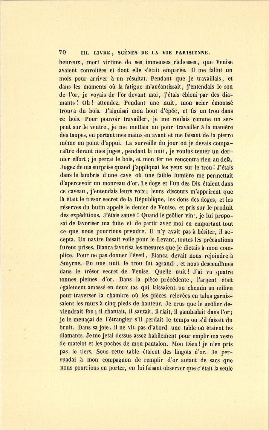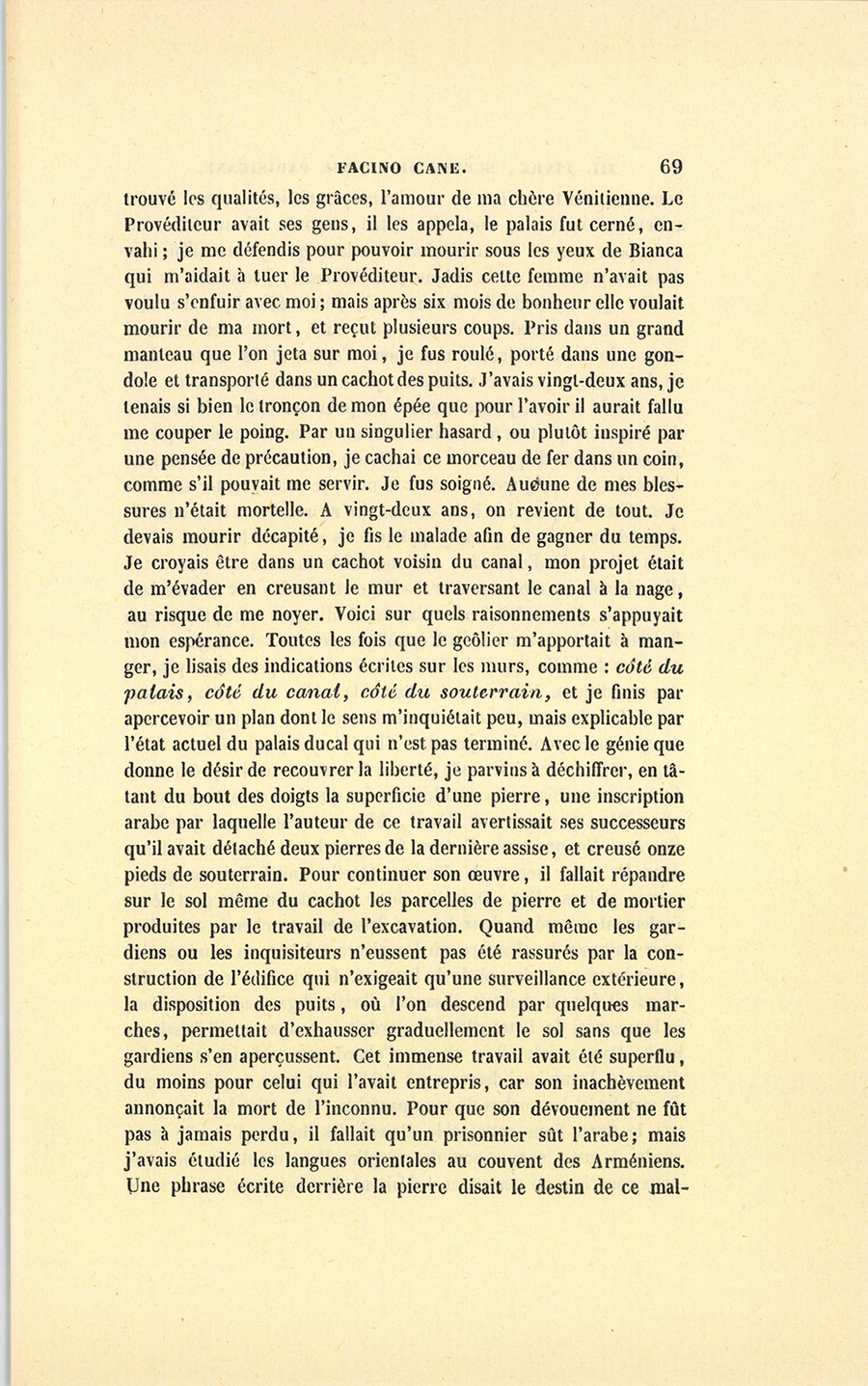 – Je sens l’or. Quoique aveugle, je m’arrête devant les boutiques de joailliers. Cette passion m’a perdu, je suis devenu joueur pour jouer de l’or. Je n’étais pas fripon, je fus friponné, je me ruinai. Quand je n’eus plus de fortune, je fus pris par la rage de voir Bianca : je revins secrètement à Venise, je la retrouvai, je fus heureux pendant six mois, caché chez elle, nourri par elle. Je pensais délicieusement à finir ainsi ma vie. Elle était recherchée par le Provéditeur ; celui-ci devina un rival, en Italie on les sent : il nous espionna, nous surprit au lit, le lâche ! Jugez combien vive fut notre lutte : je ne le tuai pas, je le blessai grièvement. Cette aventure brisa mon bonheur. Depuis ce jour je n’ai jamais retrouvé de Bianca. J’ai eu de grands plaisirs, j’ai vécu à la cour de Louis XV parmi les femmes les plus célèbres ; nulle part je n’ai {p. 69} trouvé les qualités, les grâces, l’amour de ma chère Vénitienne. Le Provéditeur avait ses gens, il les appela, le palais fut cerné, envahi ; je me défendis pour pouvoir mourir sous les yeux de Bianca qui m’aidait à tuer le Provéditeur. Jadis cette femme n’avait pas voulu s’enfuir avec moi ; mais après six mois de bonheur elle voulait mourir de ma mort, et reçut plusieurs coups. Pris dans un grand manteau que l’on jeta sur moi, je fus roulé, porté dans une gondole et transporté dans un cachot des puits. J’avais vingt-deux ans, je tenais si bien le tronçon de mon épée que pour l’avoir il aurait fallu me couper le poing. Par un singulier hasard, ou plutôt inspiré par une pensée de précaution, je cachai ce morceau de fer dans un coin, comme s’il pouvait me servir. Je fus soigné. Aucune de mes blessures n’était mortelle. À vingt-deux ans, on revient de tout. Je devais mourir décapité, je fis le malade afin de gagner du temps. Je croyais être dans un cachot voisin du canal, mon projet était de m’évader en creusant le mur et traversant le canal à la nage, au risque de me noyer. Voici sur quels raisonnements s’appuyait mon espérance. Toutes les fois que le geôlier m’apportait à manger, je lisais des indications écrites sur les murs, comme : côté du palais, côté du canal, côté du souterrain, et je finis par apercevoir un plan dont le sens m’inquiétait peu, mais explicable par l’état actuel du palais ducal qui n’est pas terminé. Avec le génie que donne le désir de recouvrer la liberté, je parvins à déchiffrer, en tâtant du bout des doigts la superficie d’une pierre, une inscription arabe par laquelle l’auteur de ce travail avertissait ses successeurs qu’il avait détaché deux pierres de la dernière assise, et creusé onze pieds de souterrain. Pour continuer son œuvre, il fallait répandre sur le sol même du cachot les parcelles de pierre et de mortier produites par le travail de l’excavation. Quand même les gardiens ou les inquisiteurs n’eussent pas été rassurés par la construction de l’édifice qui n’exigeait qu’une surveillance extérieure, la disposition des puits, où l’on descend par quelques marches, permettait d’exhausser graduellement le sol sans que les gardiens s’en aperçussent. Cet immense travail avait été superflu, du moins pour celui qui l’avait entrepris, car son inachèvement annonçait la mort de l’inconnu. Pour que son dévouement ne fût pas à jamais perdu, il fallait qu’un prisonnier sût l’arabe ; mais j’avais étudié les langues orientales au couvent des Arméniens. Une phrase écrite derrière la pierre disait le destin de ce {p. 70} malheureux, mort victime de ses immenses richesses, que Venise avait convoitées2 et dont elle s’était emparée. Il me fallut un mois pour arriver à un résultat. Pendant que je travaillais, et dans les moments où la fatigue m’anéantissait, j’entendais le son de l’or, je voyais de l’or devant moi, j’étais ébloui par des diamants ! Oh ! attendez. Pendant une nuit, mon acier émoussé trouva du bois. J’aiguisai mon bout d’épée, et fis un trou dans ce bois. Pour pouvoir travailler, je me roulais comme un serpent sur le ventre, je me mettais nu pour travailler à la manière des taupes, en portant mes mains en avant et me faisant de la pierre même un point d’appui. La surveille du jour où je devais comparaître devant mes juges, pendant la nuit, je voulus tenter un dernier effort ; je perçai le bois, et mon fer ne rencontra rien au delà. Jugez de ma surprise quand j’appliquai les yeux sur le trou ! J’étais dans le lambris d’une cave où une faible lumière me permettait d’apercevoir un monceau d’or. Le doge et l’un des Dix étaient dans ce caveau, j’entendais leurs voix ; leurs discours m’apprirent que là était le trésor secret de la République, les dons des doges, et les réserves du butin appelé le denier de Venise, et pris sur le produit des expéditions. J’étais sauvé ! Quand le geôlier vint, je lui proposai de favoriser ma fuite et de partir avec moi en emportant tout ce que nous pourrions prendre. Il n’y avait pas à hésiter, il accepta. Un navire faisait voile pour le Levant, toutes les précautions furent prises, Bianca favorisa les mesures que je dictais à mon complice. Pour ne pas donner l’éveil, Bianca devait nous rejoindre à Smyrne. En une nuit le trou fut agrandi, et nous descendîmes dans le trésor secret de Venise. Quelle nuit ! J’ai vu quatre tonnes pleines d’or. Dans la pièce précédente, l’argent était également amassé en deux tas qui laissaient un chemin au milieu pour traverser la chambre où les pièces relevées en talus garnissaient les murs à cinq pieds de hauteur. Je crus que le geôlier deviendrait fou ; il chantait, il sautait, il riait, il gambadait dans l’or ; je le menaçai de l’étrangler s’il perdait le temps ou s’il faisait du bruit. Dans sa joie, il ne vit pas d’abord une table où étaient les diamants. Je me je