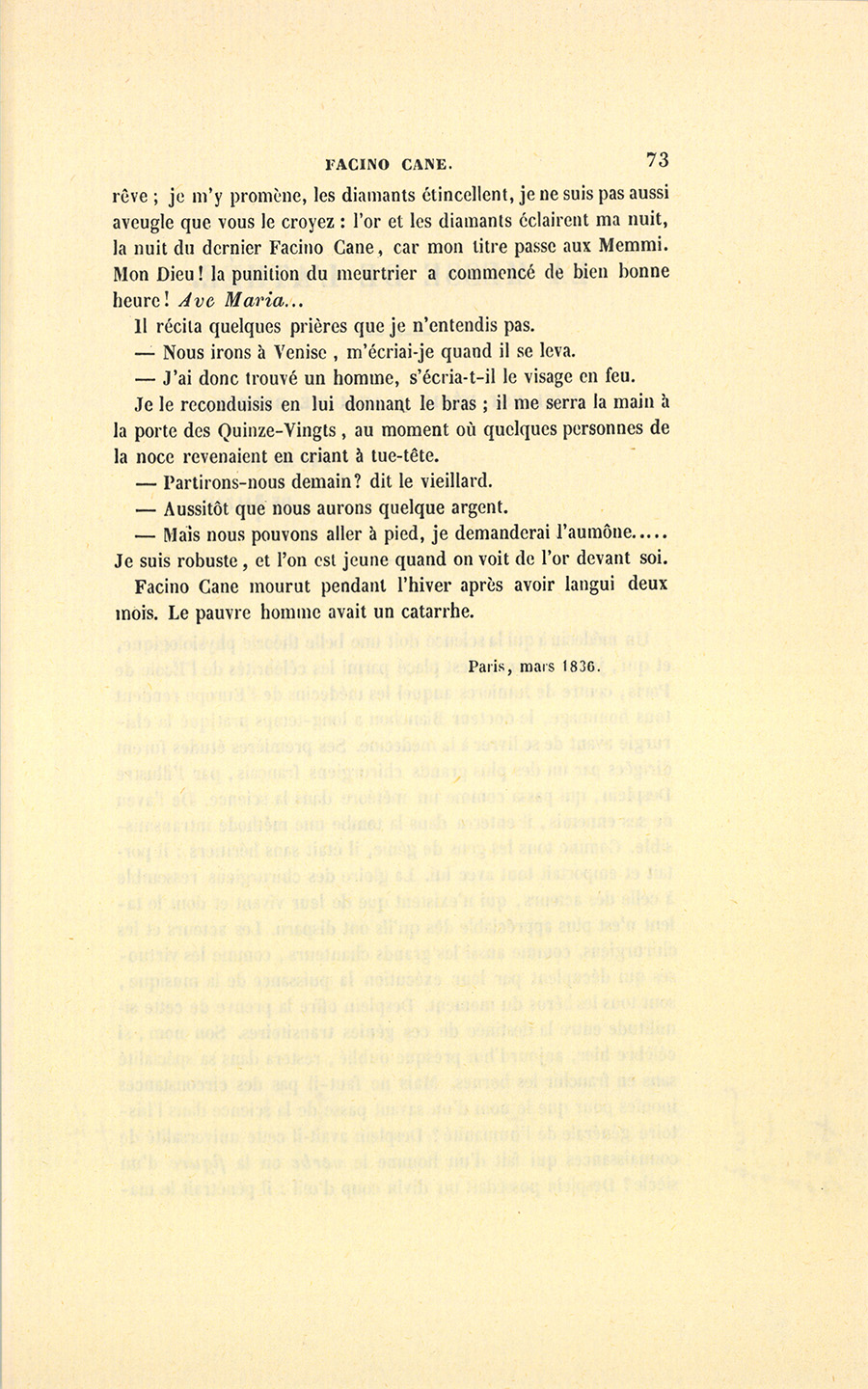 – Ce trésor, me dit-il, je le vois toujours, éveillé comme en {p. 73} rêve ; je m’y promène, les diamants étincellent, je ne suis pas aussi aveugle que vous le croyez : l’or et les diamants éclairent ma nuit, la nuit du dernier Facino Cane, car mon titre passe aux Memmi. Mon Dieu ! la punition du meurtrier a commencé de bien bonne heure ! Ave Maria…