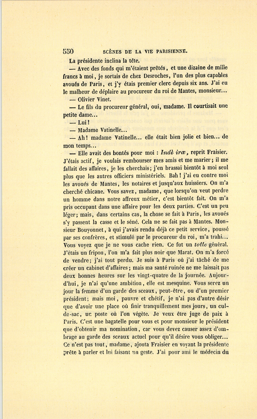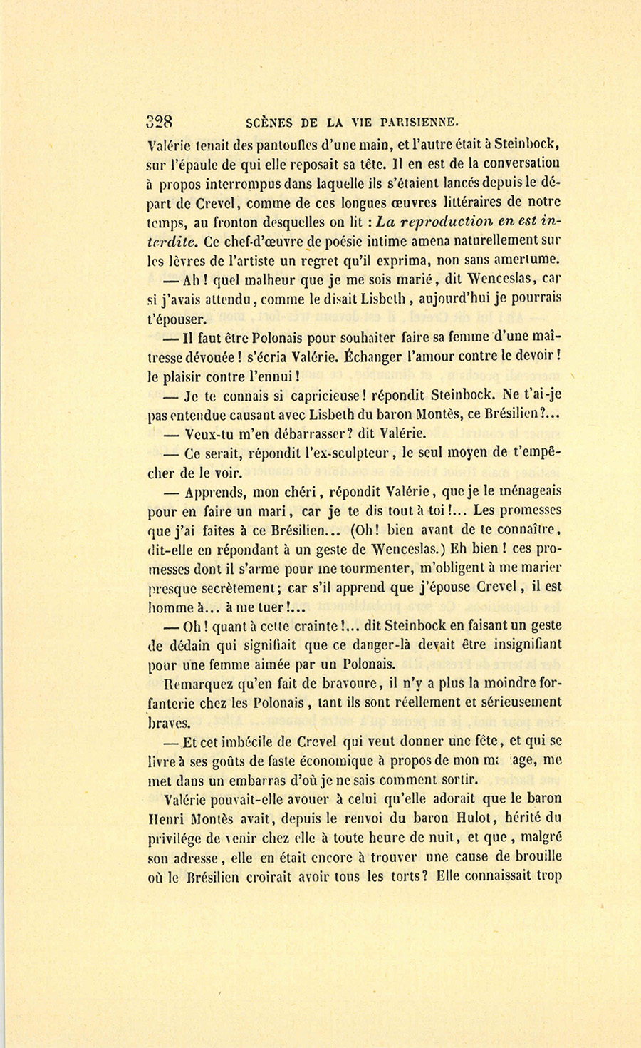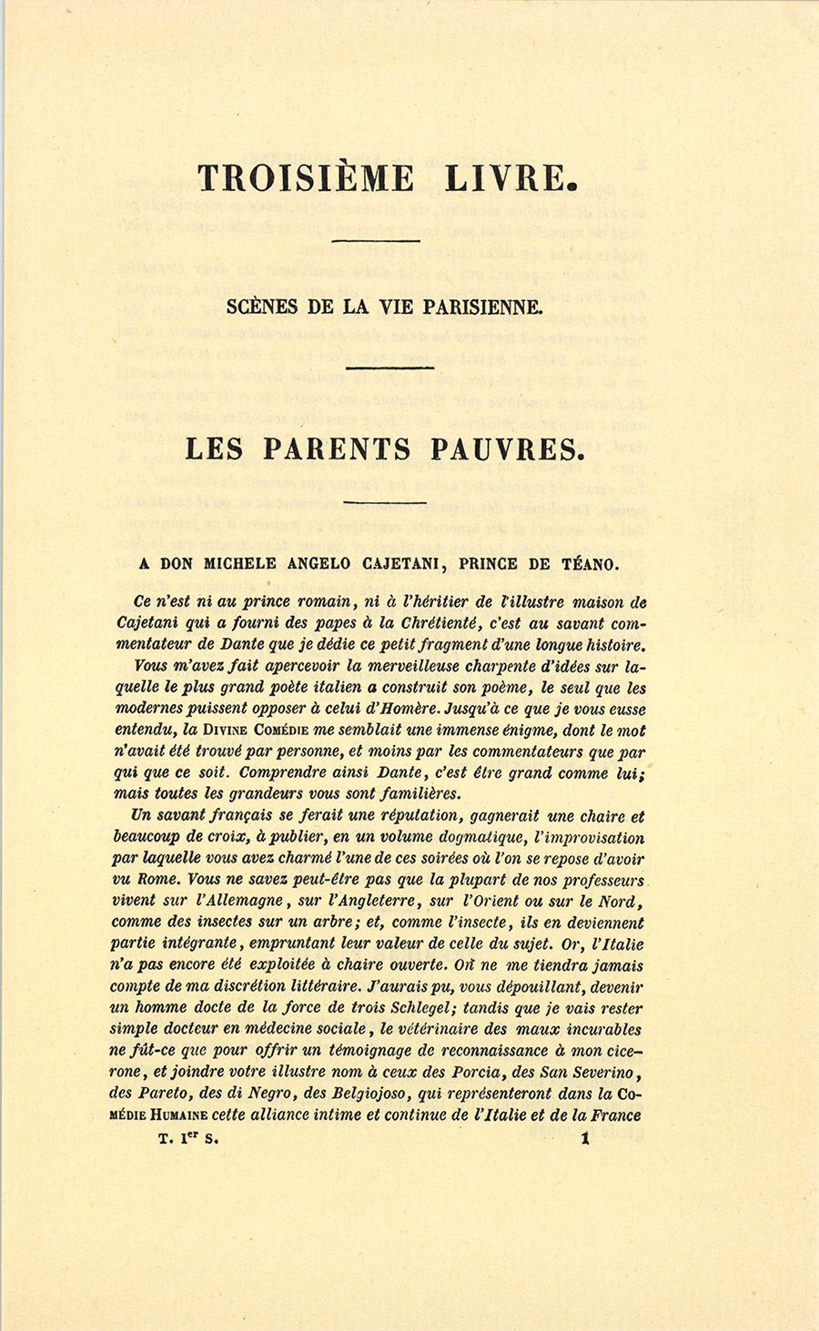 Un savant français se ferait une réputation, gagnerait une chaire et beaucoup de croix, à publier, en un volume dogmatique, l’improvisation par laquelle vous avez charmé l’une de ces soirées où l’on se repose d’avoir vu Rome. Vous ne savez peut-être pas que la plupart de nos professeurs vivent sur l’Allemagne, sur l’Angleterre, sur l’Orient ou sur le Nord, comme des insectes sur un arbre ; et, comme l’insecte, ils en deviennent partie intégrante, empruntant leur valeur de celle du sujet. Or, l’Italie n’a pas encore été exploitée à chaire ouverte. On ne me tiendra jamais compte de ma discrétion littéraire. J’aurais pu, vous dépouillant, devenir un homme docte de la force de trois Schlegel ; tandis que je vais rester simple docteur en médecine sociale, le vétérinaire des maux incurables ne fût-ce que pour offrir un témoignage de reconnaissance à mon cicerone, et joindre votre illustre nom à ceux des Porcia, des San Severino, des Pareto, des di Negro, des Belgiojoso, qui représenteront dans la Comédie Humaine cette alliance intime et continue de l’Italie et de la France {p. 2} que déjà le Bandello, cet évêque, auteur de contes très-drôlatiques, consacrait de la même manière, au seizième siècle, dans ce magnifique recueil de nouvelles d’où sont issues plusieurs pièces de Shakespeare, quelquefois même des rôles entiers, et textuellement.