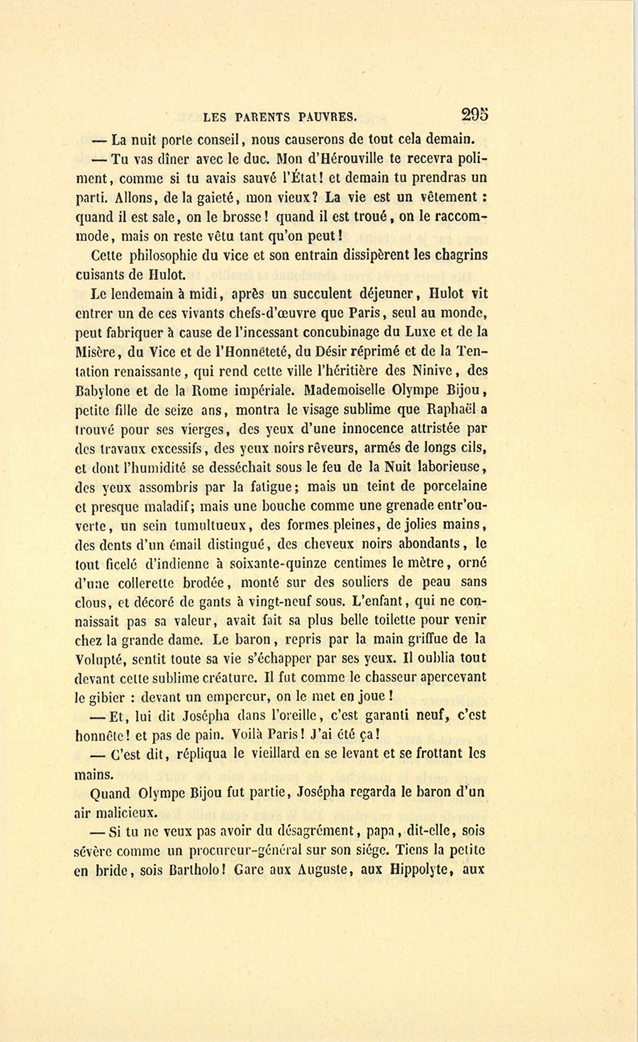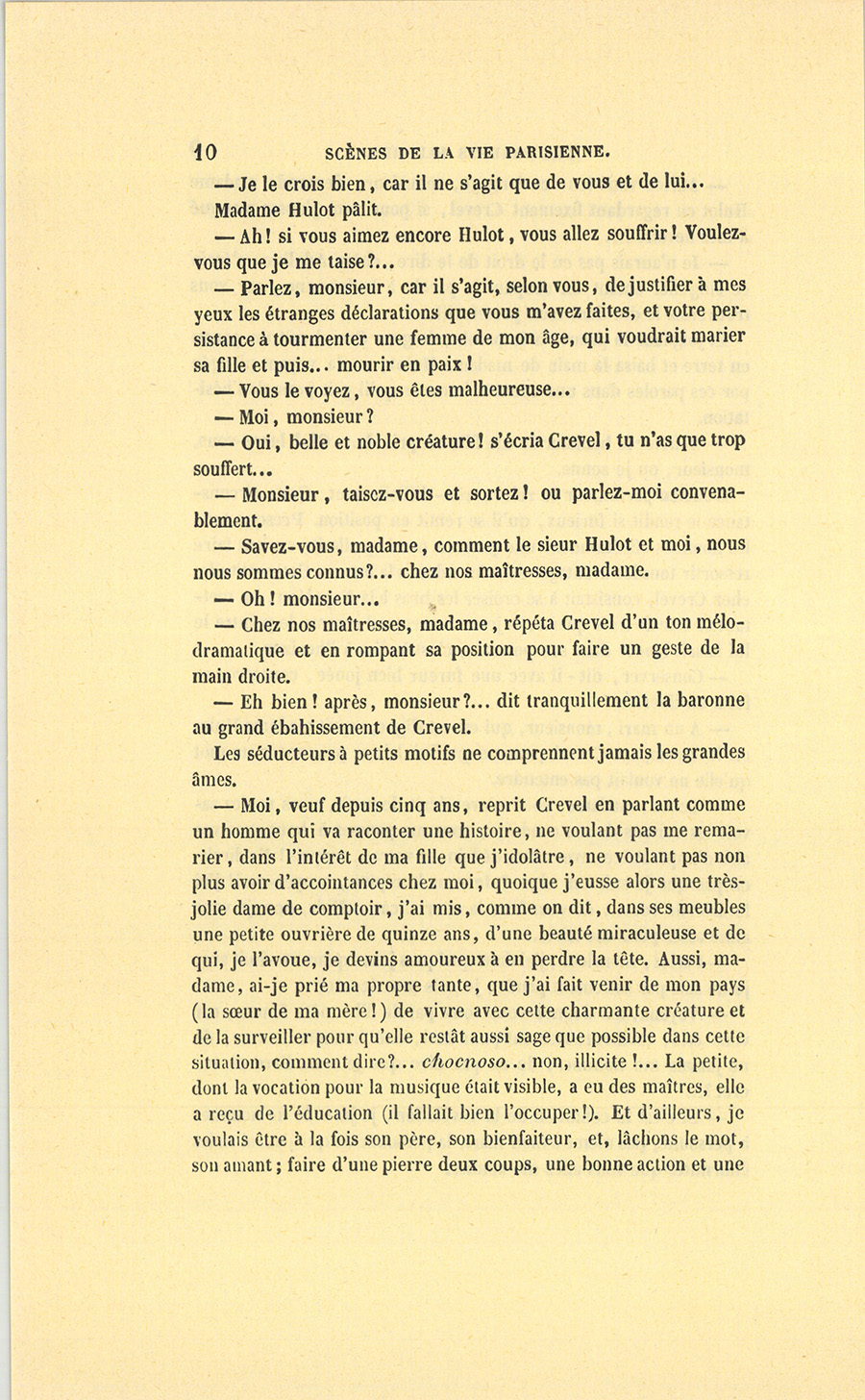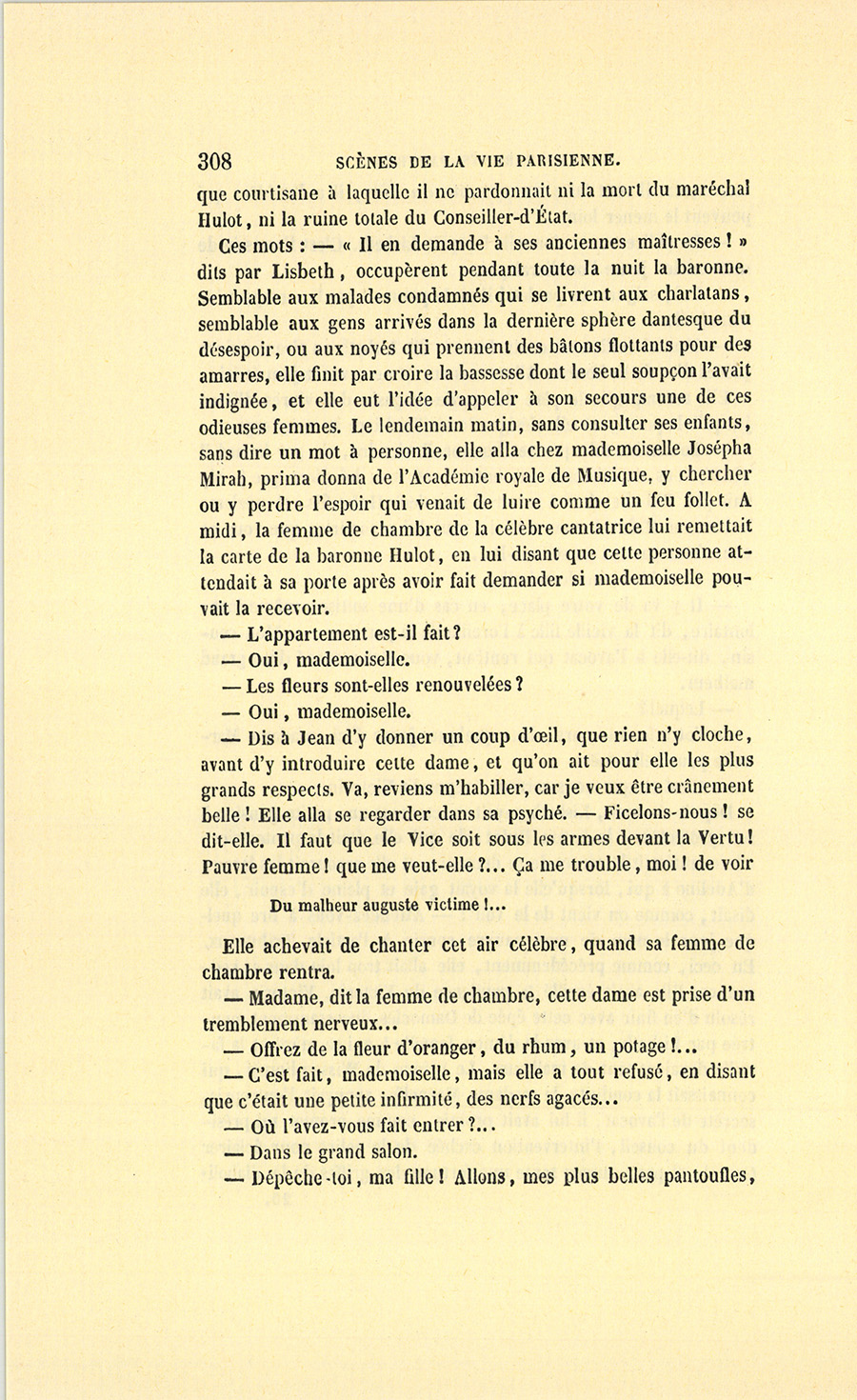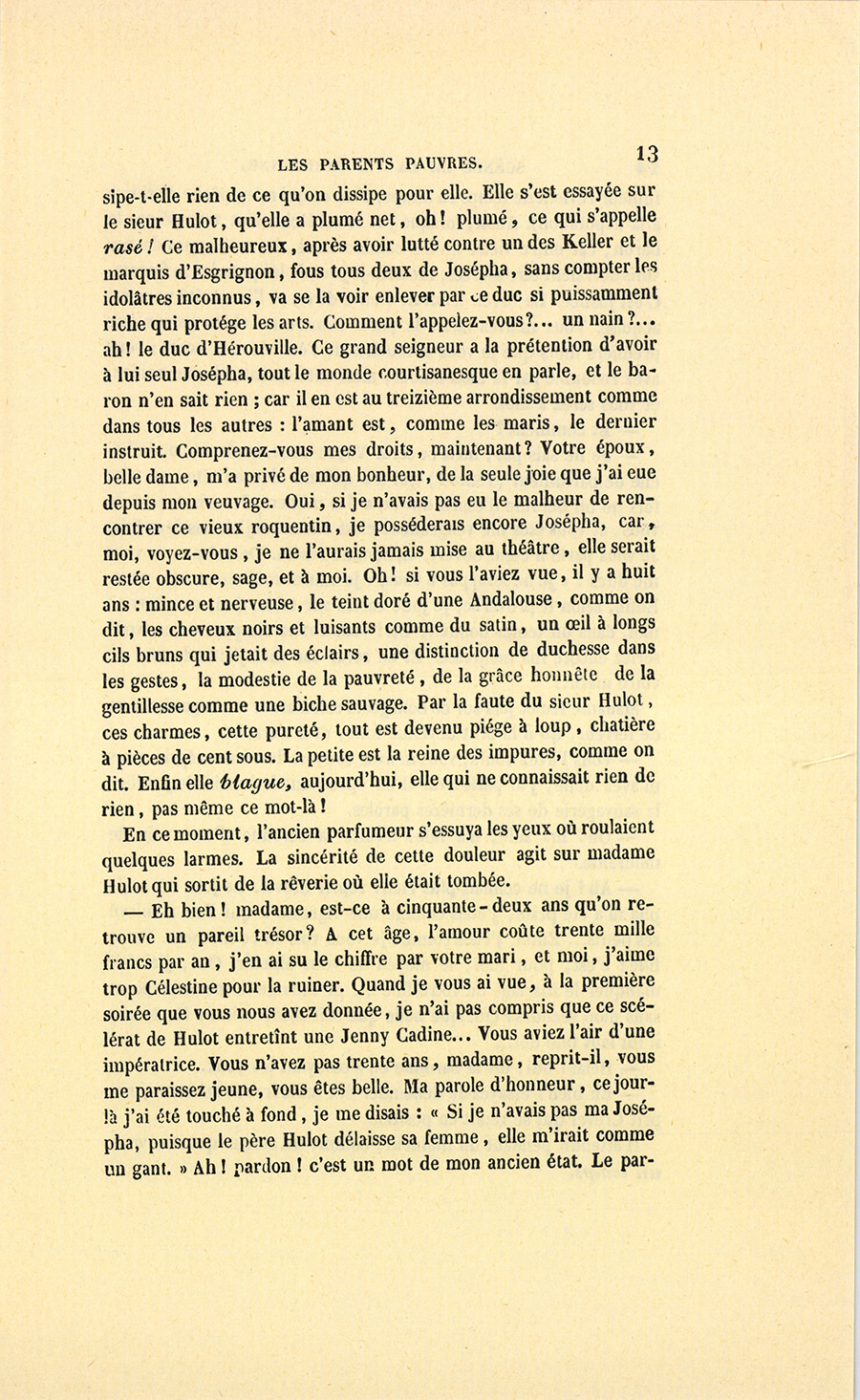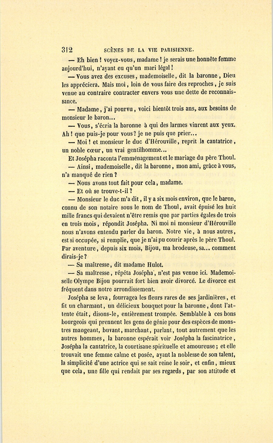 – Moi, veuf depuis cinq ans, reprit Crevel en parlant comme un homme qui va raconter une histoire, ne voulant pas me remarier, dans l’intérêt de ma fille que j’idolâtre, ne voulant pas non plus avoir d’accointances chez moi, quoique j’eusse alors une très-jolie dame de comptoir, j’ai mis, comme on dit, dans ses meubles une petite ouvrière de quinze ans, d’une beauté miraculeuse et de qui, je l’avoue, je devins amoureux à en perdre la tête. Aussi, madame, ai-je prié ma propre tante, que j’ai fait venir de mon pays (la sœur de ma mère !) de vivre avec cette charmante créature et de la surveiller pour qu’elle restât aussi sage que possible dans cette situation, comment dire ?… chocnoso… non, illicite !… La petite, dont la vocation pour la musique était visible, a eu des maîtres, elle a reçu de l’éducation (il fallait bien l’occuper !). Et d’ailleurs, je voulais être à la fois son père, son bienfaiteur, et, lâchons le mot, son amant ; faire d’une pierre deux coups, une bonne action et une {p. 11} bonne amie. J’ai été heureux cinq ans. La petite a l’une de ces voix qui sont la fortune d’un théâtre, et je ne peux la qualifier autrement qu’en disant que c’est Duprez en jupon. Elle m’a coûté deux mille francs par an, uniquement pour lui donner son talent de cantatrice. Elle m’a rendu fou de la musique, j’ai eu pour elle et pour ma fille une loge aux Italiens. J’y allais alternativement un jour avec Célestine, un jour avec Josépha…