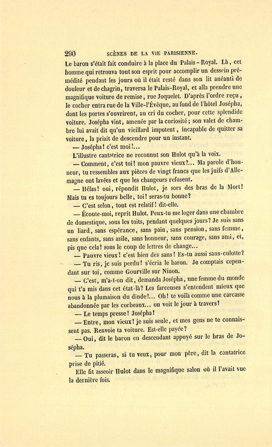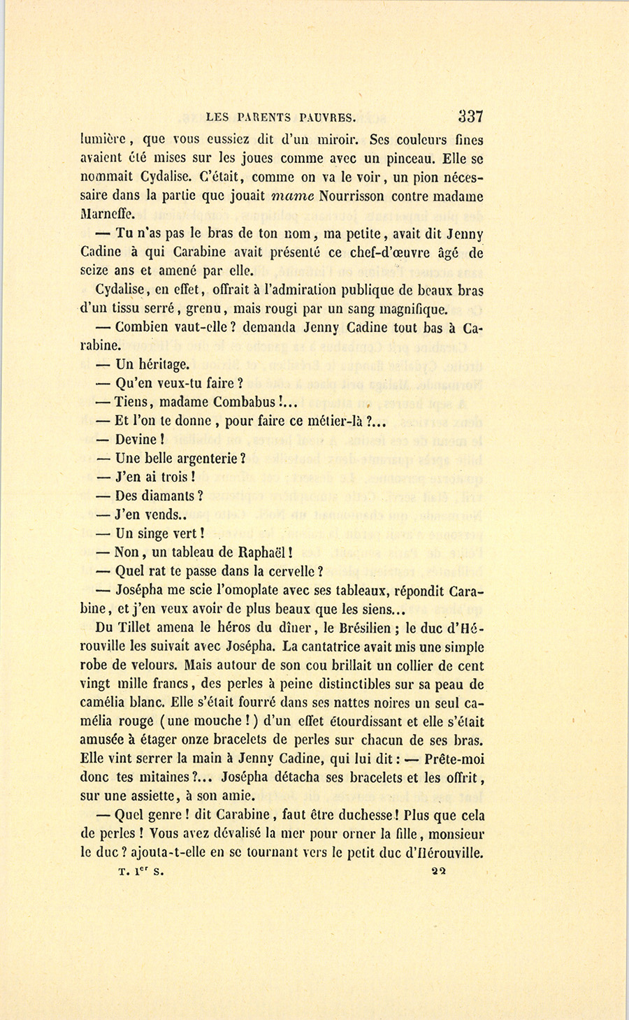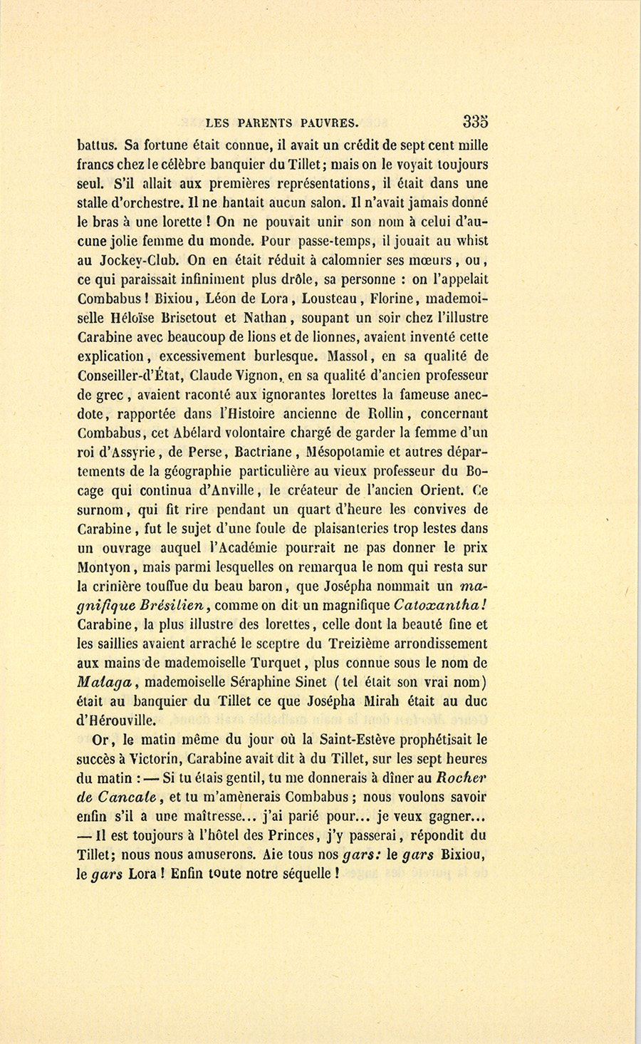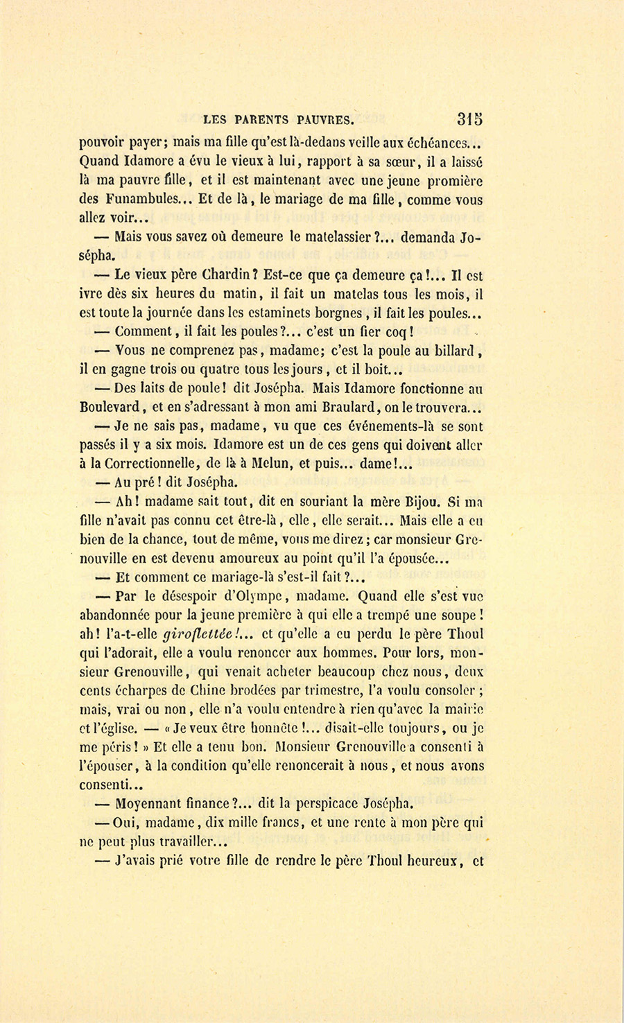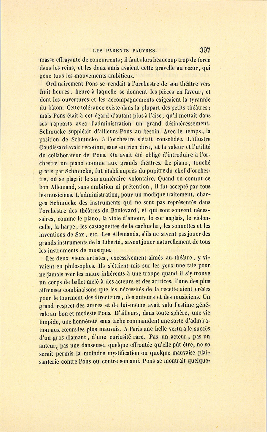 – Moi, veuf depuis cinq ans, reprit Crevel en parlant comme un homme qui va raconter une histoire, ne voulant pas me remarier, dans l’intérêt de ma fille que j’idolâtre, ne voulant pas non plus avoir d’accointances chez moi, quoique j’eusse alors une très-jolie dame de comptoir, j’ai mis, comme on dit, dans ses meubles une petite ouvrière de quinze ans, d’une beauté miraculeuse et de qui, je l’avoue, je devins amoureux à en perdre la tête. Aussi, madame, ai-je prié ma propre tante, que j’ai fait venir de mon pays (la sœur de ma mère !) de vivre avec cette charmante créature et de la surveiller pour qu’elle restât aussi sage que possible dans cette situation, comment dire ?… chocnoso… non, illicite !… La petite, dont la vocation pour la musique était visible, a eu des maîtres, elle a reçu de l’éducation (il fallait bien l’occuper !). Et d’ailleurs, je voulais être à la fois son père, son bienfaiteur, et, lâchons le mot, son amant ; faire d’une pierre deux coups, une bonne action et une {p. 11} bonne amie. J’ai été heureux cinq ans. La petite a l’une de ces voix qui sont la fortune d’un théâtre, et je ne peux la qualifier autrement qu’en disant que c’est Duprez en jupon. Elle m’a coûté deux mille francs par an, uniquement pour lui donner son talent de cantatrice. Elle m’a rendu fou de la musique, j’ai eu pour elle et pour ma fille une loge aux Italiens. J’y allais alternativement un jour avec Célestine, un jour avec Josépha…
