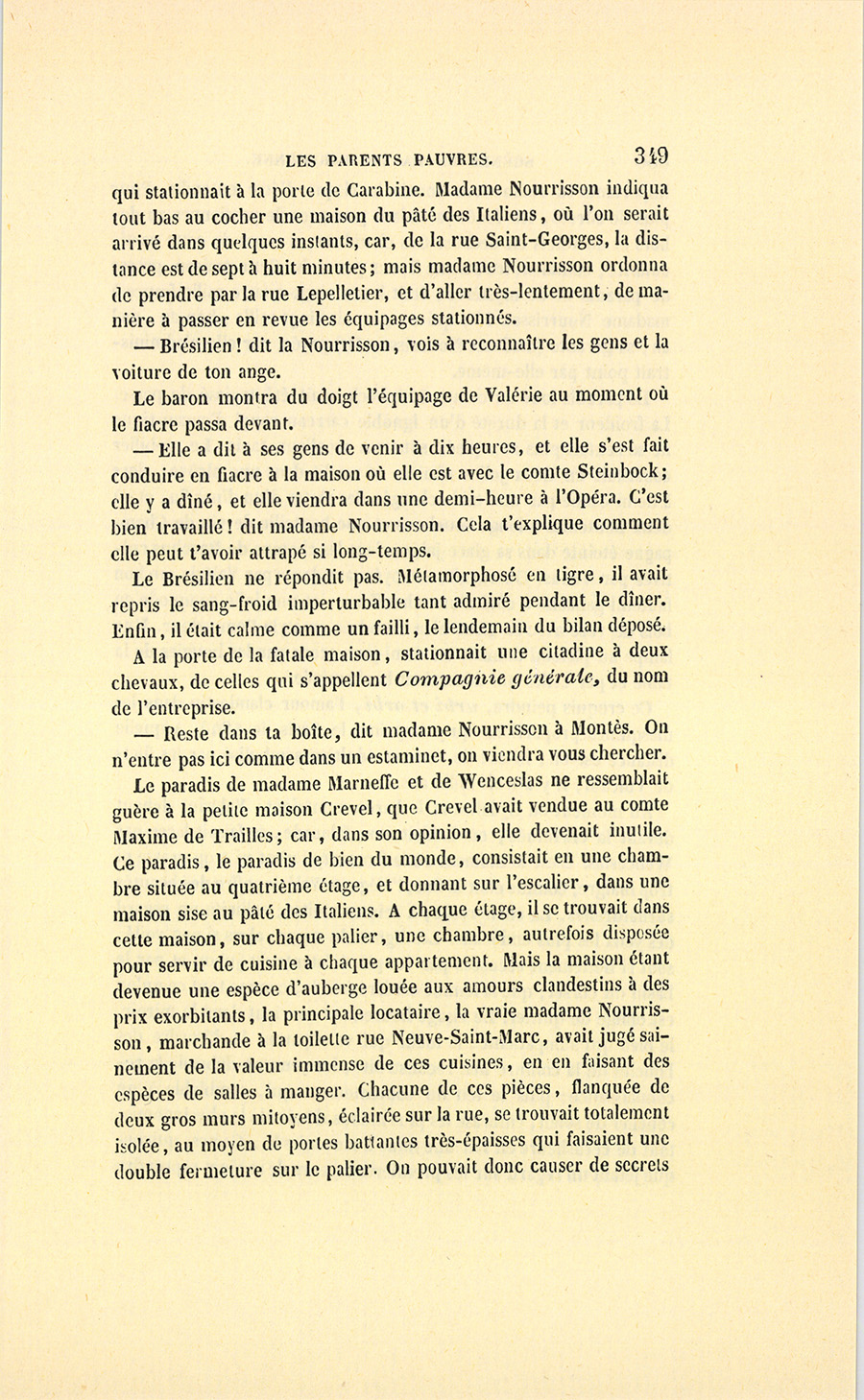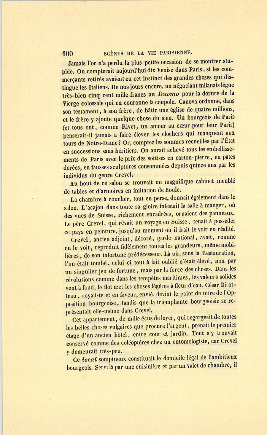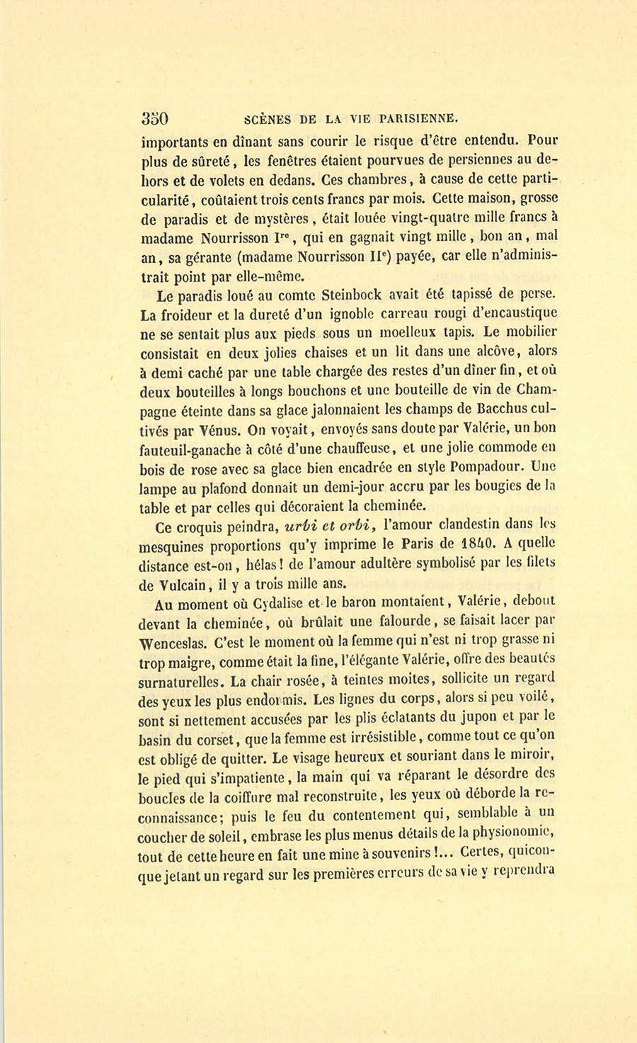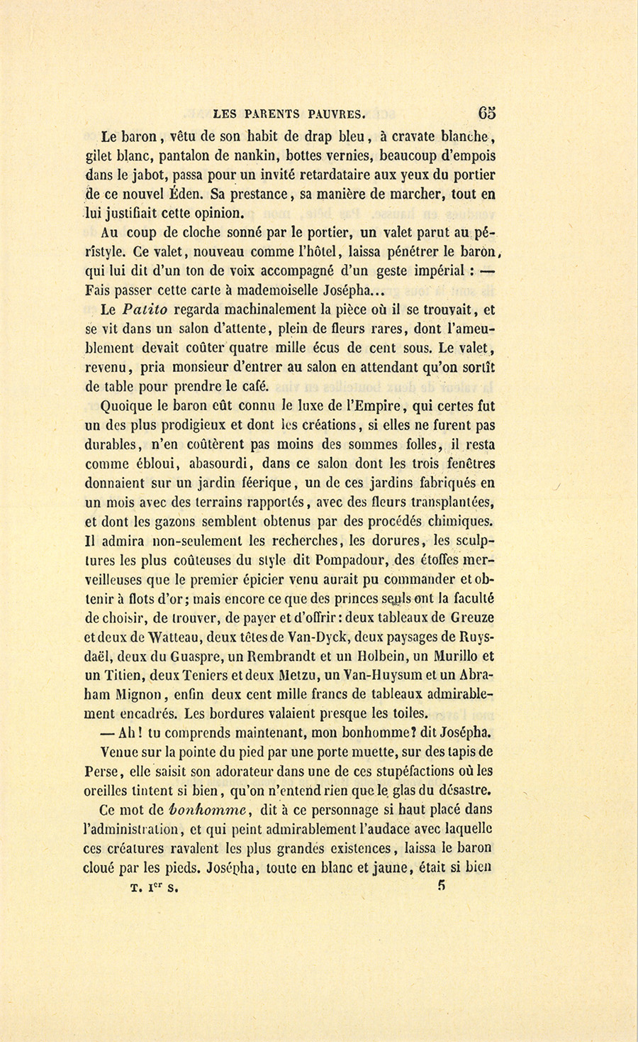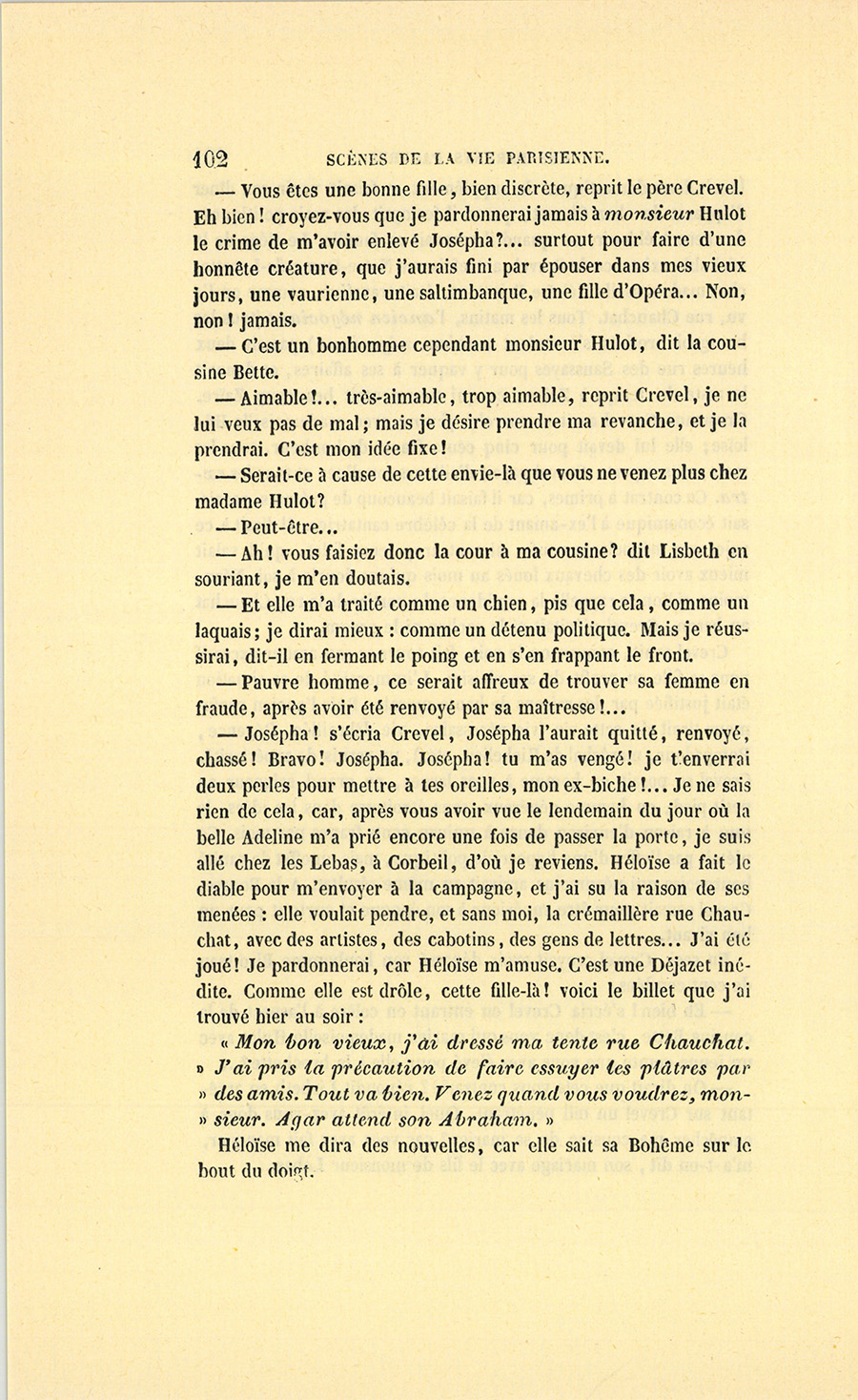 – Moi, veuf depuis cinq ans, reprit Crevel en parlant comme un homme qui va raconter une histoire, ne voulant pas me remarier, dans l’intérêt de ma fille que j’idolâtre, ne voulant pas non plus avoir d’accointances chez moi, quoique j’eusse alors une très-jolie dame de comptoir, j’ai mis, comme on dit, dans ses meubles une petite ouvrière de quinze ans, d’une beauté miraculeuse et de qui, je l’avoue, je devins amoureux à en perdre la tête. Aussi, madame, ai-je prié ma propre tante, que j’ai fait venir de mon pays (la sœur de ma mère !) de vivre avec cette charmante créature et de la surveiller pour qu’elle restât aussi sage que possible dans cette situation, comment dire ?… chocnoso… non, illicite !… La petite, dont la vocation pour la musique était visible, a eu des maîtres, elle a reçu de l’éducation (il fallait bien l’occuper !). Et d’ailleurs, je voulais être à la fois son père, son bienfaiteur, et, lâchons le mot, son amant ; faire d’une pierre deux coups, une bonne action et une {p. 11} bonne amie. J’ai été heureux cinq ans. La petite a l’une de ces voix qui sont la fortune d’un théâtre, et je ne peux la qualifier autrement qu’en disant que c’est Duprez en jupon. Elle m’a coûté deux mille francs par an, uniquement pour lui donner son talent de cantatrice. Elle m’a rendu fou de la musique, j’ai eu pour elle et pour ma fille une loge aux Italiens. J’y allais alternativement un jour avec Célestine, un jour avec Josépha…