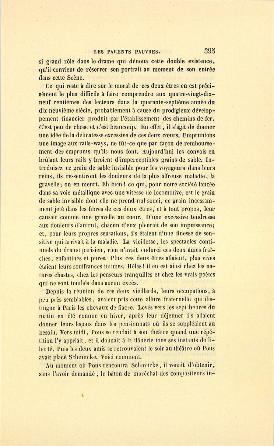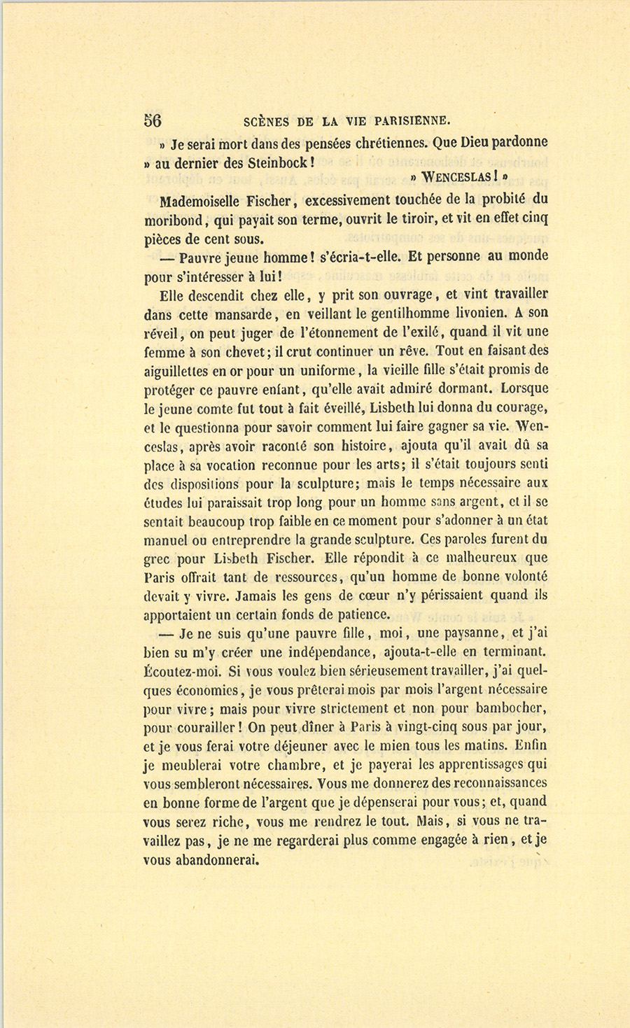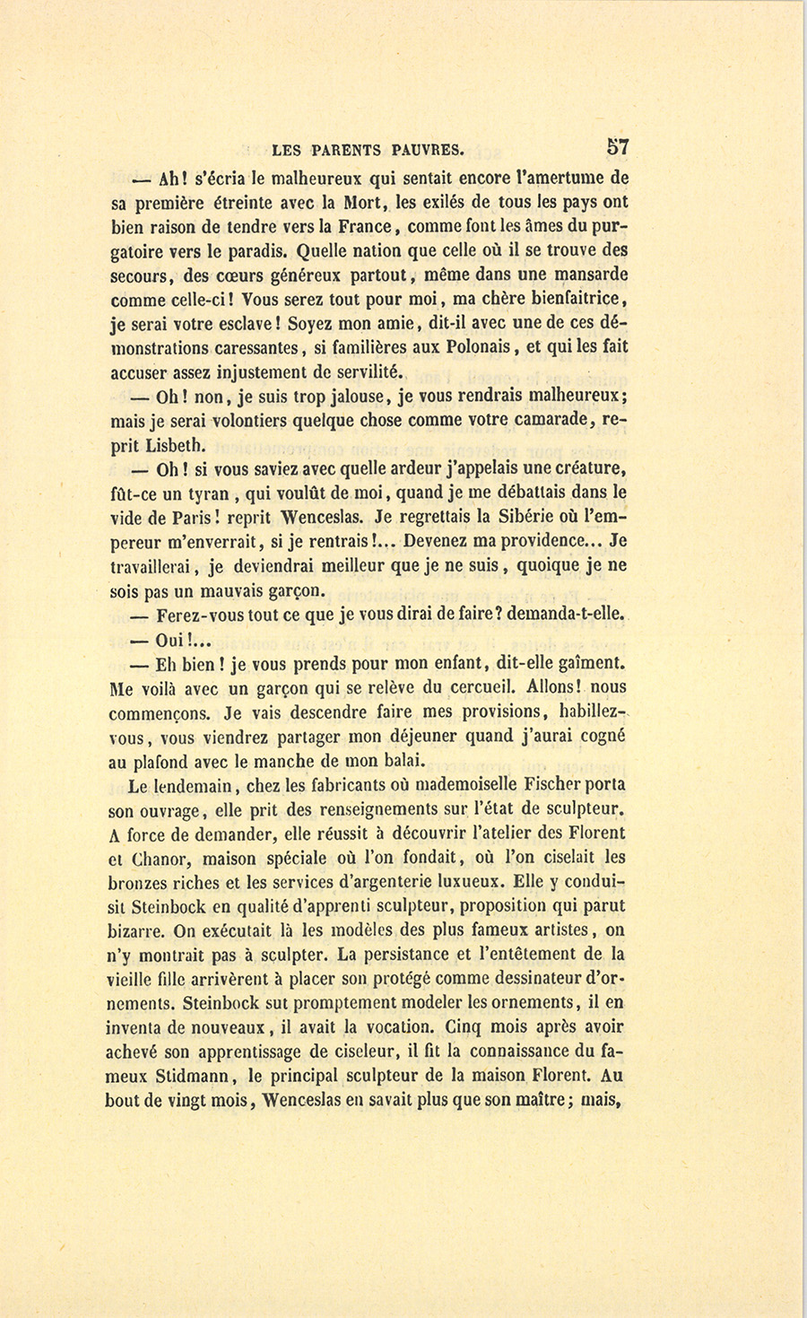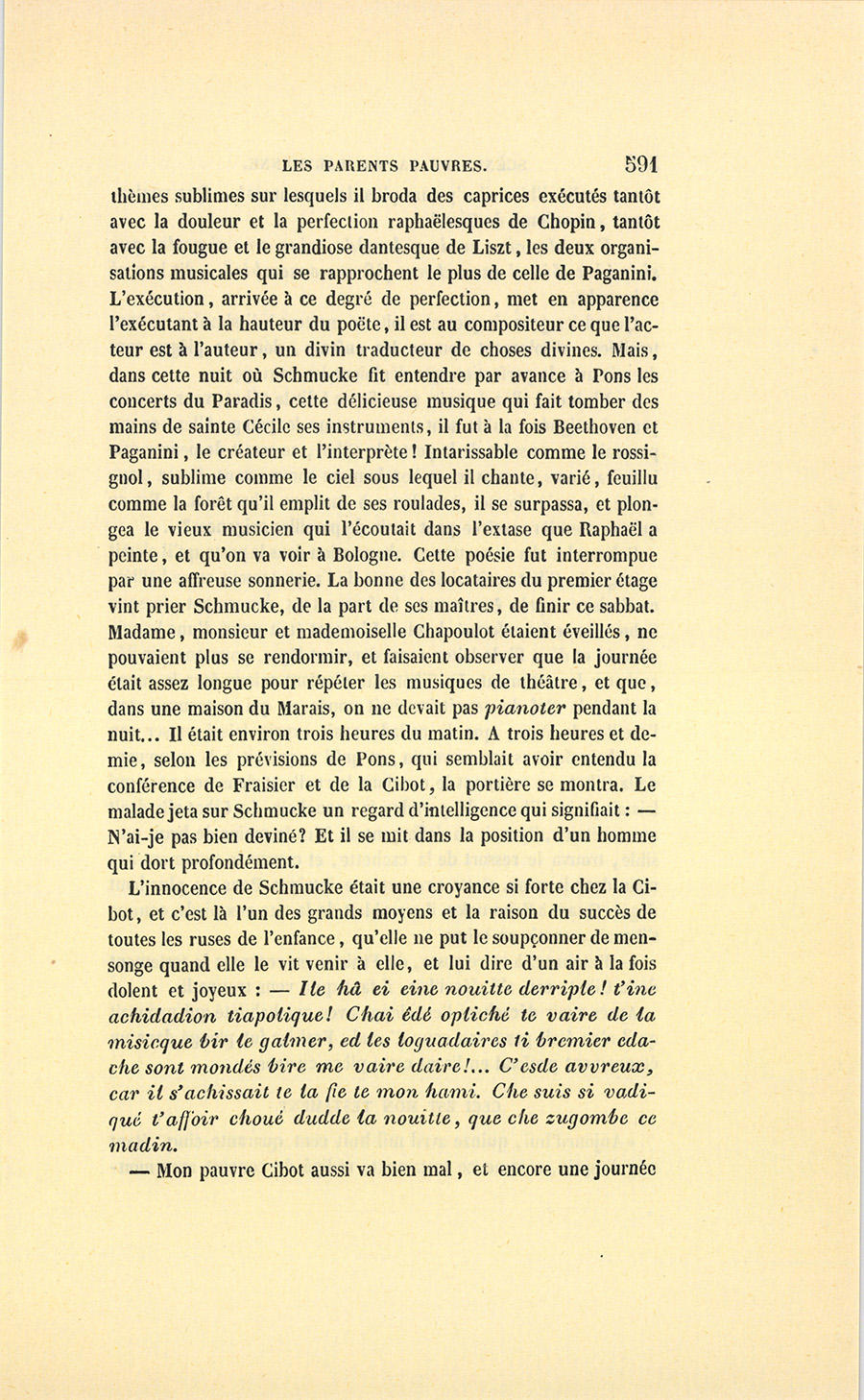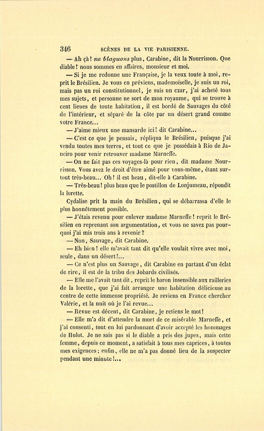 – Moi, veuf depuis cinq ans, reprit Crevel en parlant comme un homme qui va raconter une histoire, ne voulant pas me remarier, dans l’intérêt de ma fille que j’idolâtre, ne voulant pas non plus avoir d’accointances chez moi, quoique j’eusse alors une très-jolie dame de comptoir, j’ai mis, comme on dit, dans ses meubles une petite ouvrière de quinze ans, d’une beauté miraculeuse et de qui, je l’avoue, je devins amoureux à en perdre la tête. Aussi, madame, ai-je prié ma propre tante, que j’ai fait venir de mon pays (la sœur de ma mère !) de vivre avec cette charmante créature et de la surveiller pour qu’elle restât aussi sage que possible dans cette situation, comment dire ?… chocnoso… non, illicite !… La petite, dont la vocation pour la musique était visible, a eu des maîtres, elle a reçu de l’éducation (il fallait bien l’occuper !). Et d’ailleurs, je voulais être à la fois son père, son bienfaiteur, et, lâchons le mot, son amant ; faire d’une pierre deux coups, une bonne action et une {p. 11} bonne amie. J’ai été heureux cinq ans. La petite a l’une de ces voix qui sont la fortune d’un théâtre, et je ne peux la qualifier autrement qu’en disant que c’est Duprez en jupon. Elle m’a coûté deux mille francs par an, uniquement pour lui donner son talent de cantatrice. Elle m’a rendu fou de la musique, j’ai eu pour elle et pour ma fille une loge aux Italiens. J’y allais alternativement un jour avec Célestine, un jour avec Josépha…