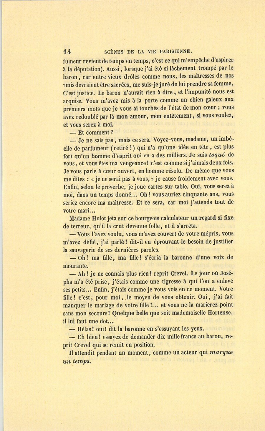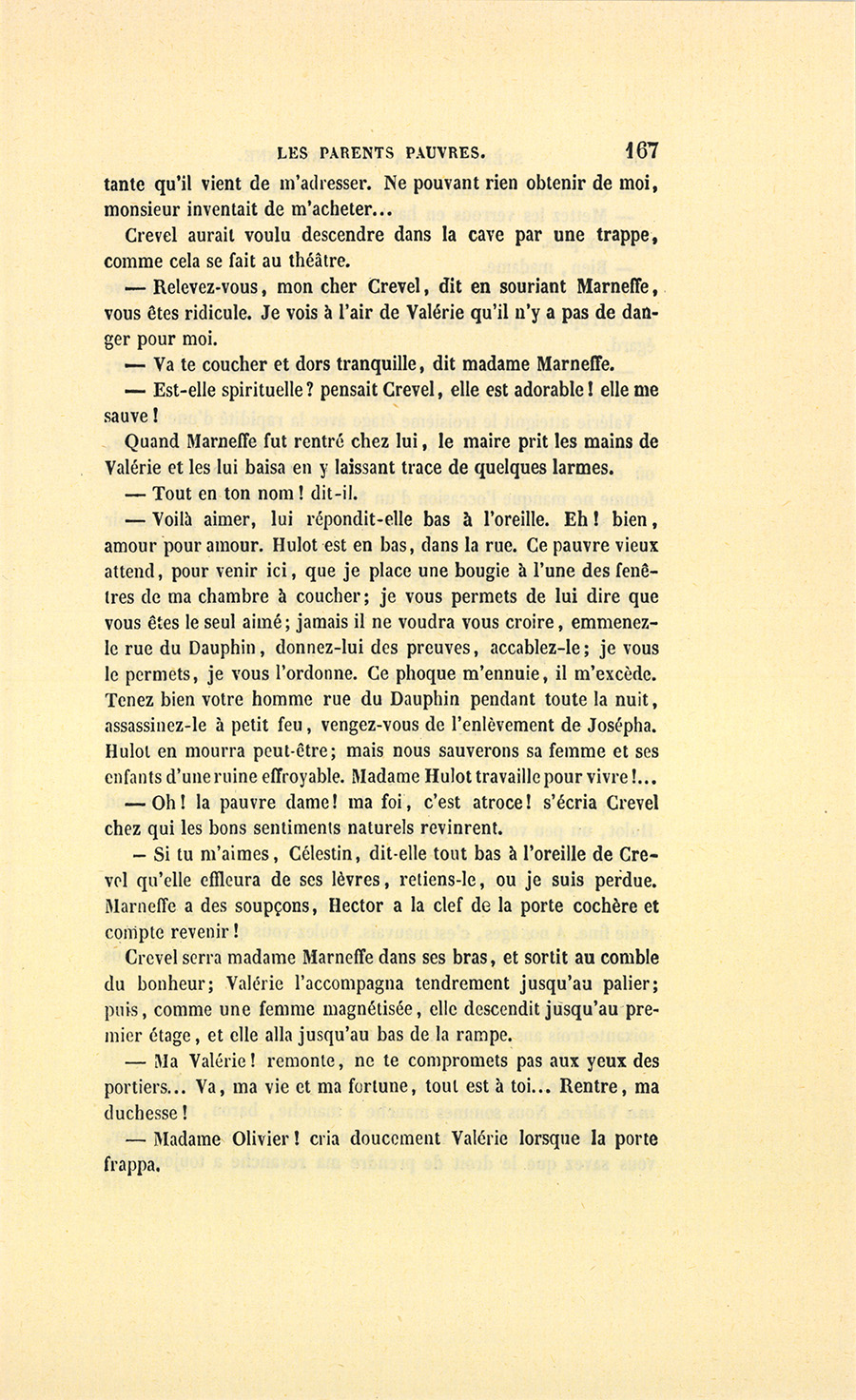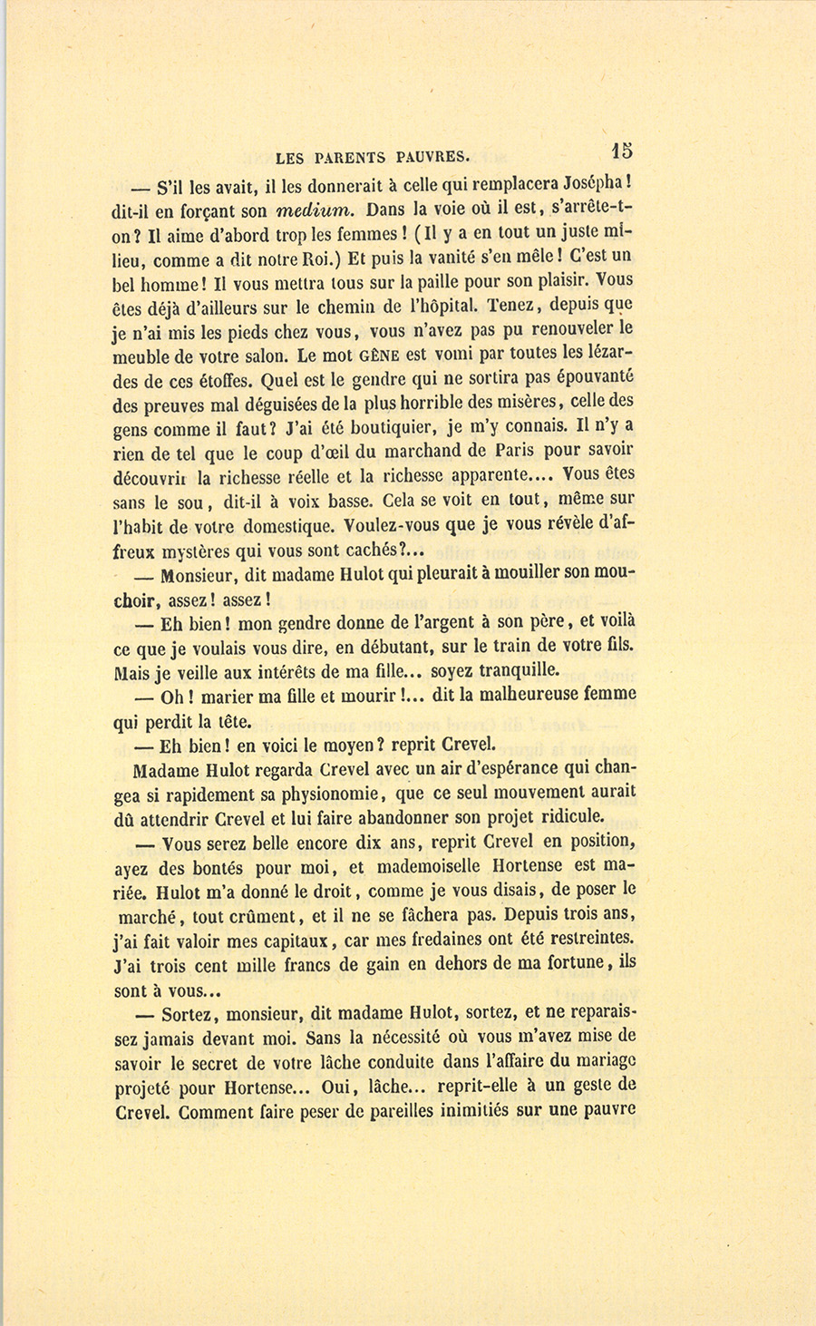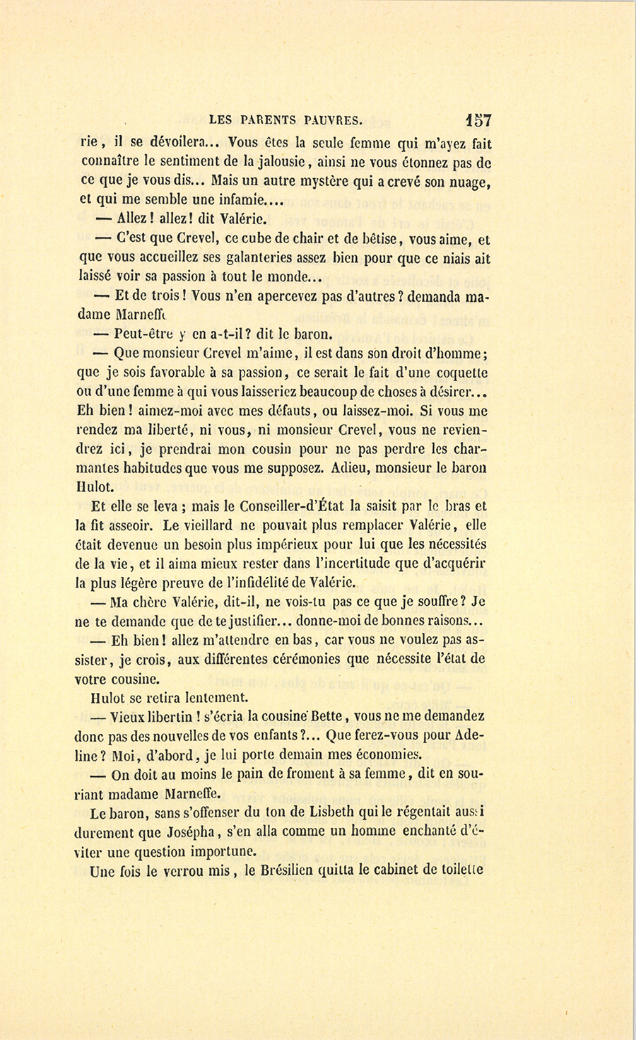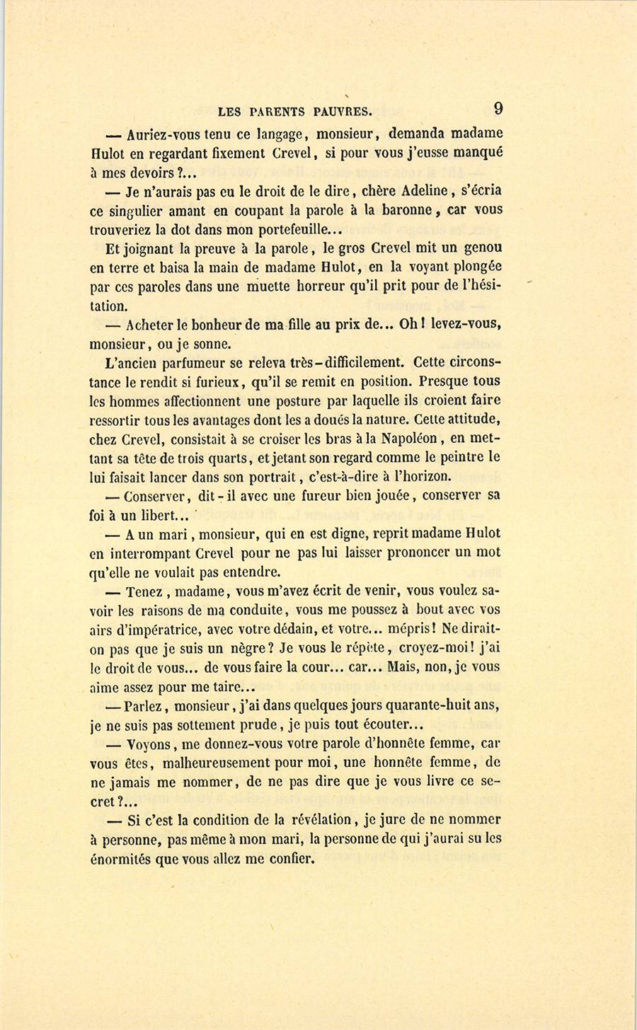 {p. 9} – Auriez-vous tenu ce langage, monsieur, demanda madame Hulot en regardant fixement Crevel, si pour vous j’eusse manqué à mes devoirs ?…