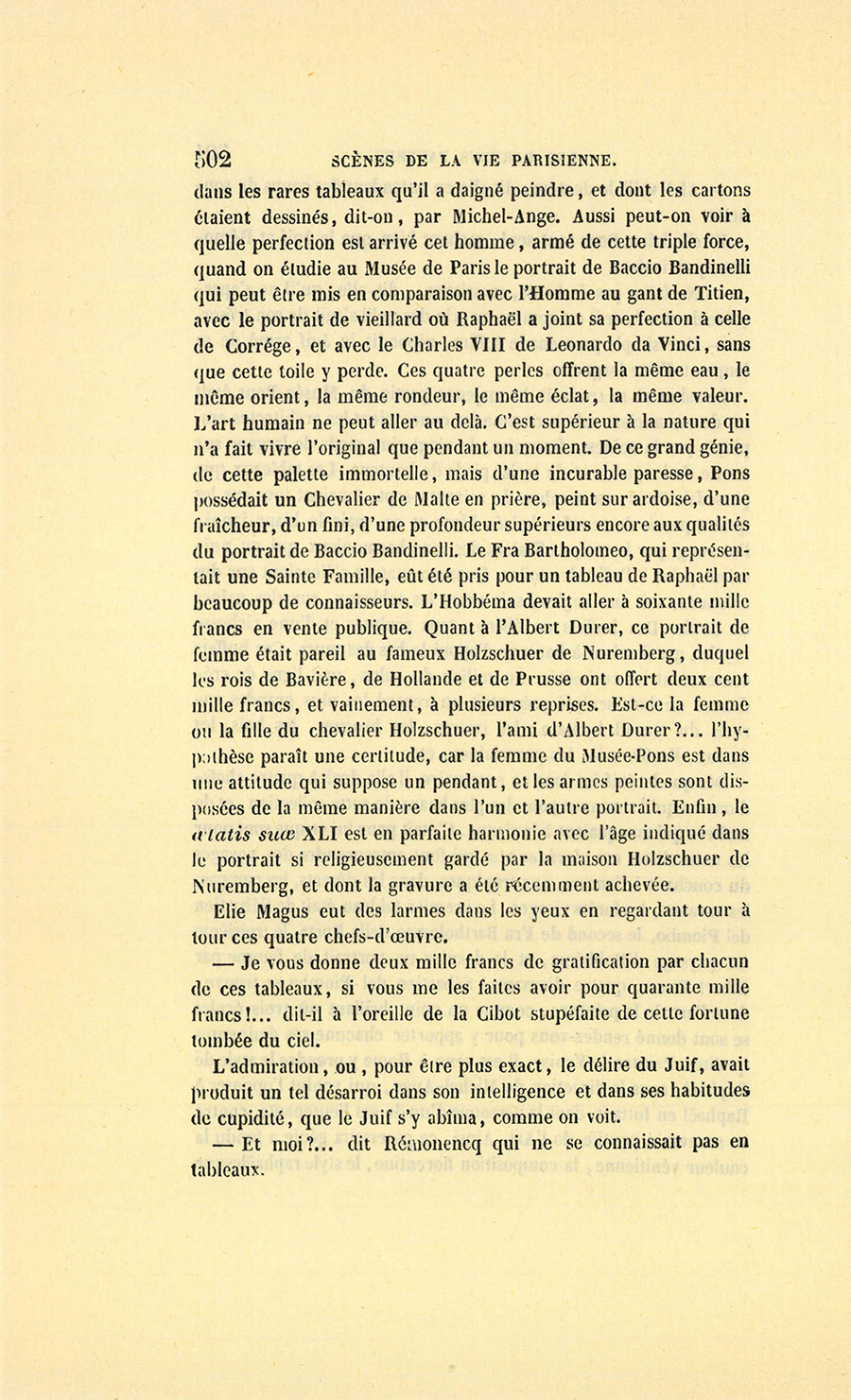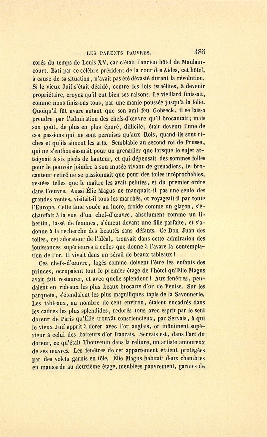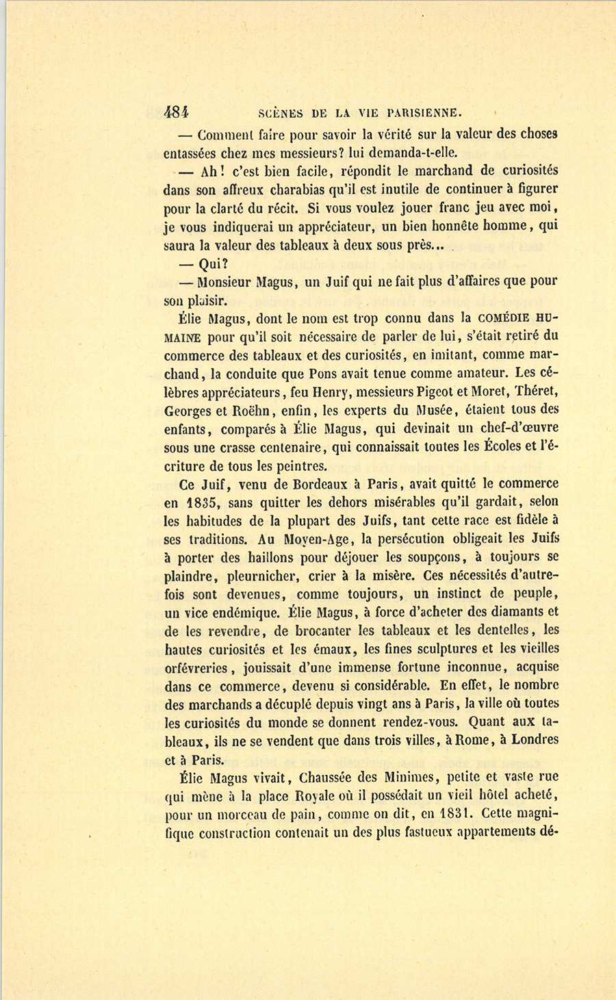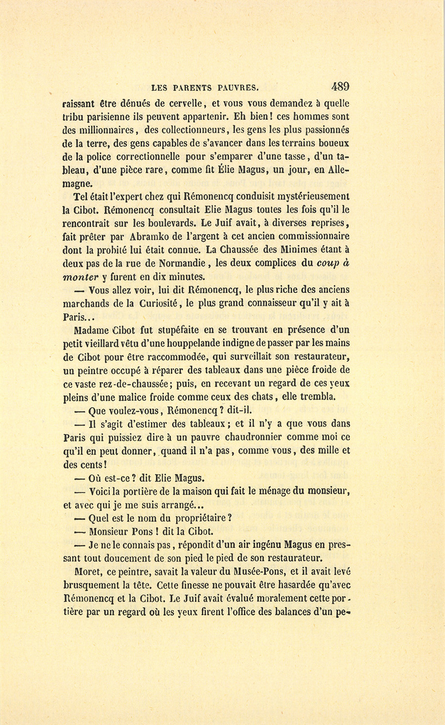 – Oh ! milord, dit modestement le comte Popinot, en fait de tableaux, personne, je ne dirai pas à Paris, mais en Europe, ne peut se flatter de rivaliser avec un inconnu, un Juif nommé Élie Magus, vieillard maniaque, le chef des tableaumanes. Il a réuni cent et quelques tableaux qui sont à décourager les amateurs d’entreprendre des collections. La France devrait sacrifier sept à huit millions et acquérir cette galerie à la mort de ce richard… Quant aux curiosités, ma collection est assez belle pour qu’on en parle…