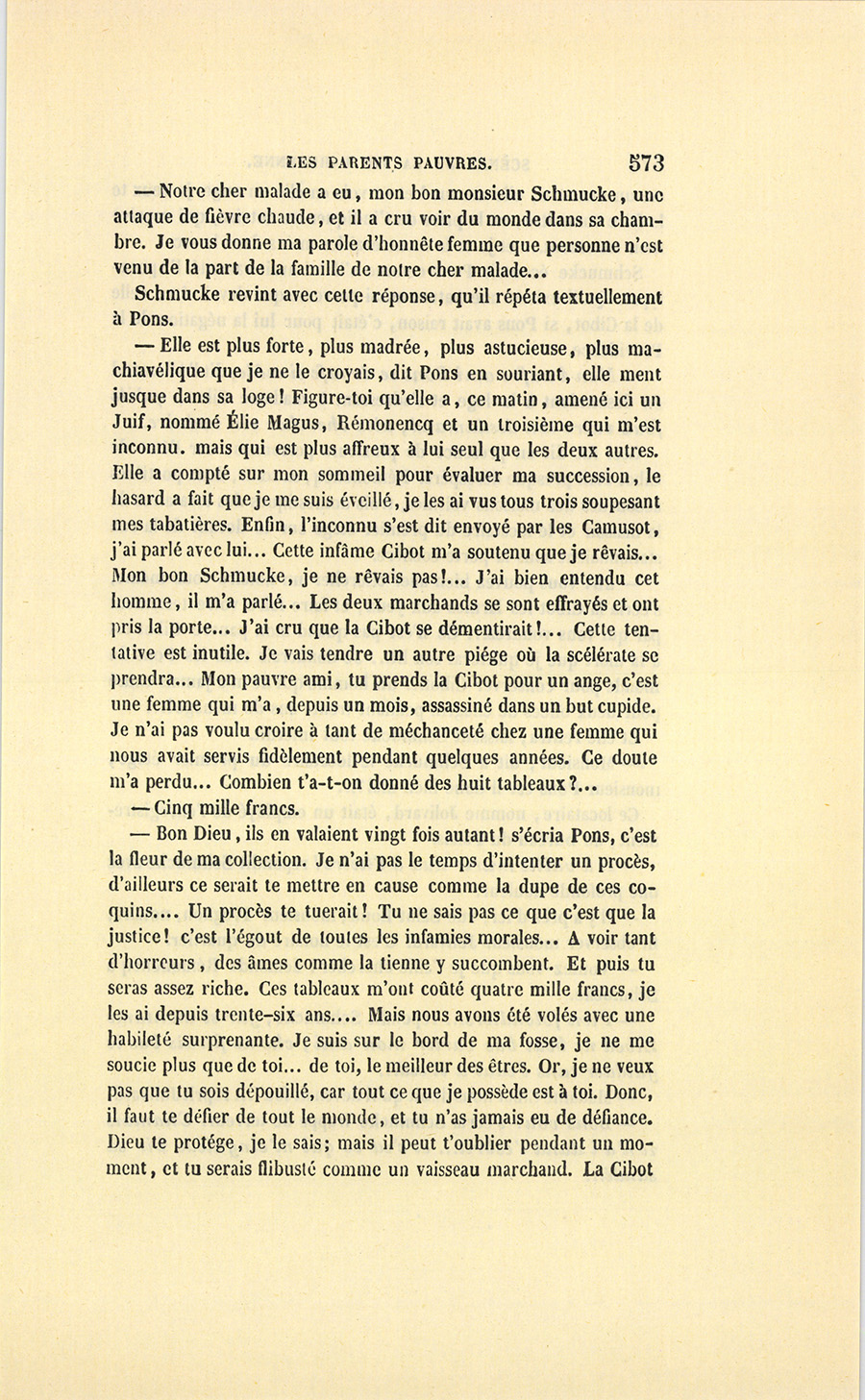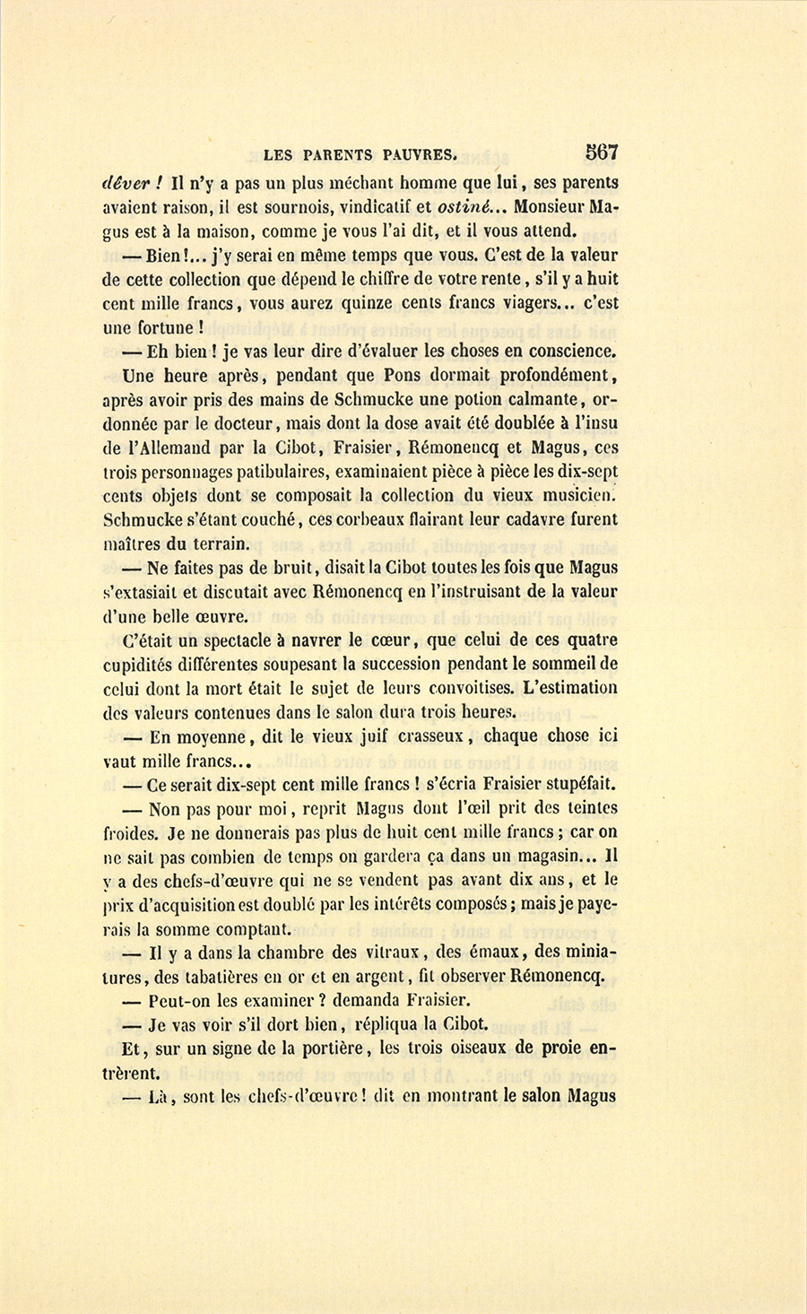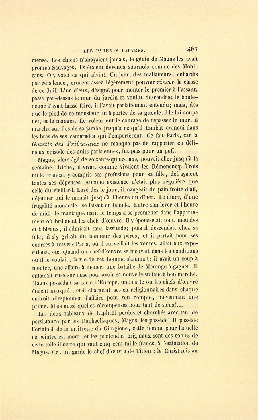– Oh ! milord, dit modestement le comte Popinot, en fait de tableaux, personne, je ne dirai pas à Paris, mais en Europe, ne peut se flatter de rivaliser avec un inconnu, un Juif nommé Élie Magus, vieillard maniaque, le chef des tableaumanes. Il a réuni cent et quelques tableaux qui sont à décourager les amateurs d’entreprendre des collections. La France devrait sacrifier sept à huit millions et acquérir cette galerie à la mort de ce richard… Quant aux curiosités, ma collection est assez belle pour qu’on en parle…