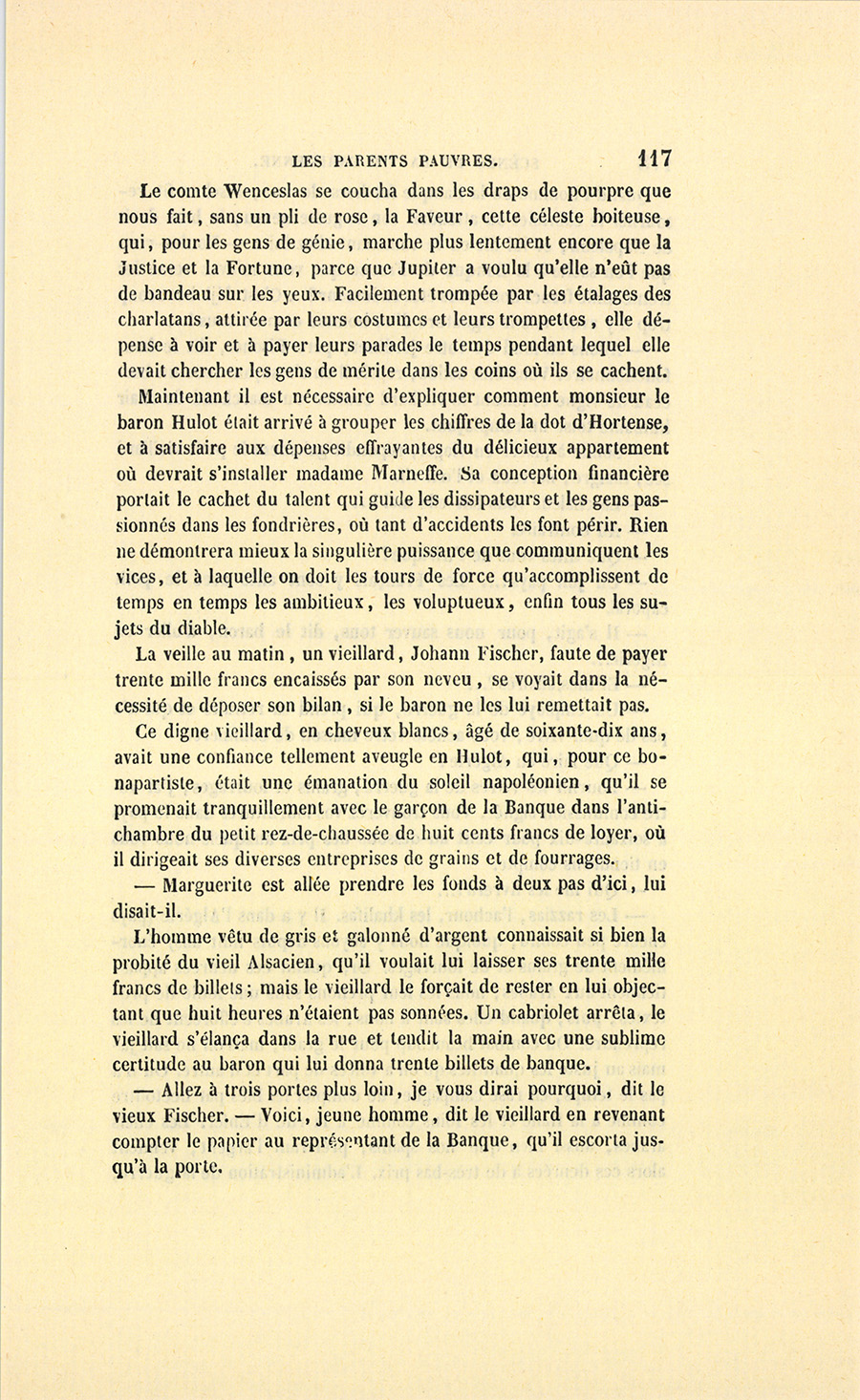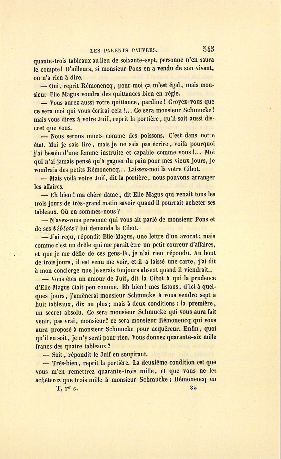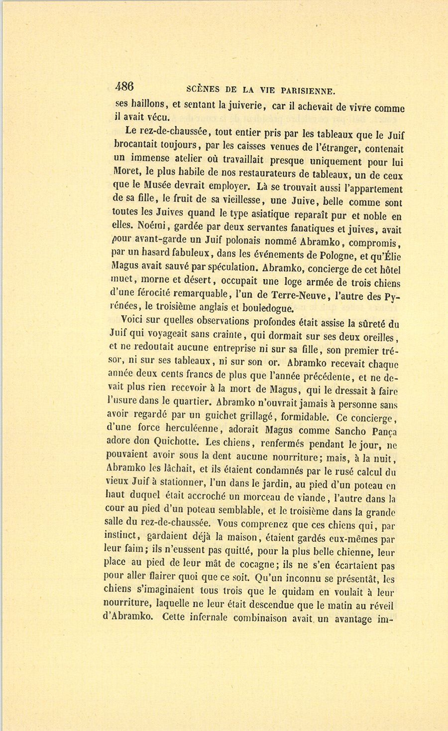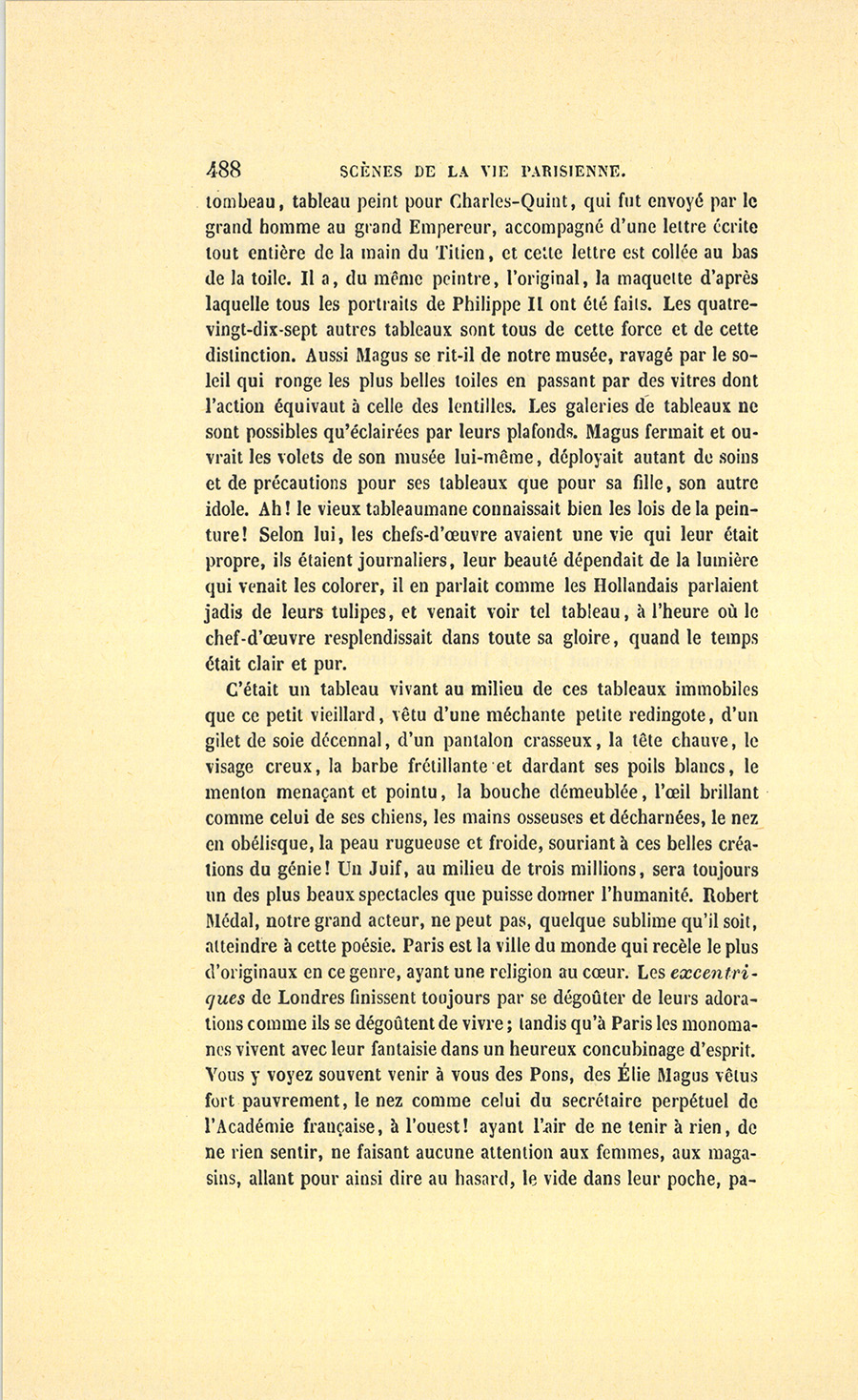 – Oh ! milord, dit modestement le comte Popinot, en fait de tableaux, personne, je ne dirai pas à Paris, mais en Europe, ne peut se flatter de rivaliser avec un inconnu, un Juif nommé Élie Magus, vieillard maniaque, le chef des tableaumanes. Il a réuni cent et quelques tableaux qui sont à décourager les amateurs d’entreprendre des collections. La France devrait sacrifier sept à huit millions et acquérir cette galerie à la mort de ce richard… Quant aux curiosités, ma collection est assez belle pour qu’on en parle…