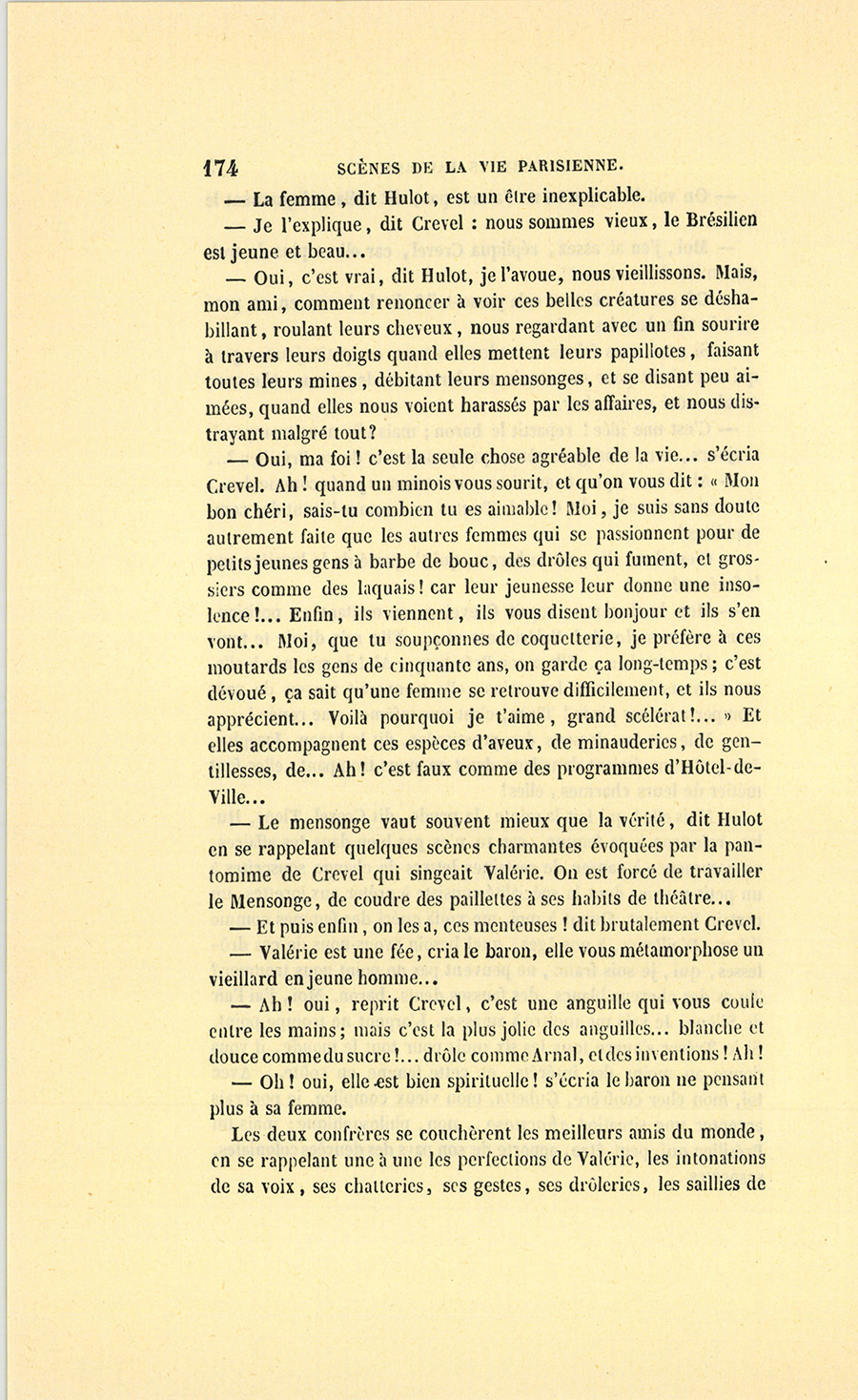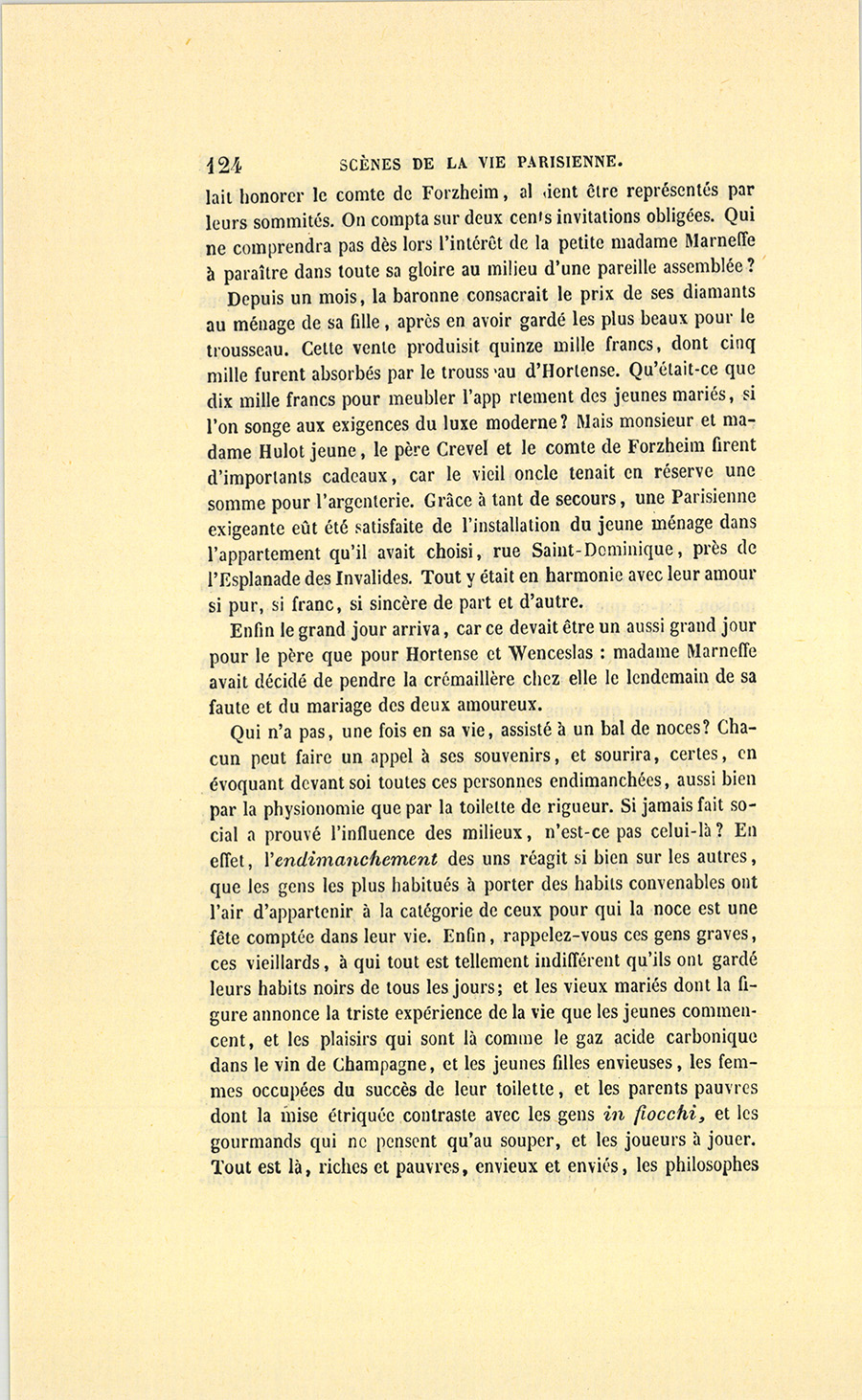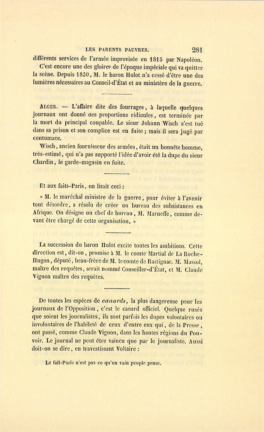 {p. 3} Dans le nombre de ces Parisiens accusés d’être si spirituels, il s’en trouve qui se croient infiniment mieux en uniforme que dans leurs habits ordinaires, et qui supposent chez les femmes des goûts assez dépravés pour imaginer qu’elles seront favorablement impressionnées à l’aspect d’un bonnet à poil et par le harnais militaire.
