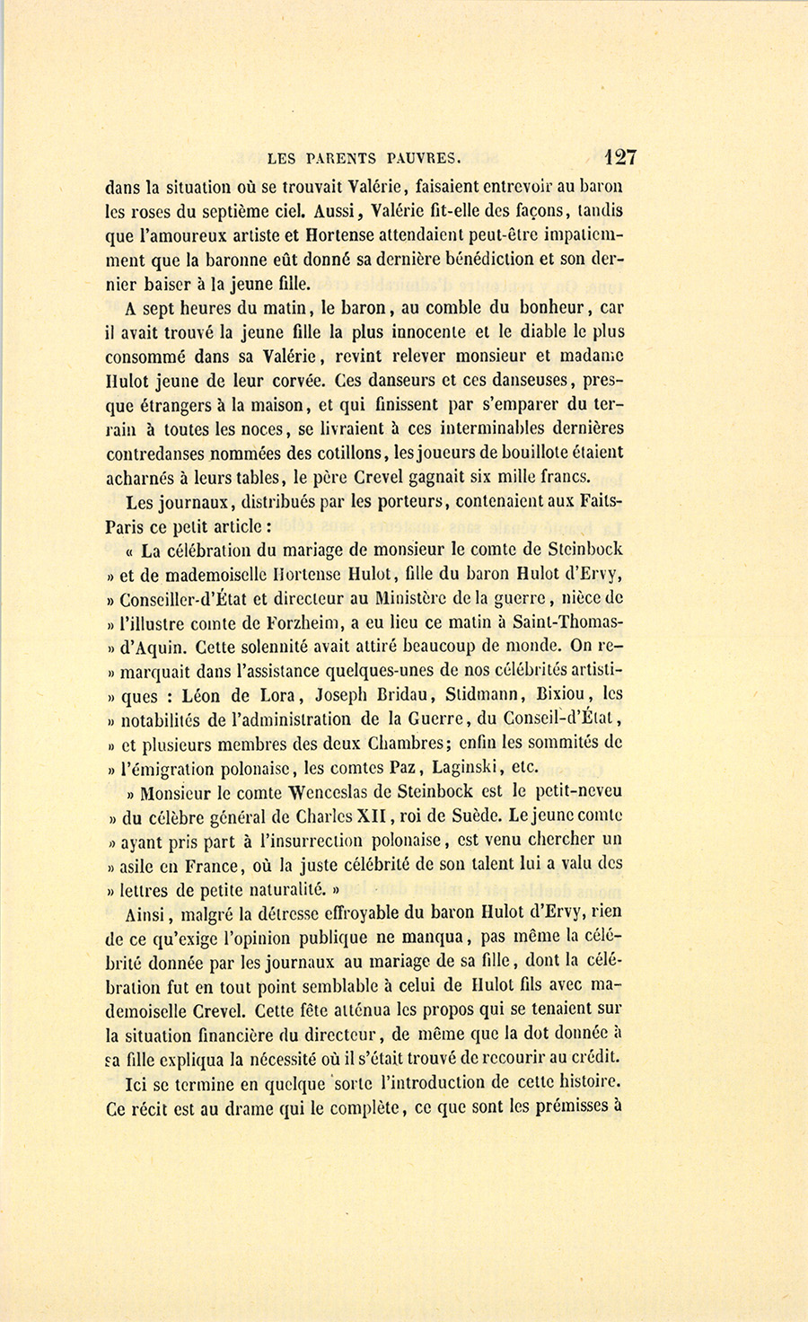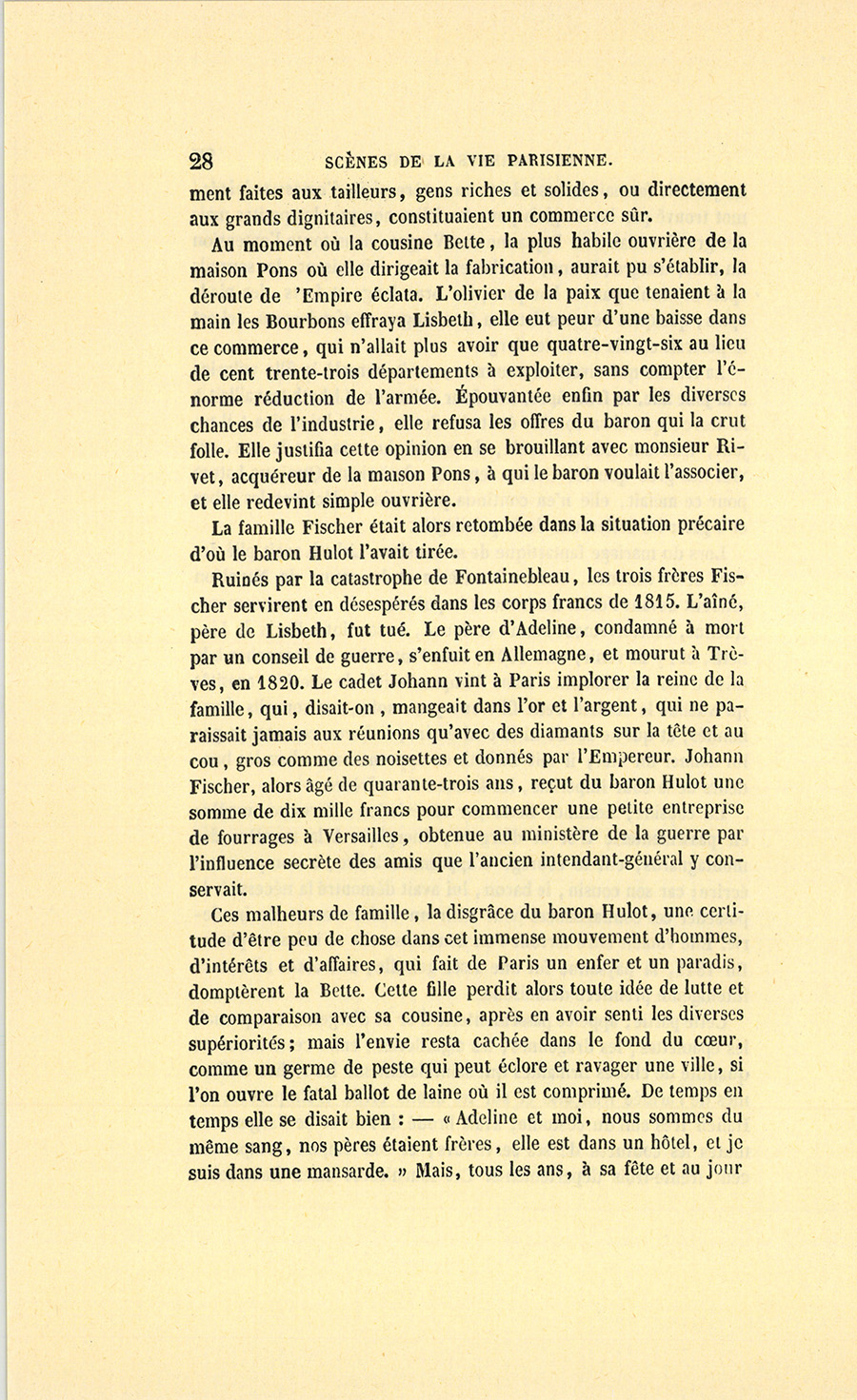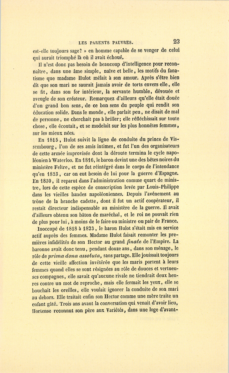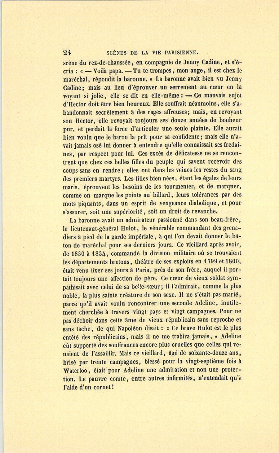 Ce baron Hulot s’était nommé lui-même d’Ervy, lieu de sa naissance, pour se distinguer de son frère, le célèbre général Hulot, colonel des grenadiers de la garde impériale, que l’Empereur avait créé comte de Forzheim, après la campagne de 1809. Le frère {p. 4} aîné, le comte, chargé de prendre soin de son frère cadet, l’avait, par prudence paternelle, placé dans l’administration militaire où, grâce à leurs doubles services, le baron obtint et mérita la faveur de Napoléon. Dès 1807, le baron Hulot était intendant-général des armées en Espagne.