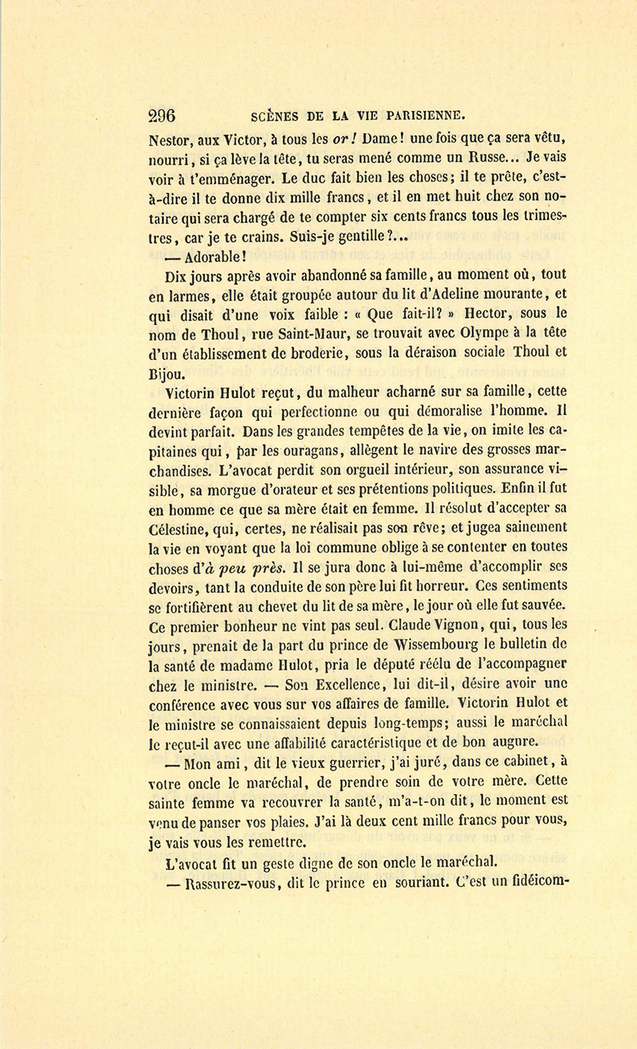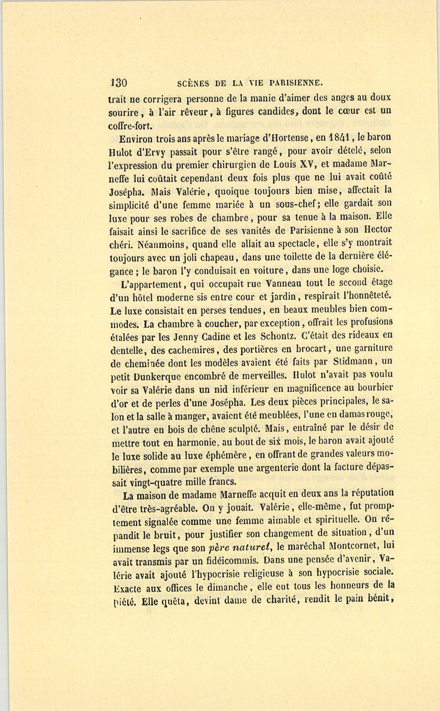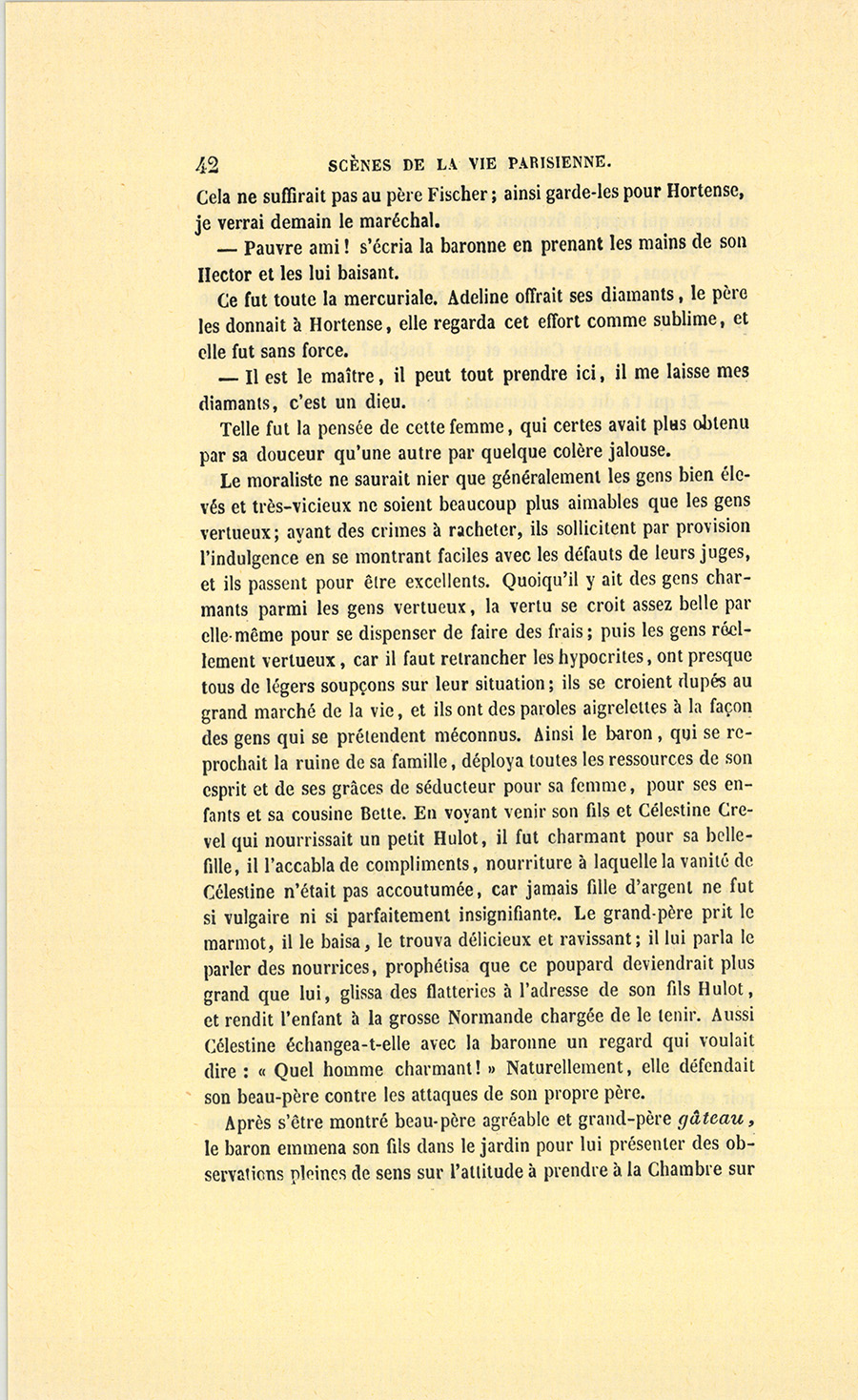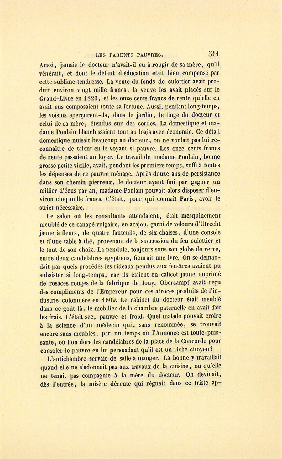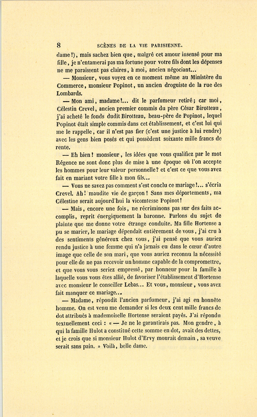 – Ah ! nous y voici, madame. Je suis un épicier, un boutiquier, un ancien débitant de pâte d’amande, d’eau de Portugal, d’huile céphalique, on doit me trouver bien honoré d’avoir marié ma fille unique au fils de monsieur le baron Hulot d’Ervy, ma fille sera baronne. C’est Régence, c’est Louis XV, Œil-de-Bœuf ! c’est très-bien… J’aime Célestine comme on aime une fille unique, je l’aime tant que, pour ne lui donner ni frère ni sœur, j’ai accepté tous les inconvénients du veuvage à Paris (et dans la force de l’âge, {p. 8} madame !), mais sachez bien que, malgré cet amour insensé pour ma fille, je n’entamerai pas ma fortune pour votre fils dont les dépenses ne me paraissent pas claires, à moi, ancien négociant…