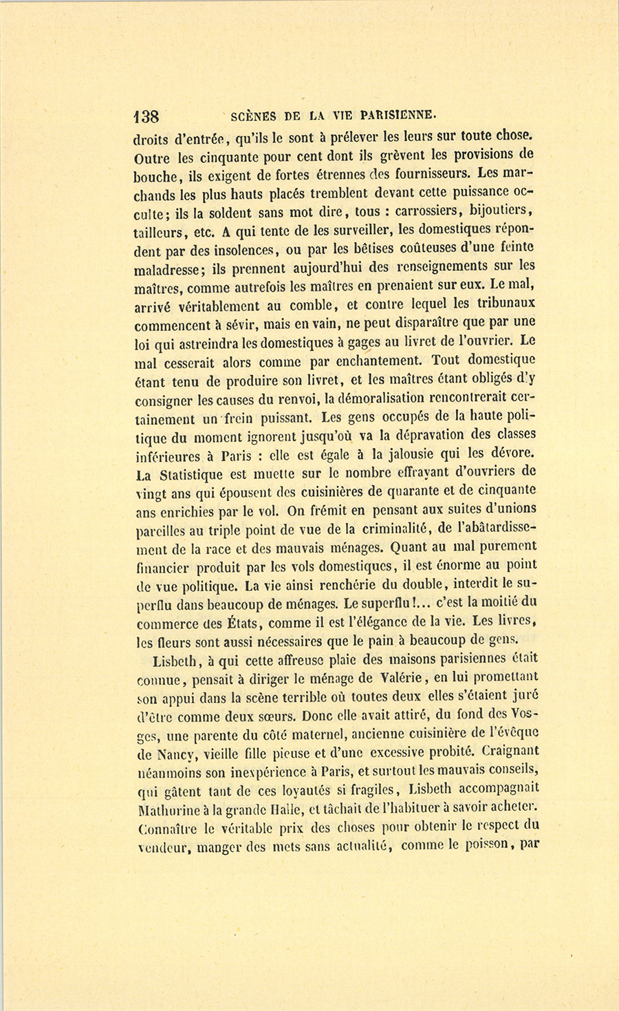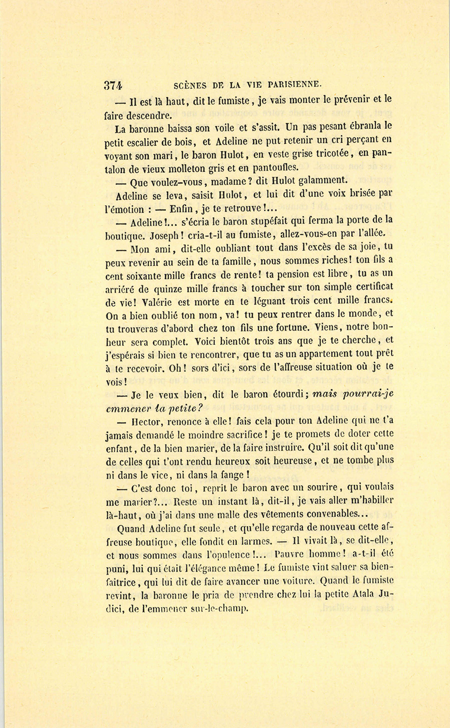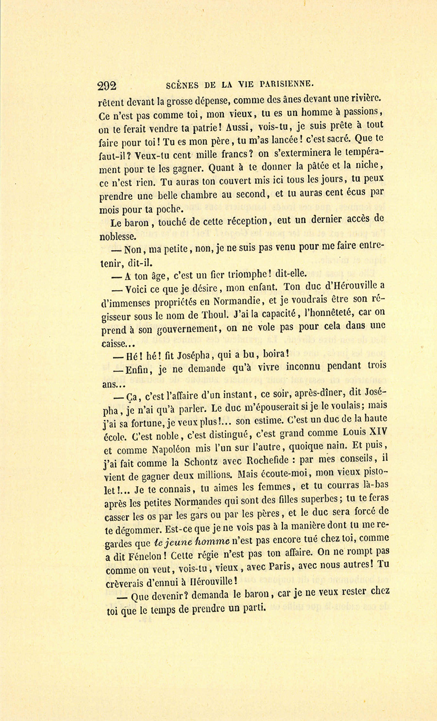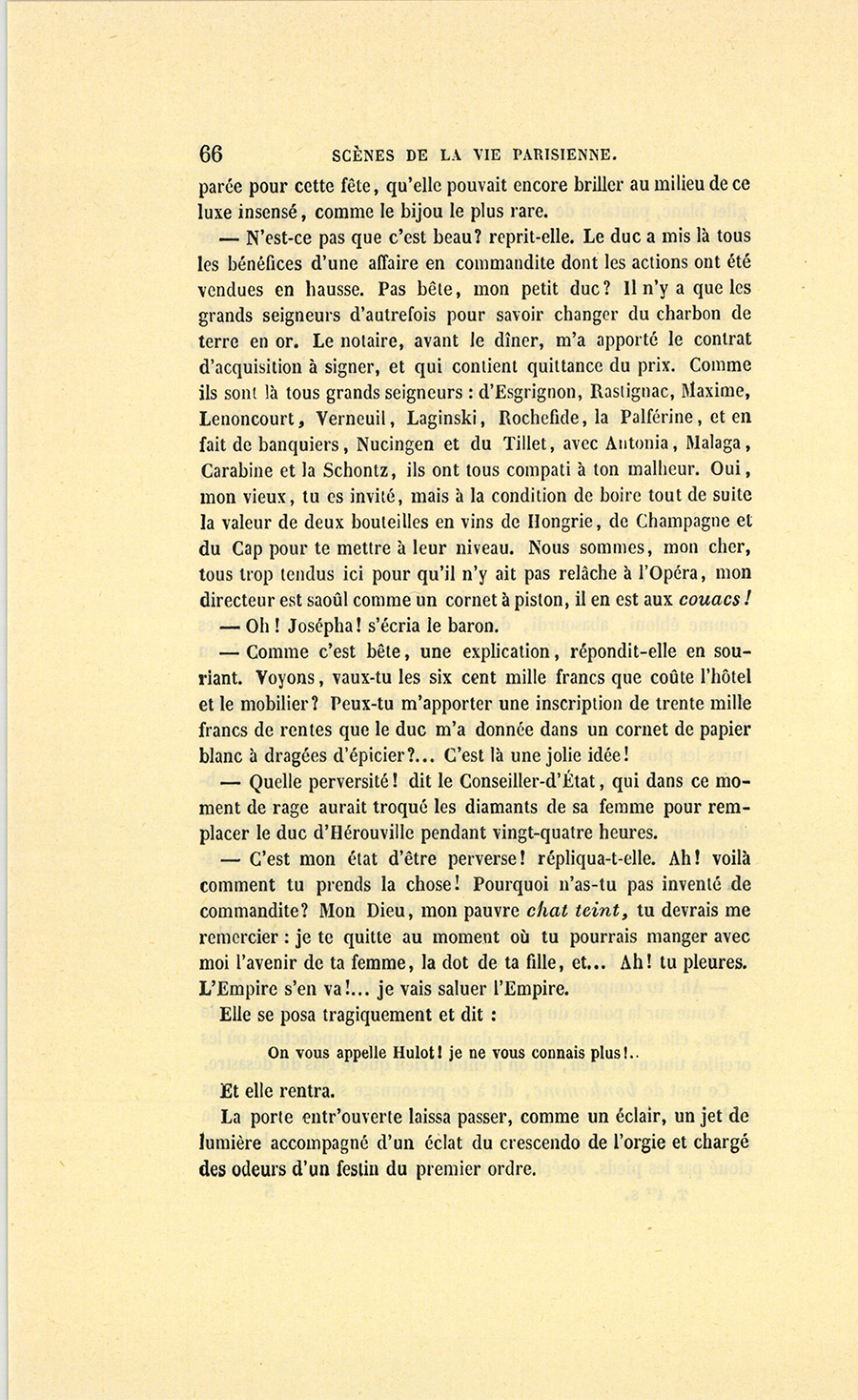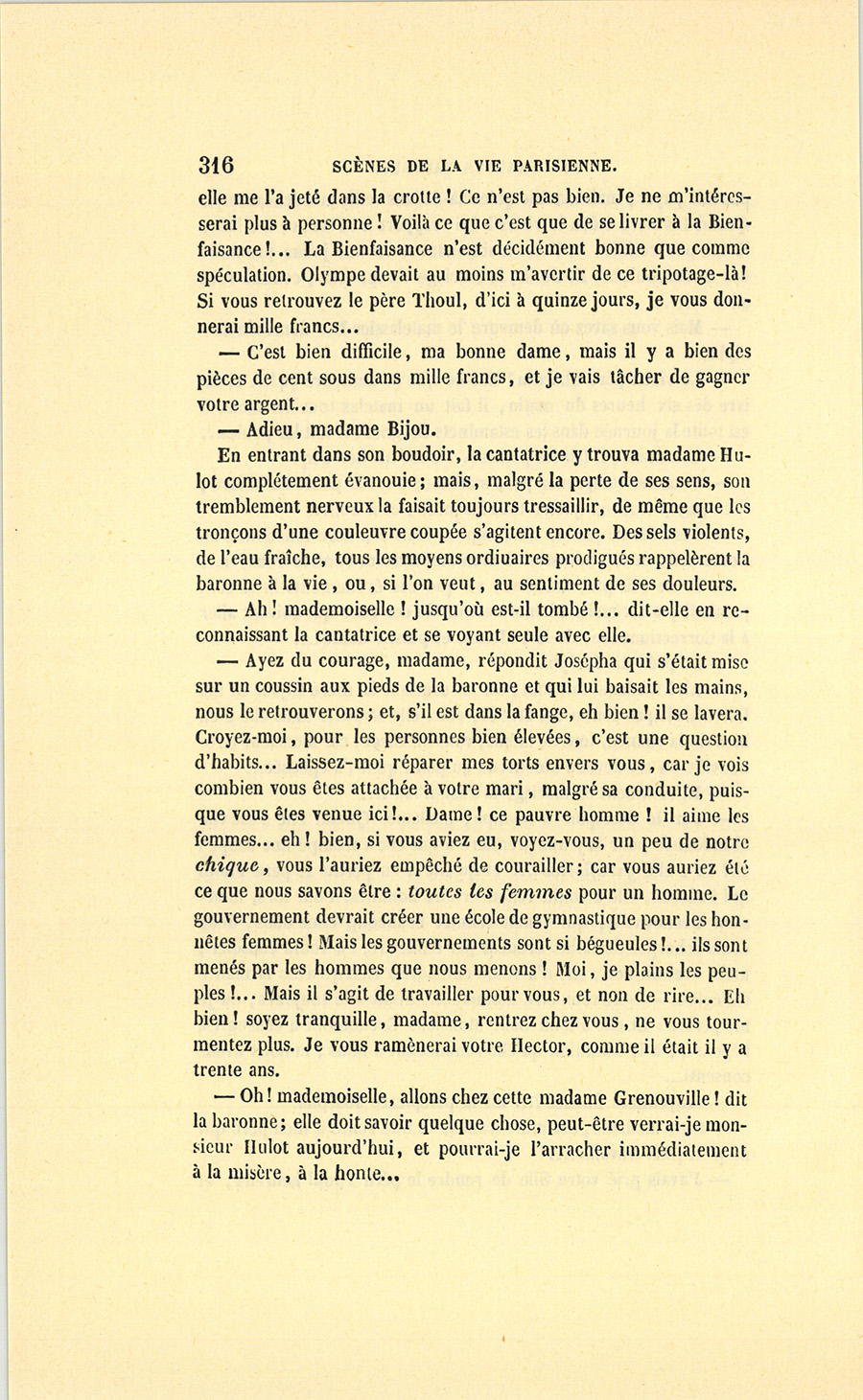 – Ah ! nous y voici, madame. Je suis un épicier, un boutiquier, un ancien débitant de pâte d’amande, d’eau de Portugal, d’huile céphalique, on doit me trouver bien honoré d’avoir marié ma fille unique au fils de monsieur le baron Hulot d’Ervy, ma fille sera baronne. C’est Régence, c’est Louis XV, Œil-de-Bœuf ! c’est très-bien… J’aime Célestine comme on aime une fille unique, je l’aime tant que, pour ne lui donner ni frère ni sœur, j’ai accepté tous les inconvénients du veuvage à Paris (et dans la force de l’âge, {p. 8} madame !), mais sachez bien que, malgré cet amour insensé pour ma fille, je n’entamerai pas ma fortune pour votre fils dont les dépenses ne me paraissent pas claires, à moi, ancien négociant…