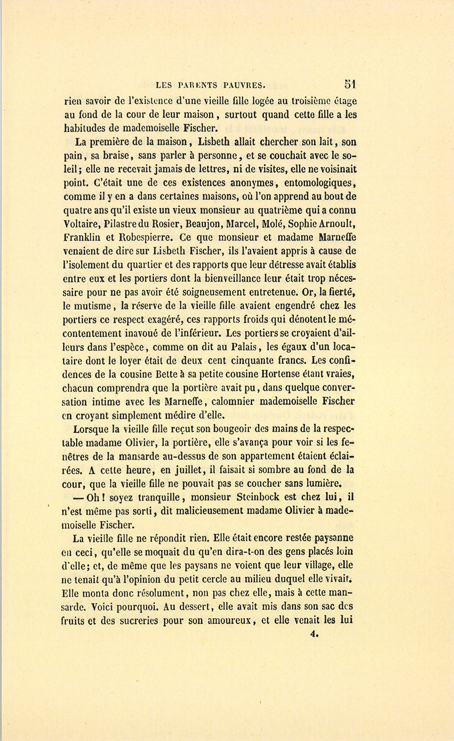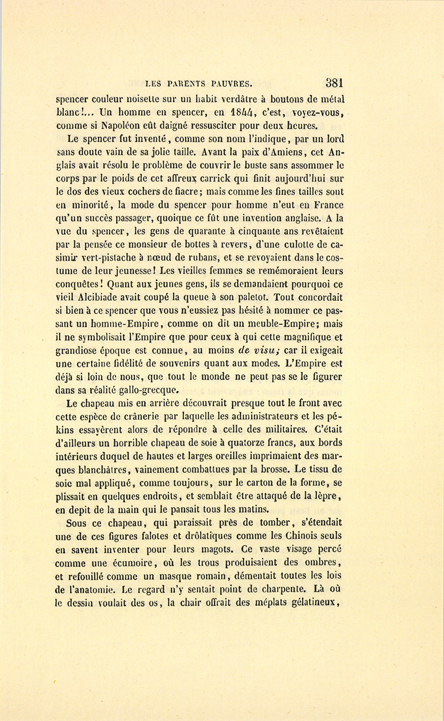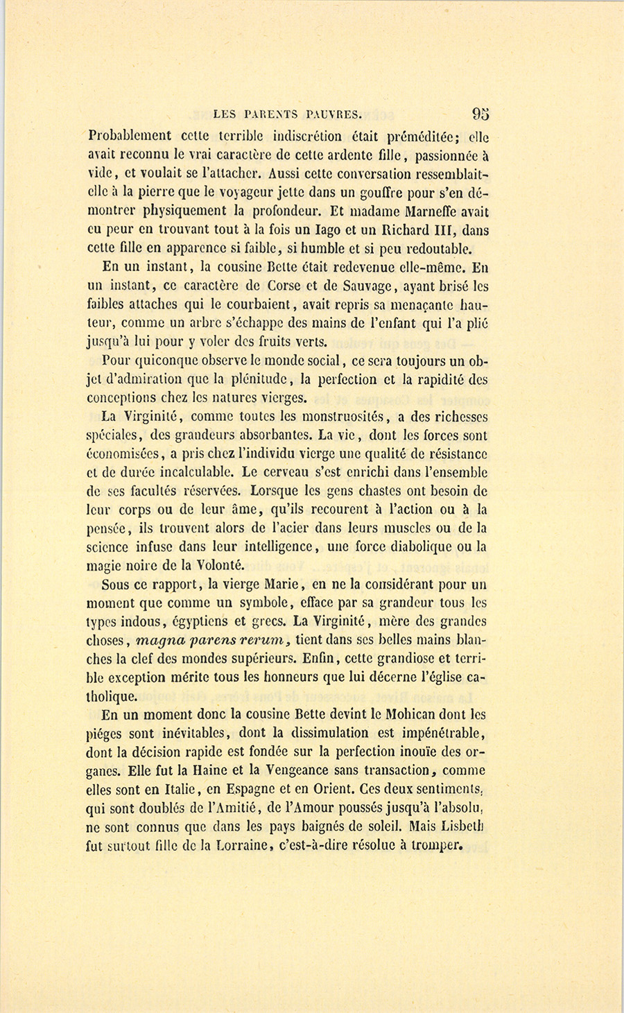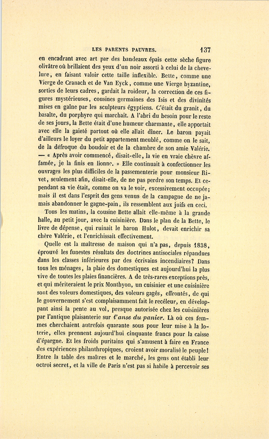 Cette vieille fille portait une robe de mérinos, couleur raisin de Corinthe, dont la coupe et les lisérés dataient de la Restauration, une collerette brodée qui pouvait valoir trois francs, un chapeau de paille cousue à coques de satin bleu bordées de paille comme on en voit aux revendeuses de la halle. À l’aspect de souliers en peau de chèvre dont la façon annonçait un cordonnier du dernier ordre, un étranger aurait hésité à saluer la cousine Bette comme une parente de la maison, car elle ressemblait tout à fait à une couturière en journée. Néanmoins la vieille fille ne sortit pas sans faire un petit salut affectueux à monsieur Crevel, auquel ce personnage répondit par un signe d’intelligence.
