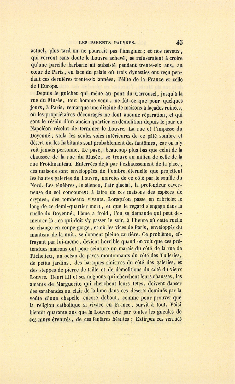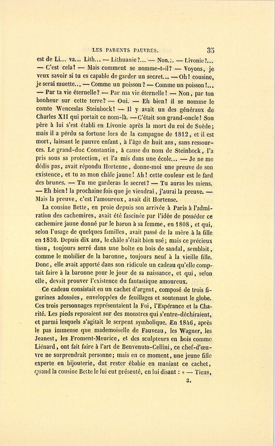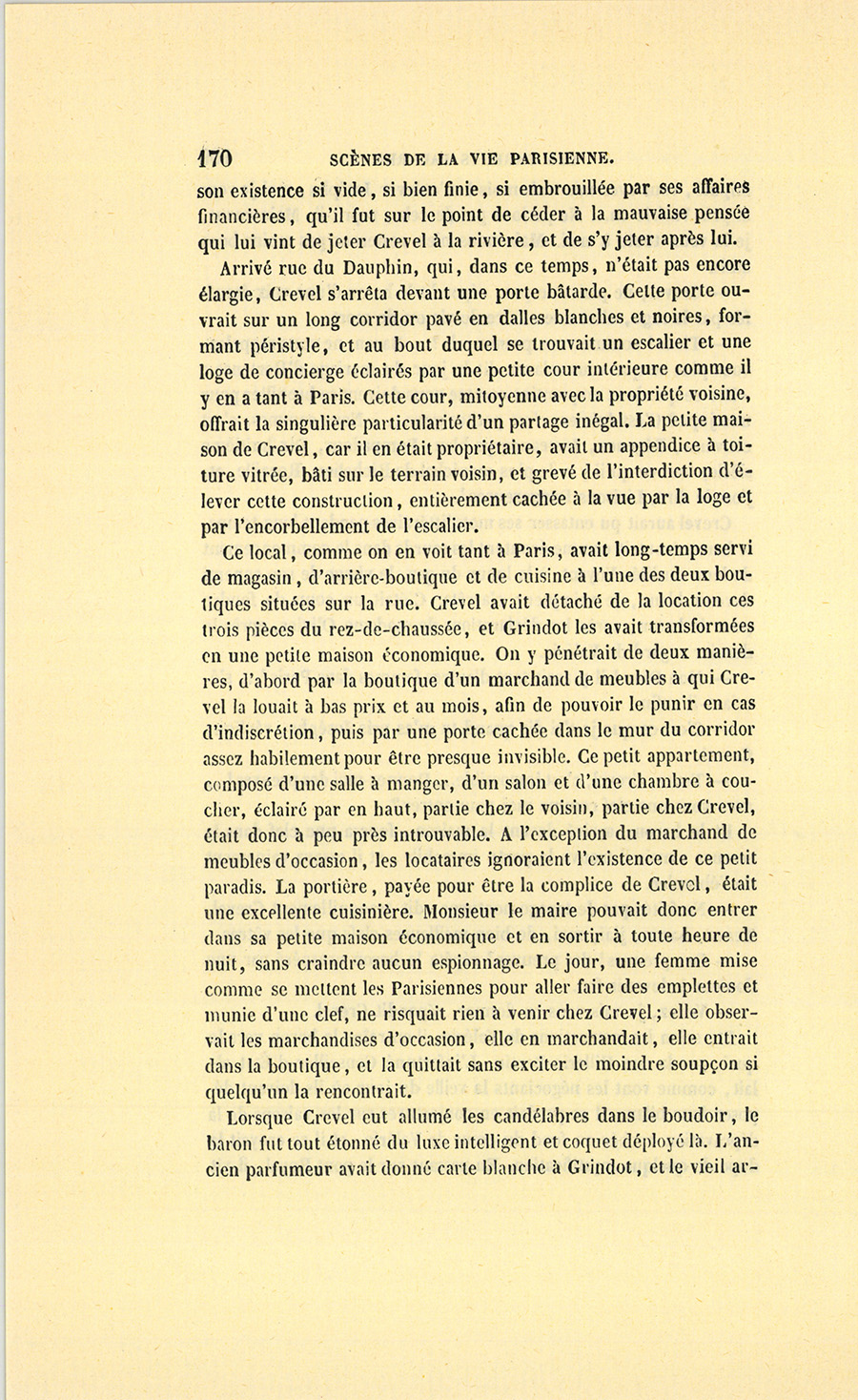 Après s’être jetée sur un petit canapé, qui certes avait été fort beau vers 1809, la baronne indiquant à Crevel un fauteuil dont les {p. 6} bras étaient terminés par des têtes de sphinx bronzées dont la peinture s’en allait par écailles en laissant voir le bois par places, lui fit signe de s’asseoir.