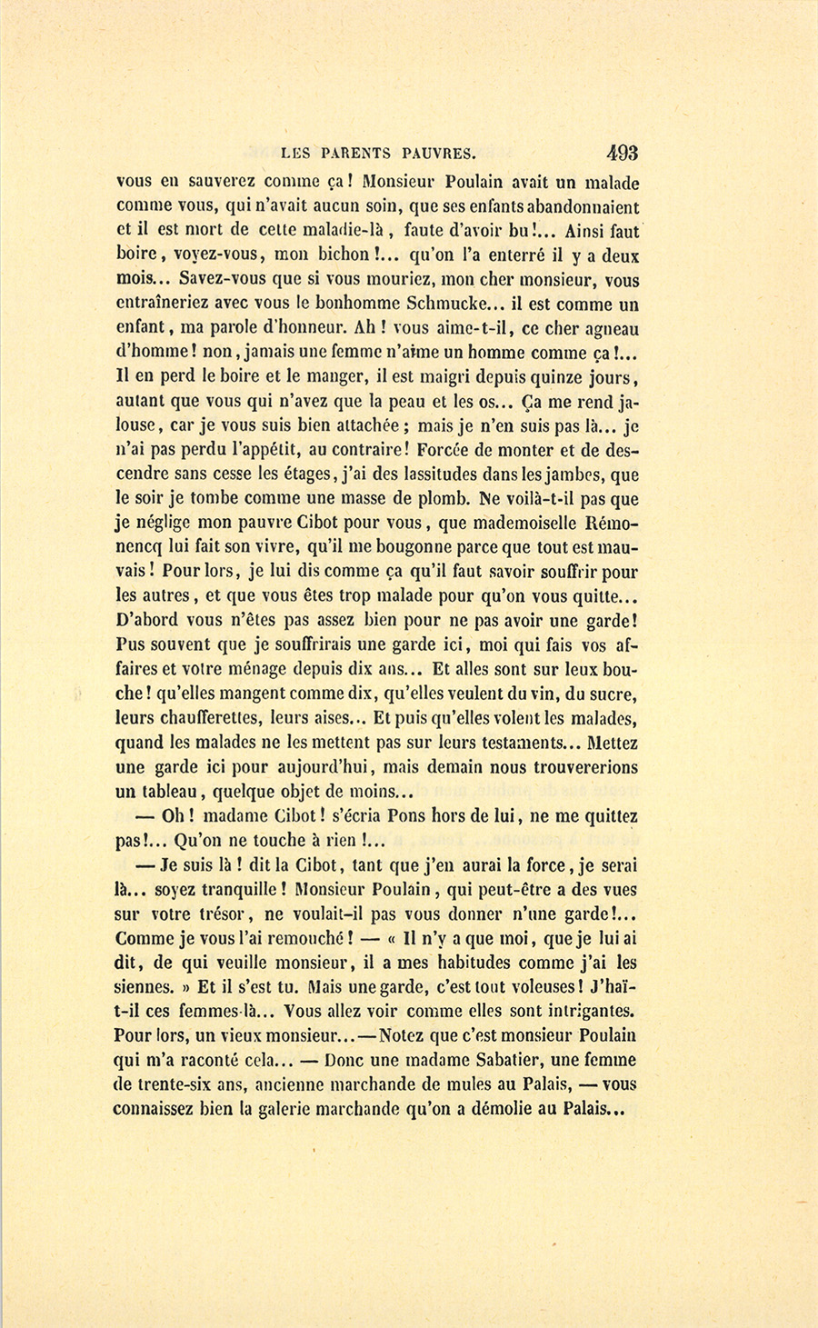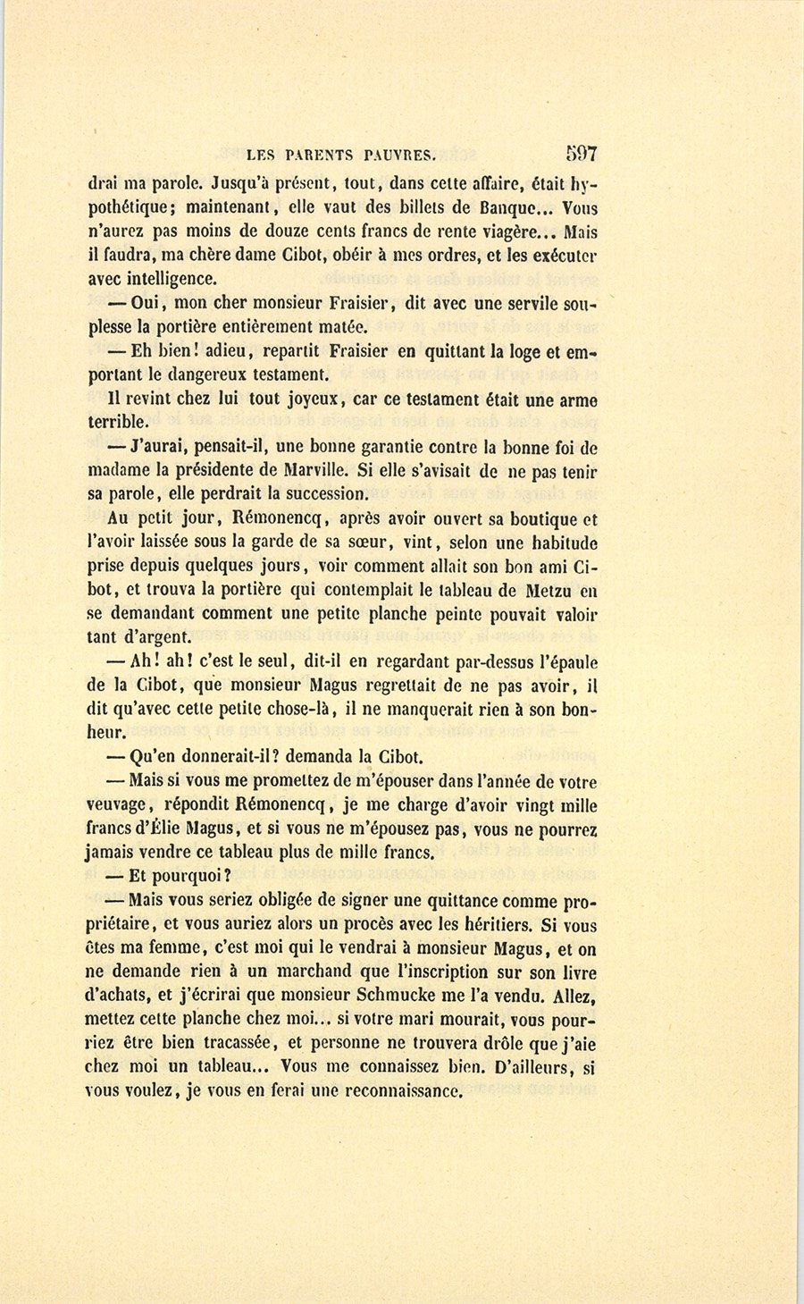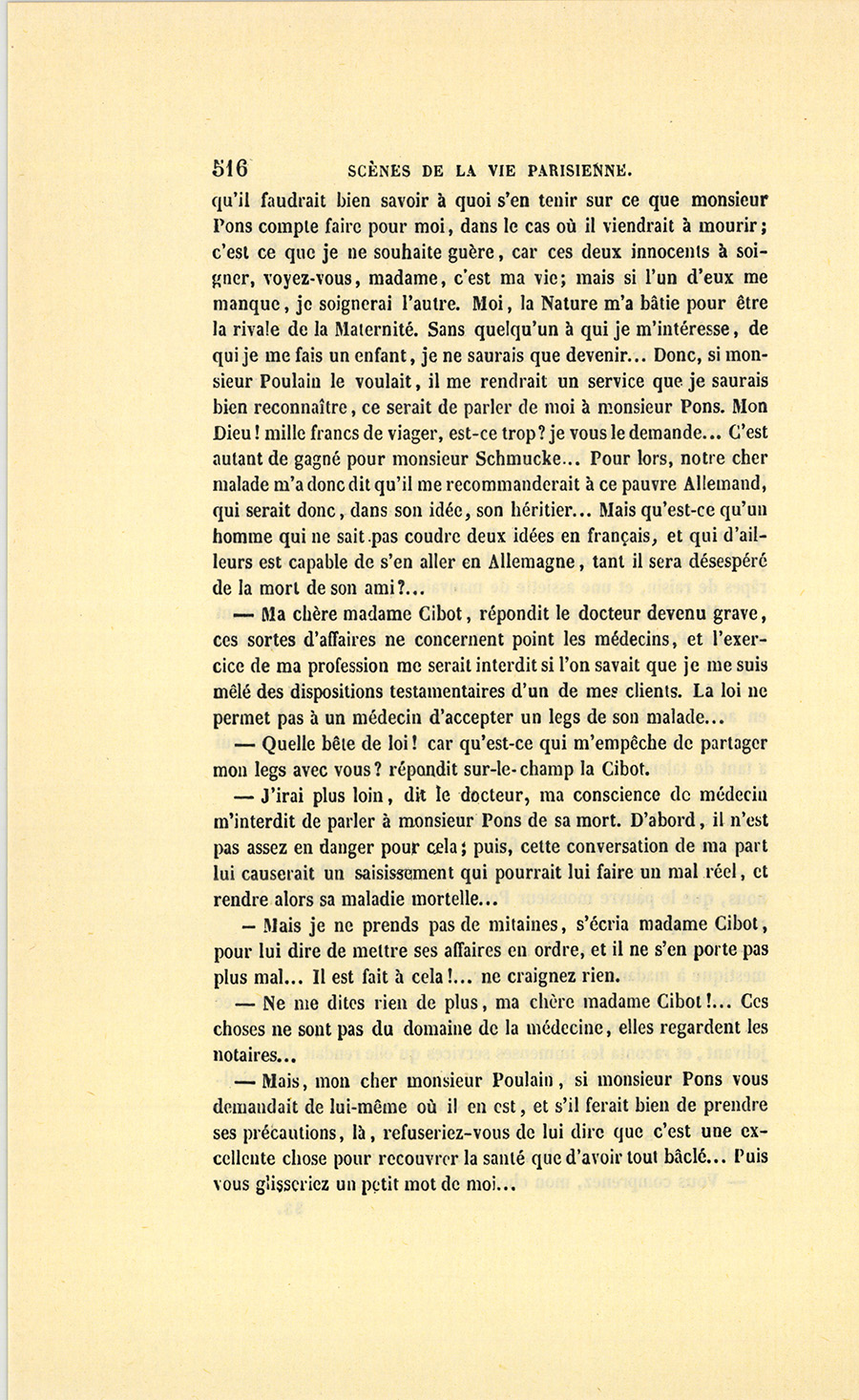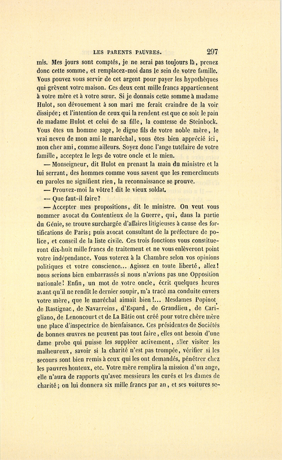 – Eh bien ! madame, je vous ai déjà débarrassée des soixante mille francs que je calculais devoir être donnés à cette ignoble portière, cette madame Cibot. Mais je tiens toujours à avoir le débit de tabac pour la femme Sauvage, et la nomination de mon ami Poulain à la place vacante de médecin en chef des Quinze-Vingts.
