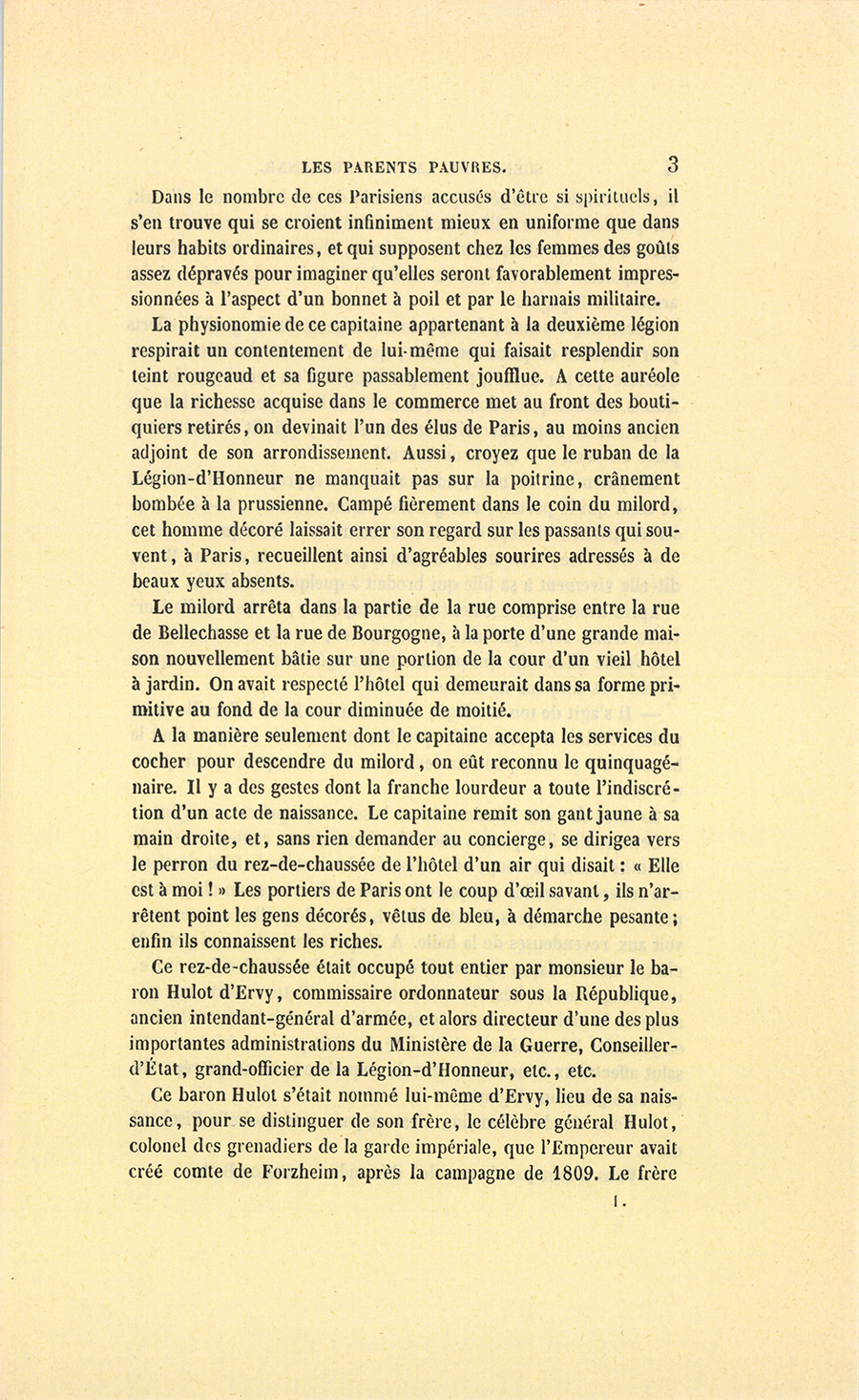 Ce rez-de-chaussée était occupé tout entier par monsieur le baron Hulot d’Ervy, commissaire ordonnateur sous la République, ancien intendant-général d’armée, et alors directeur d’une des plus importantes administrations du Ministère de la Guerre, Conseiller-d’État, grand-officier de la Légion-d’Honneur, etc., etc.