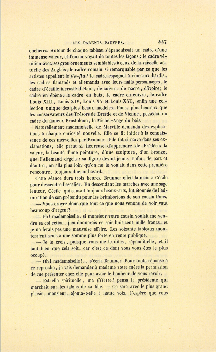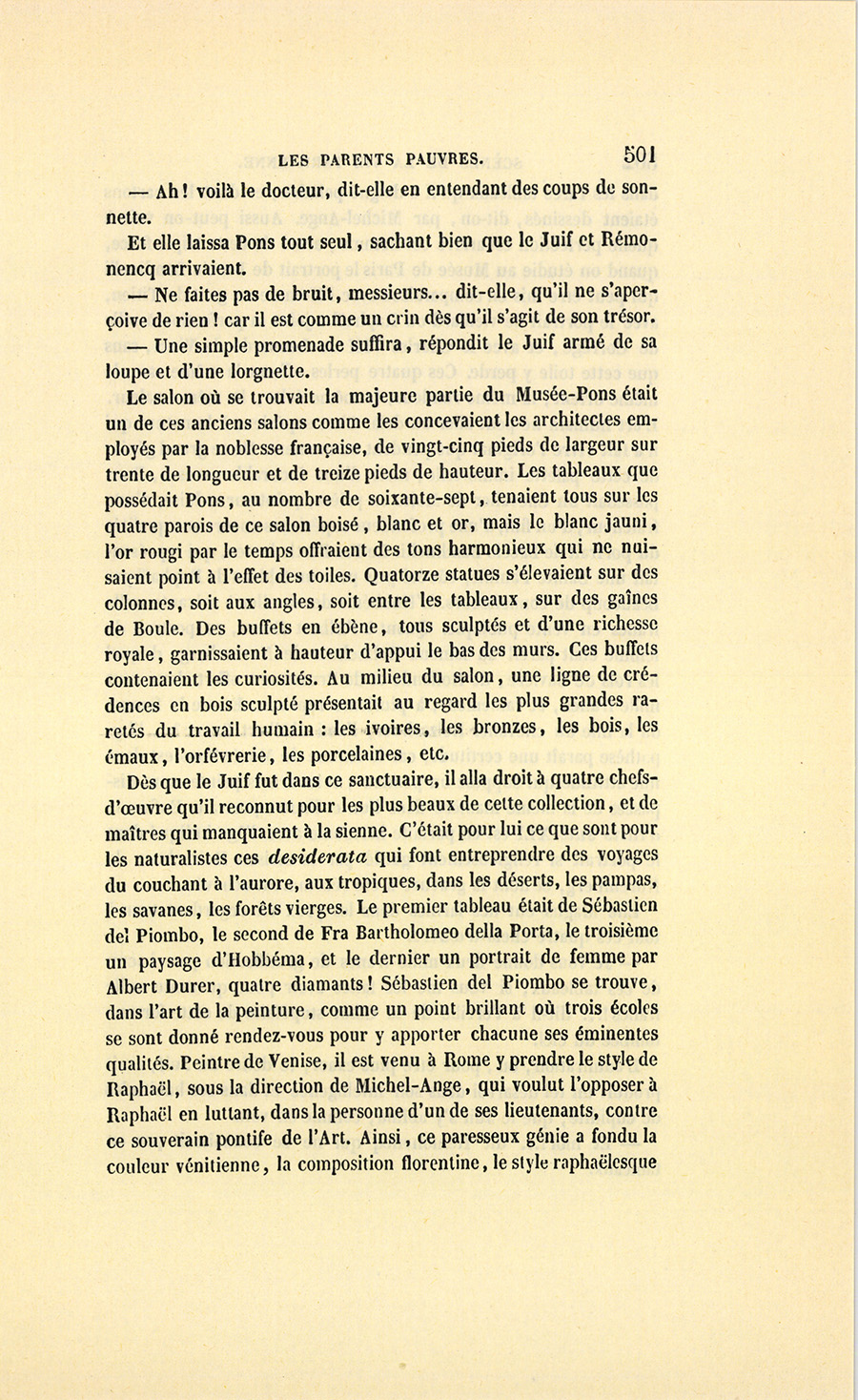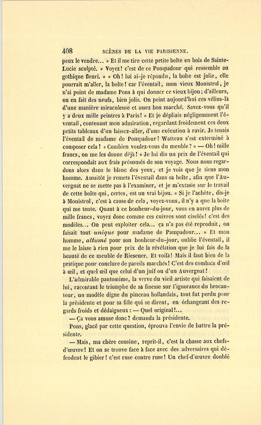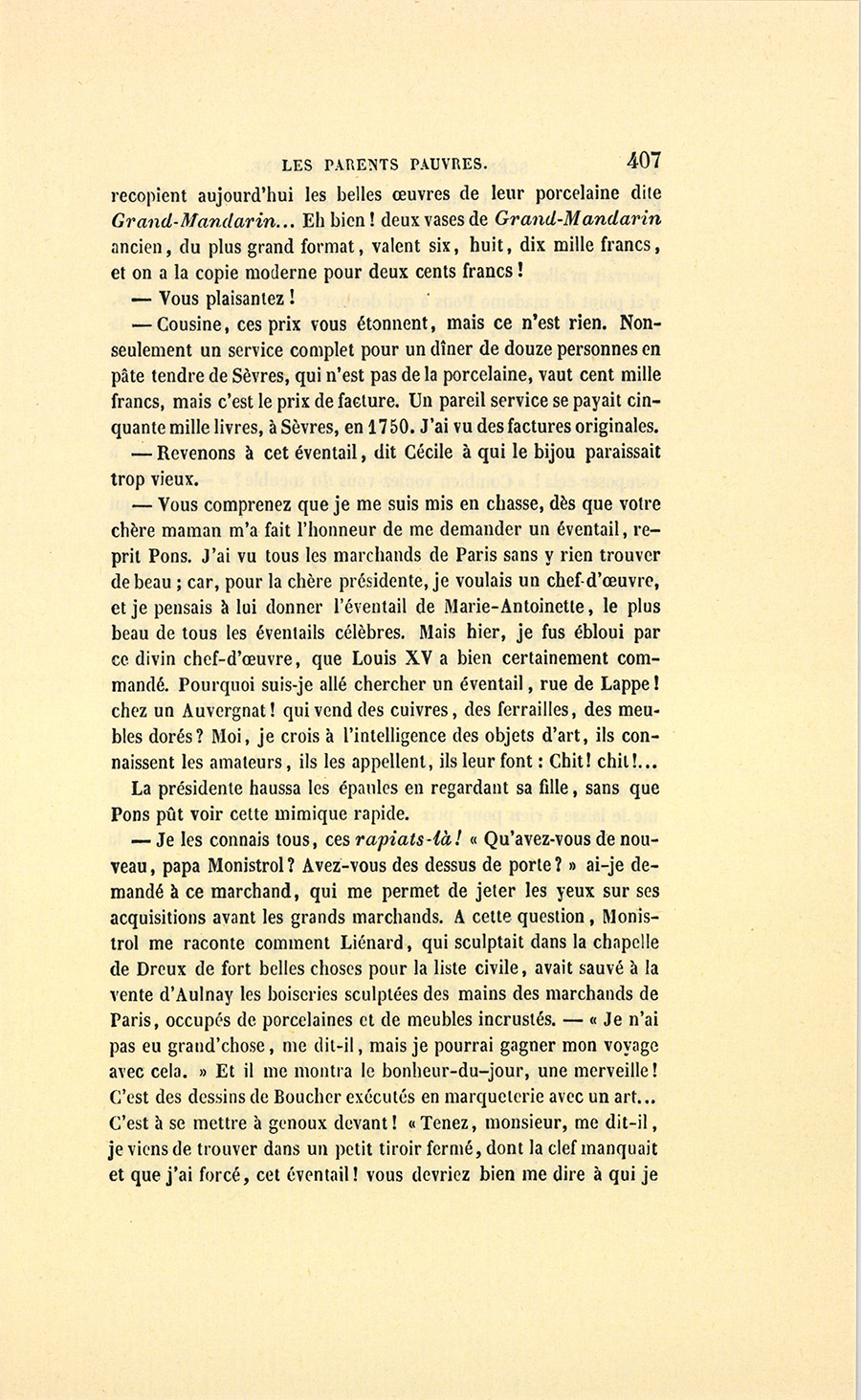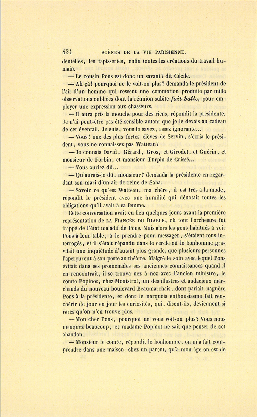 Tout le monde désirera sans doute savoir ce qu’est devenue l’héroïne de cette histoire, malheureusement trop véridique dans ses détails, et qui, superposée à la précédente, dont elle est la sœur jumelle, prouve que la grande force sociale est le caractère. Vous devinez, ô amateurs, connaisseurs et marchands, qu’il s’agit de la collection de Pons ! Il suffira d’assister à une conversation tenue chez le comte Popinot, qui montrait, il y a peu de jours, sa magnifique collection à des étrangers.