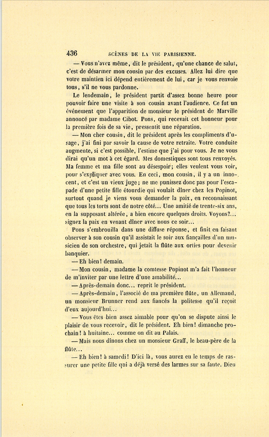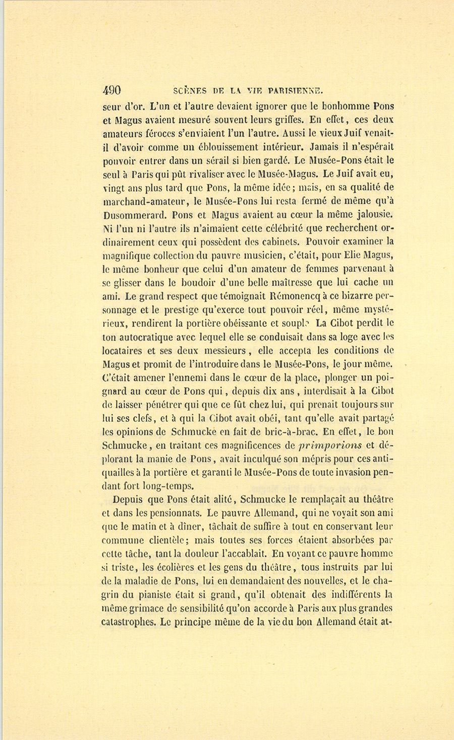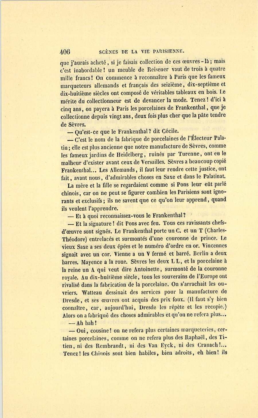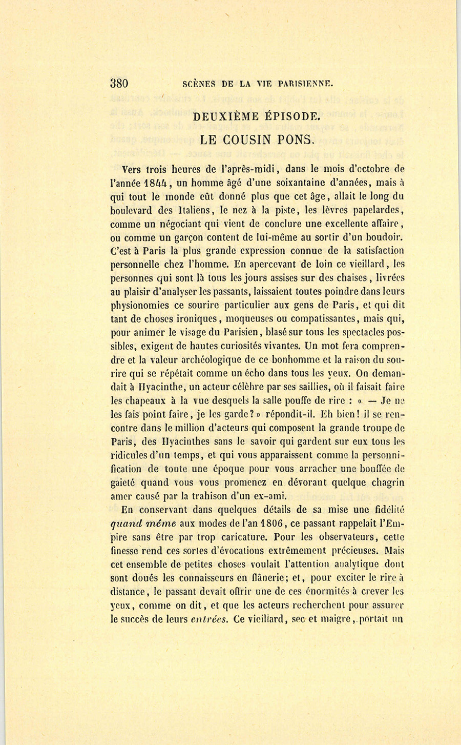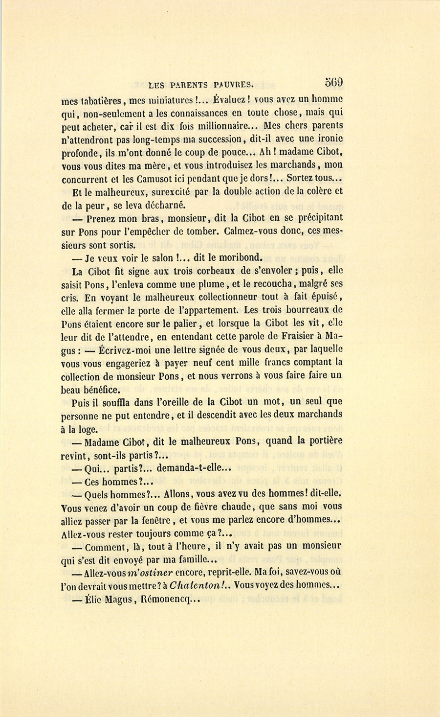 Tout le monde désirera sans doute savoir ce qu’est devenue l’héroïne de cette histoire, malheureusement trop véridique dans ses détails, et qui, superposée à la précédente, dont elle est la sœur jumelle, prouve que la grande force sociale est le caractère. Vous devinez, ô amateurs, connaisseurs et marchands, qu’il s’agit de la collection de Pons ! Il suffira d’assister à une conversation tenue chez le comte Popinot, qui montrait, il y a peu de jours, sa magnifique collection à des étrangers.