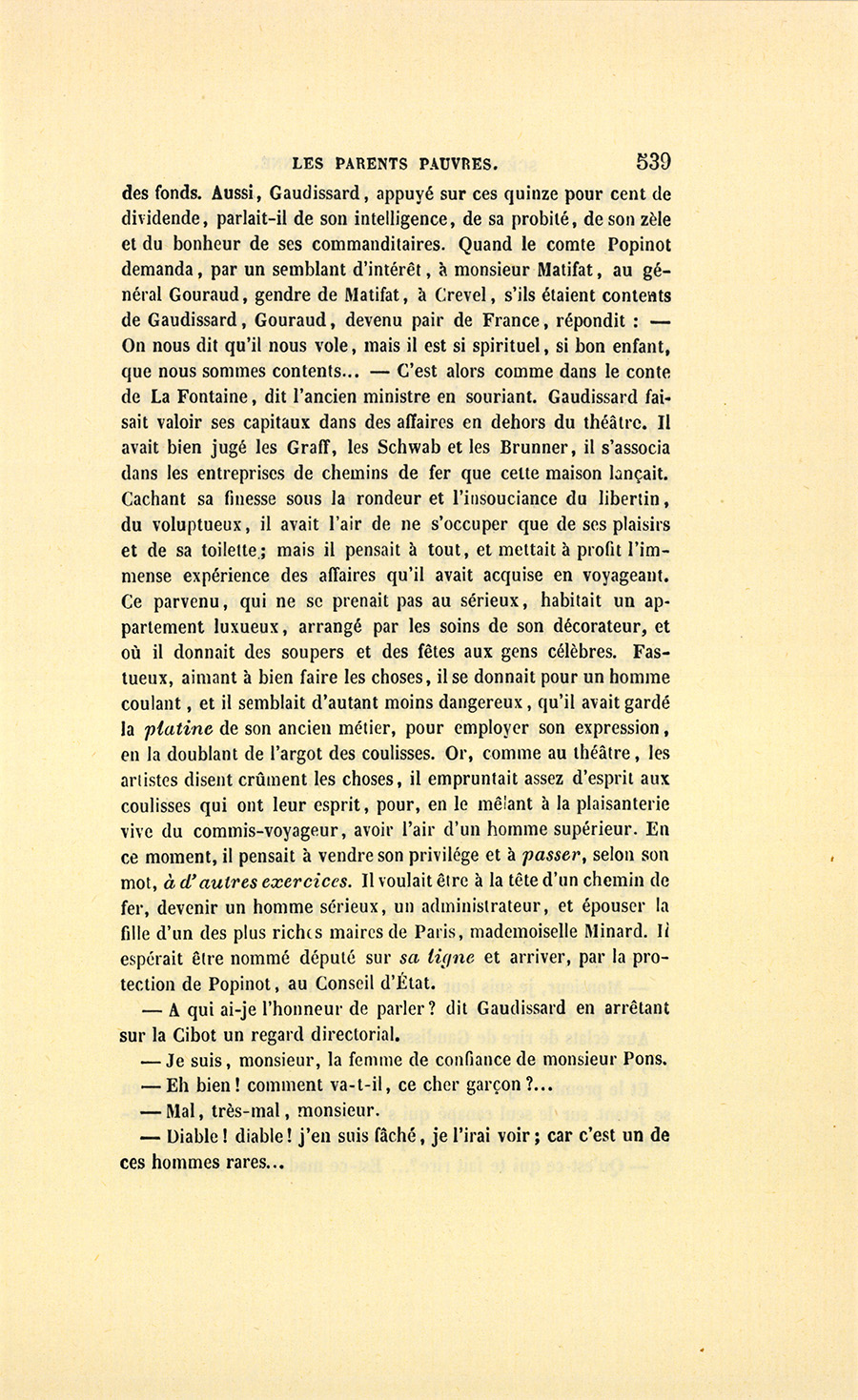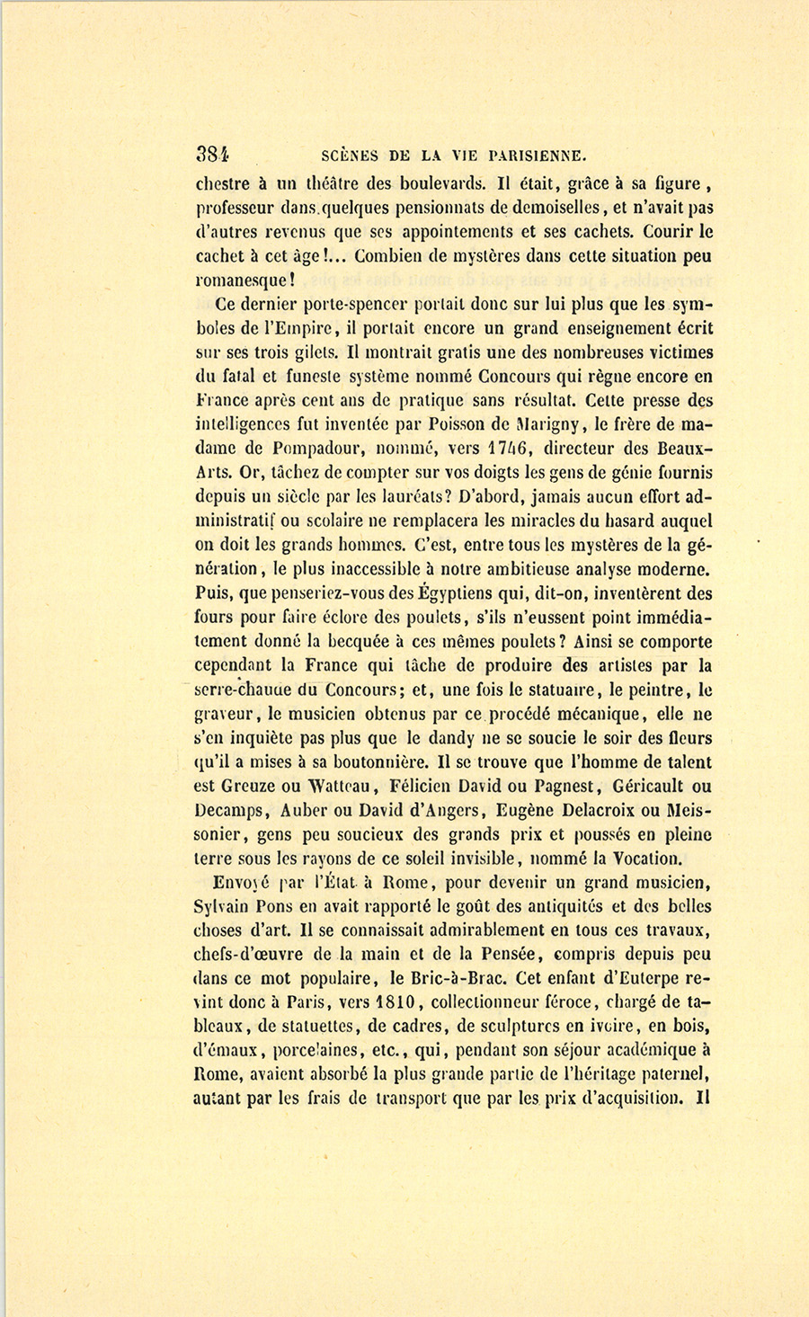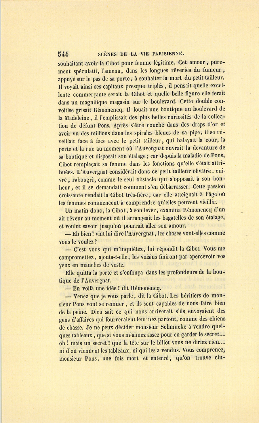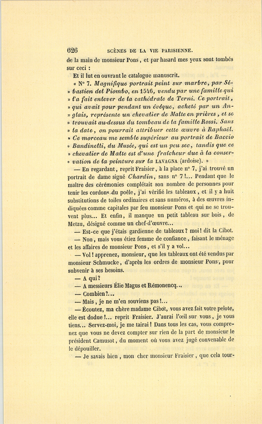 Tout le monde désirera sans doute savoir ce qu’est devenue l’héroïne de cette histoire, malheureusement trop véridique dans ses détails, et qui, superposée à la précédente, dont elle est la sœur jumelle, prouve que la grande force sociale est le caractère. Vous devinez, ô amateurs, connaisseurs et marchands, qu’il s’agit de la collection de Pons ! Il suffira d’assister à une conversation tenue chez le comte Popinot, qui montrait, il y a peu de jours, sa magnifique collection à des étrangers.