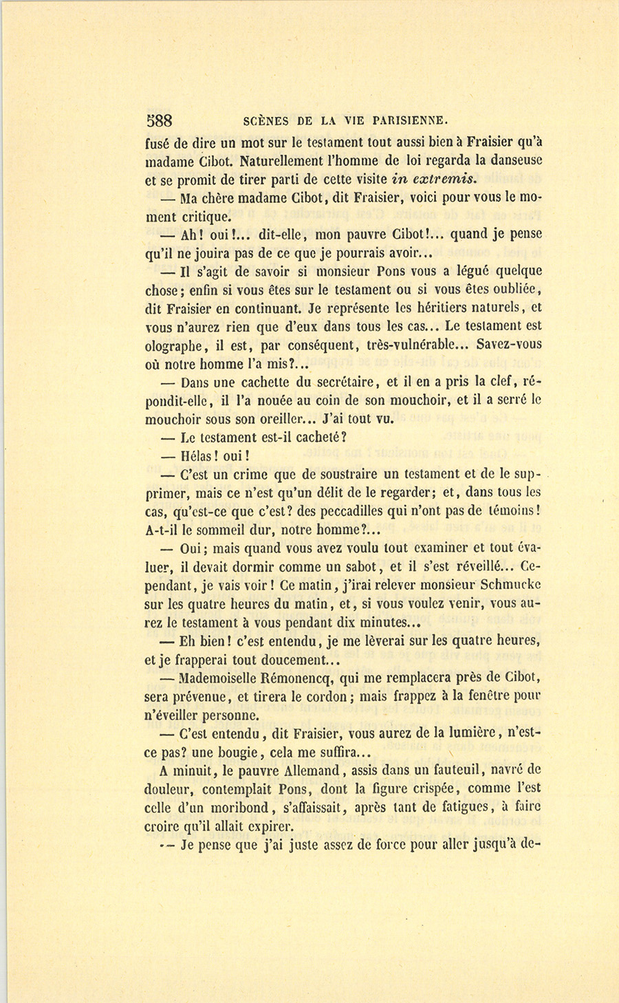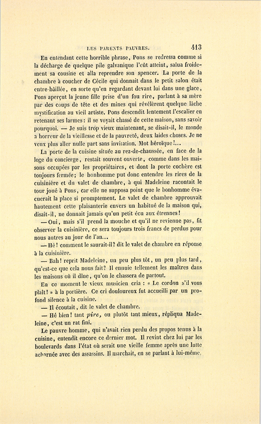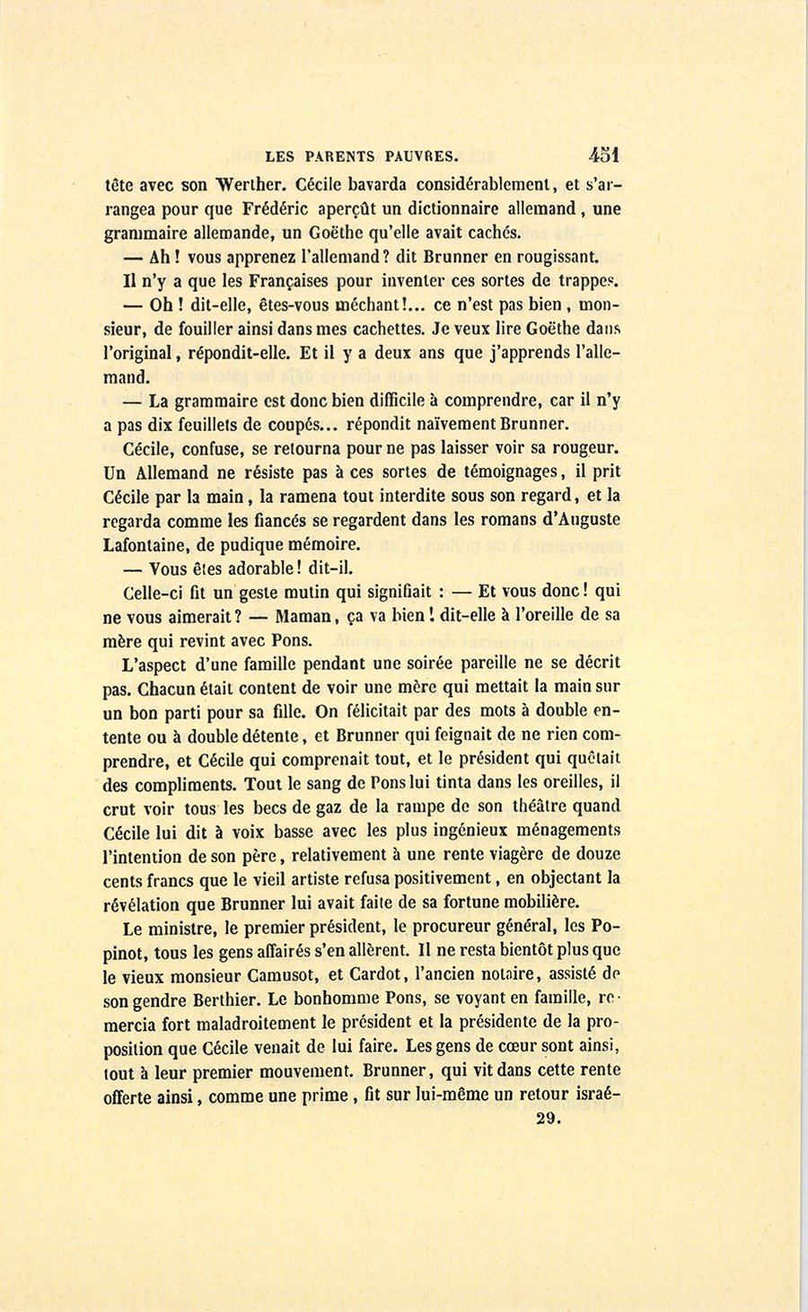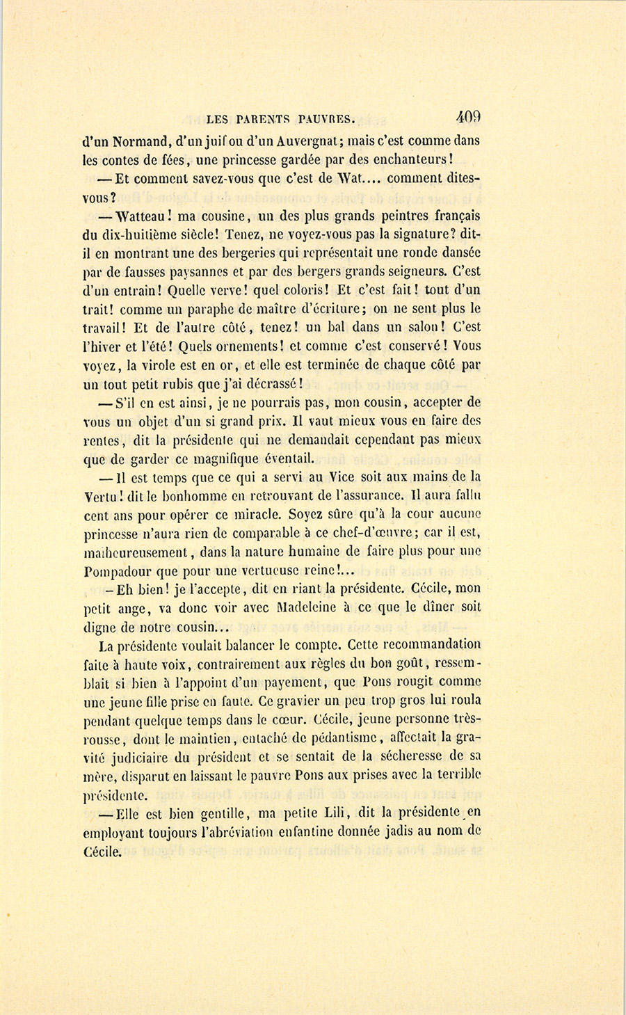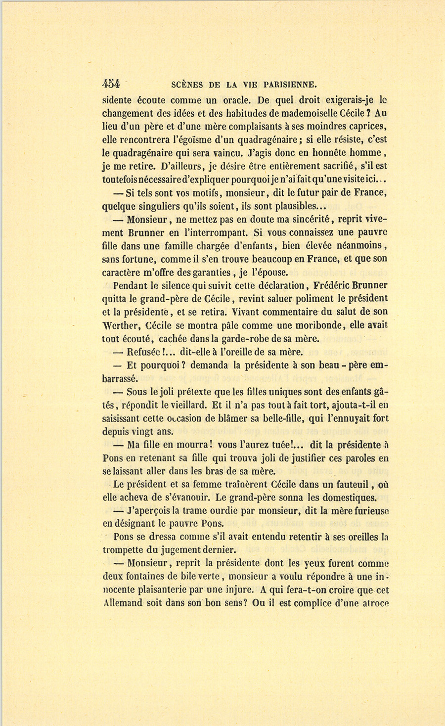 Tout le monde désirera sans doute savoir ce qu’est devenue l’héroïne de cette histoire, malheureusement trop véridique dans ses détails, et qui, superposée à la précédente, dont elle est la sœur jumelle, prouve que la grande force sociale est le caractère. Vous devinez, ô amateurs, connaisseurs et marchands, qu’il s’agit de la collection de Pons ! Il suffira d’assister à une conversation tenue chez le comte Popinot, qui montrait, il y a peu de jours, sa magnifique collection à des étrangers.