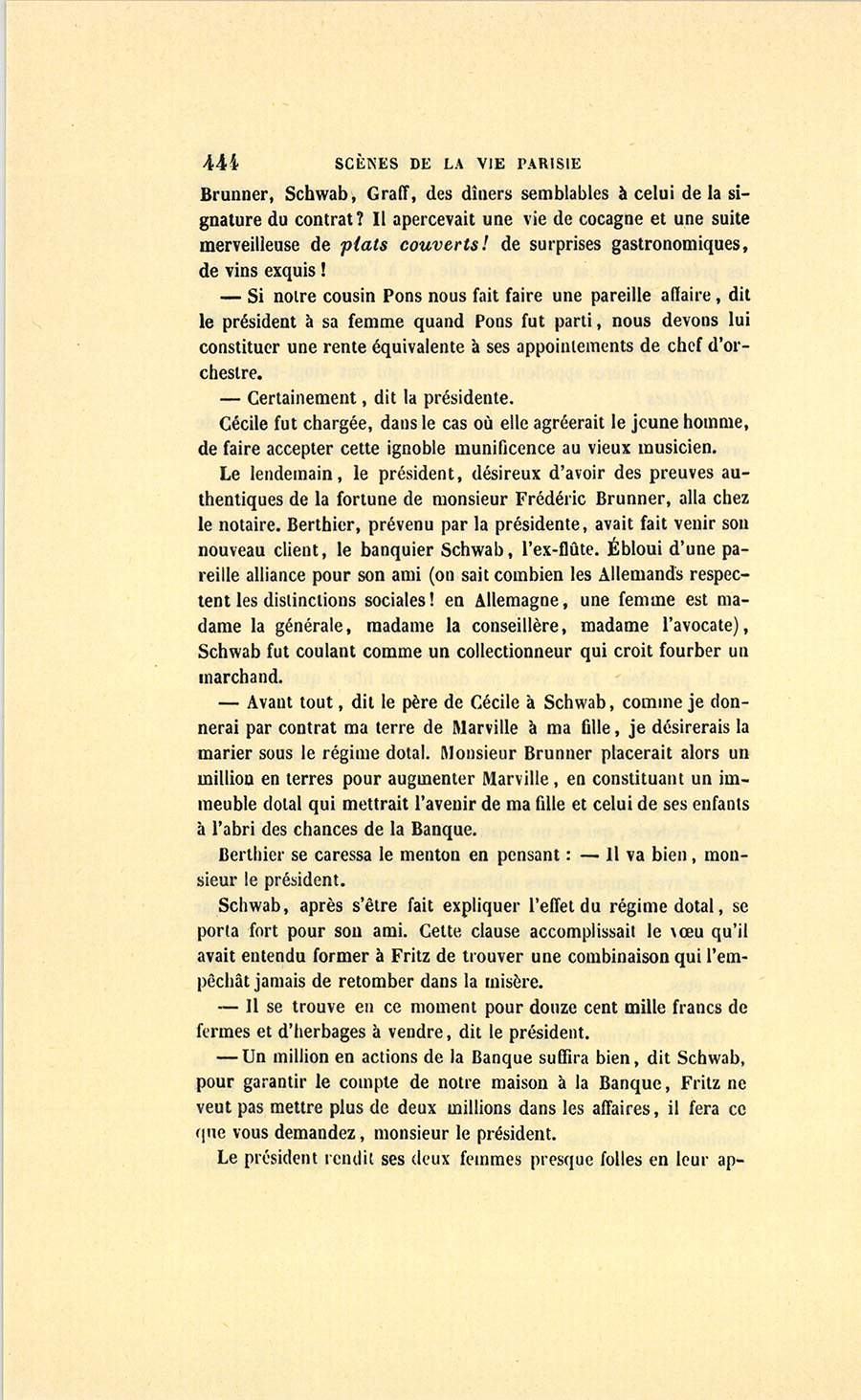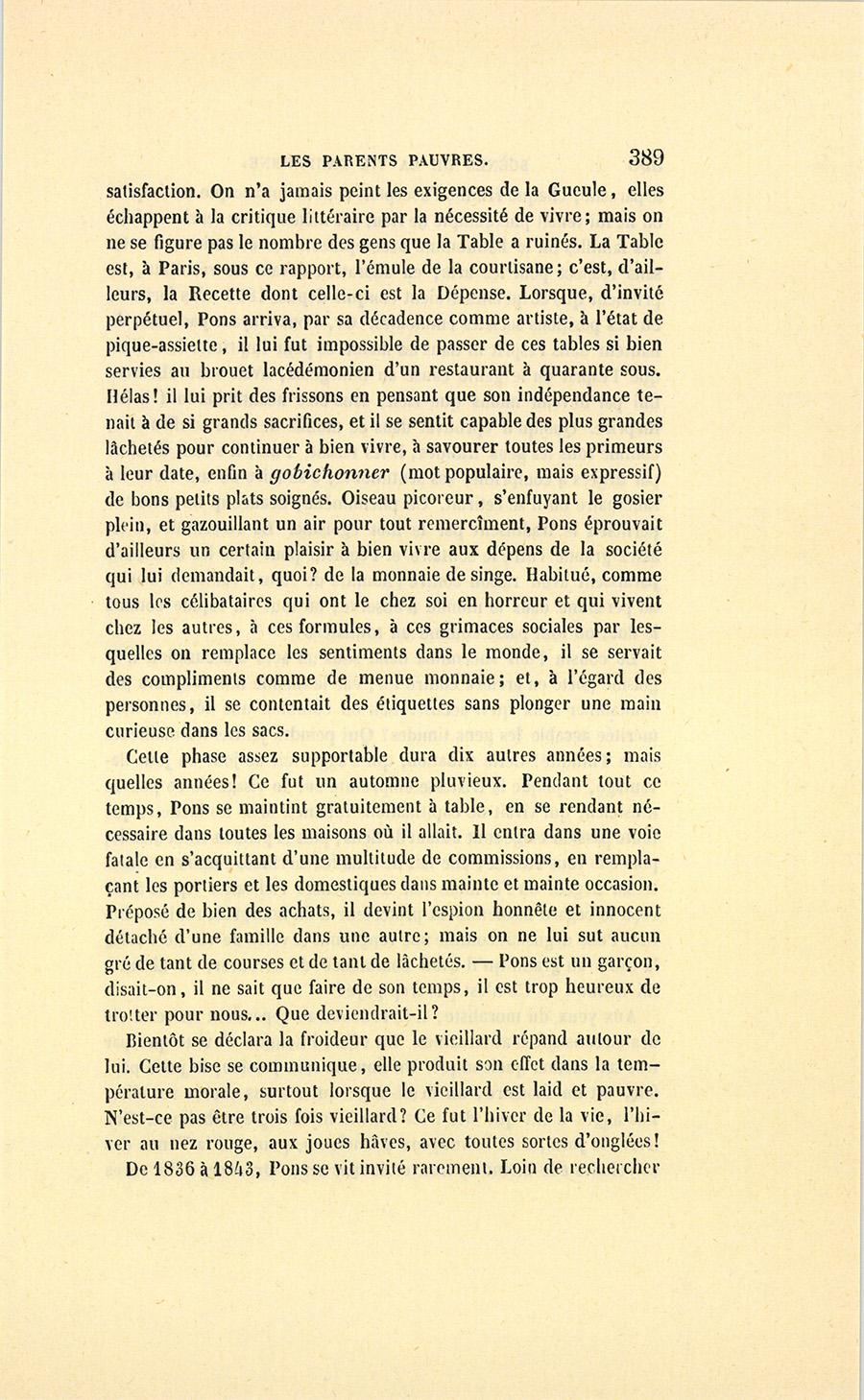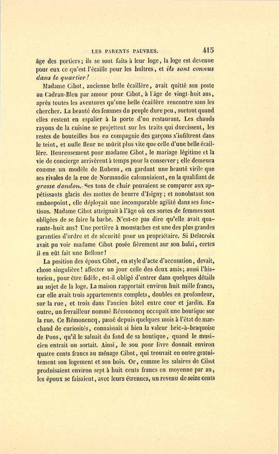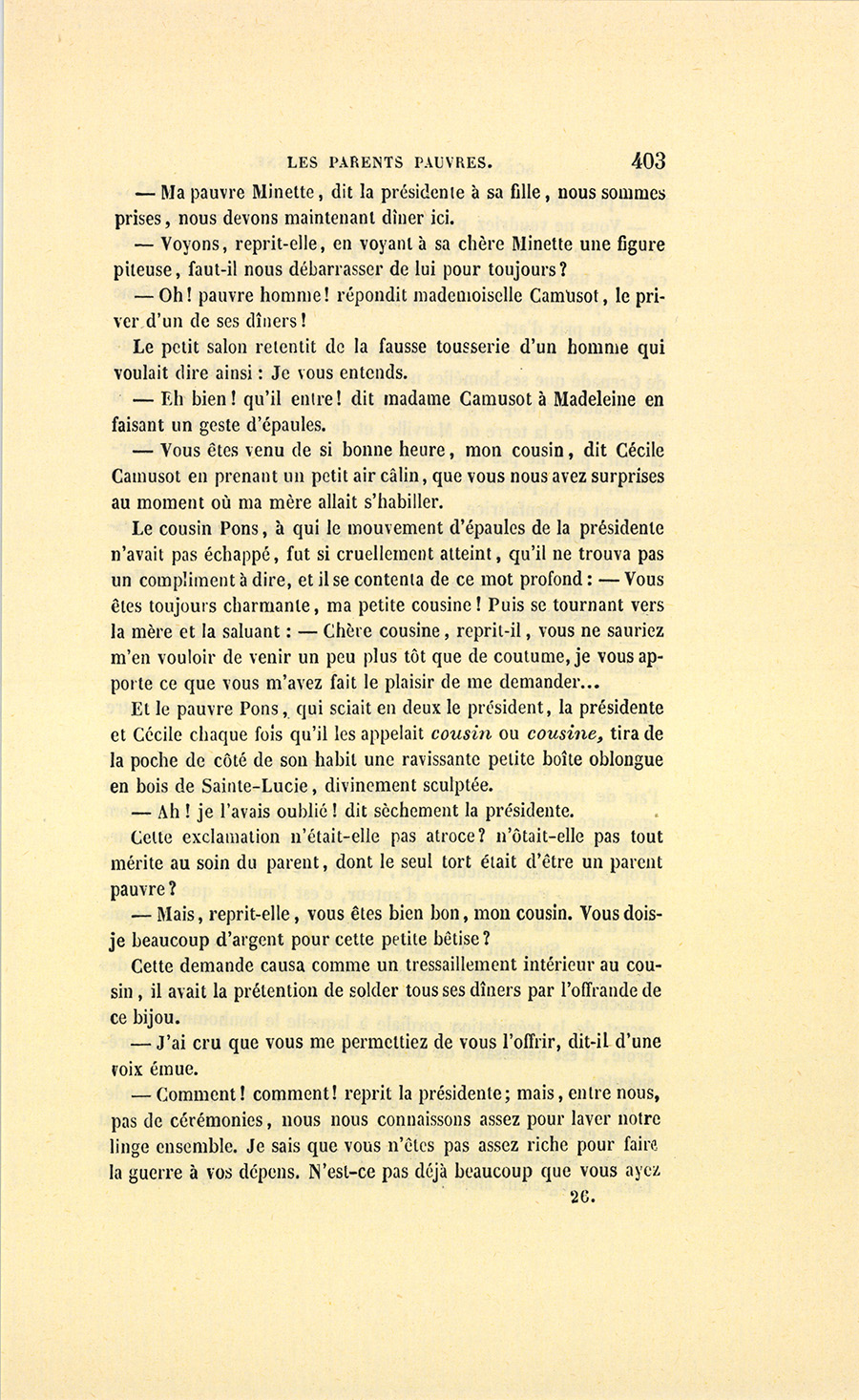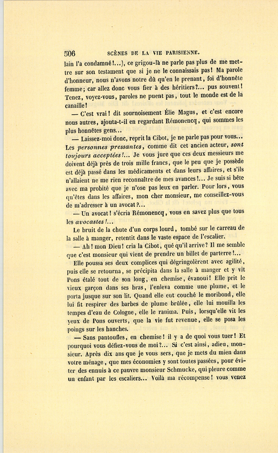 Tout le monde désirera sans doute savoir ce qu’est devenue l’héroïne de cette histoire, malheureusement trop véridique dans ses détails, et qui, superposée à la précédente, dont elle est la sœur jumelle, prouve que la grande force sociale est le caractère. Vous devinez, ô amateurs, connaisseurs et marchands, qu’il s’agit de la collection de Pons ! Il suffira d’assister à une conversation tenue chez le comte Popinot, qui montrait, il y a peu de jours, sa magnifique collection à des étrangers.