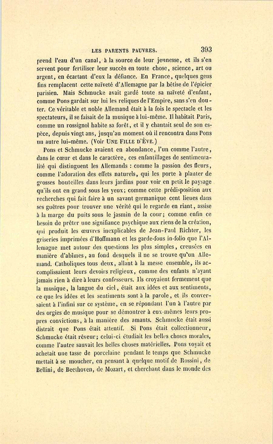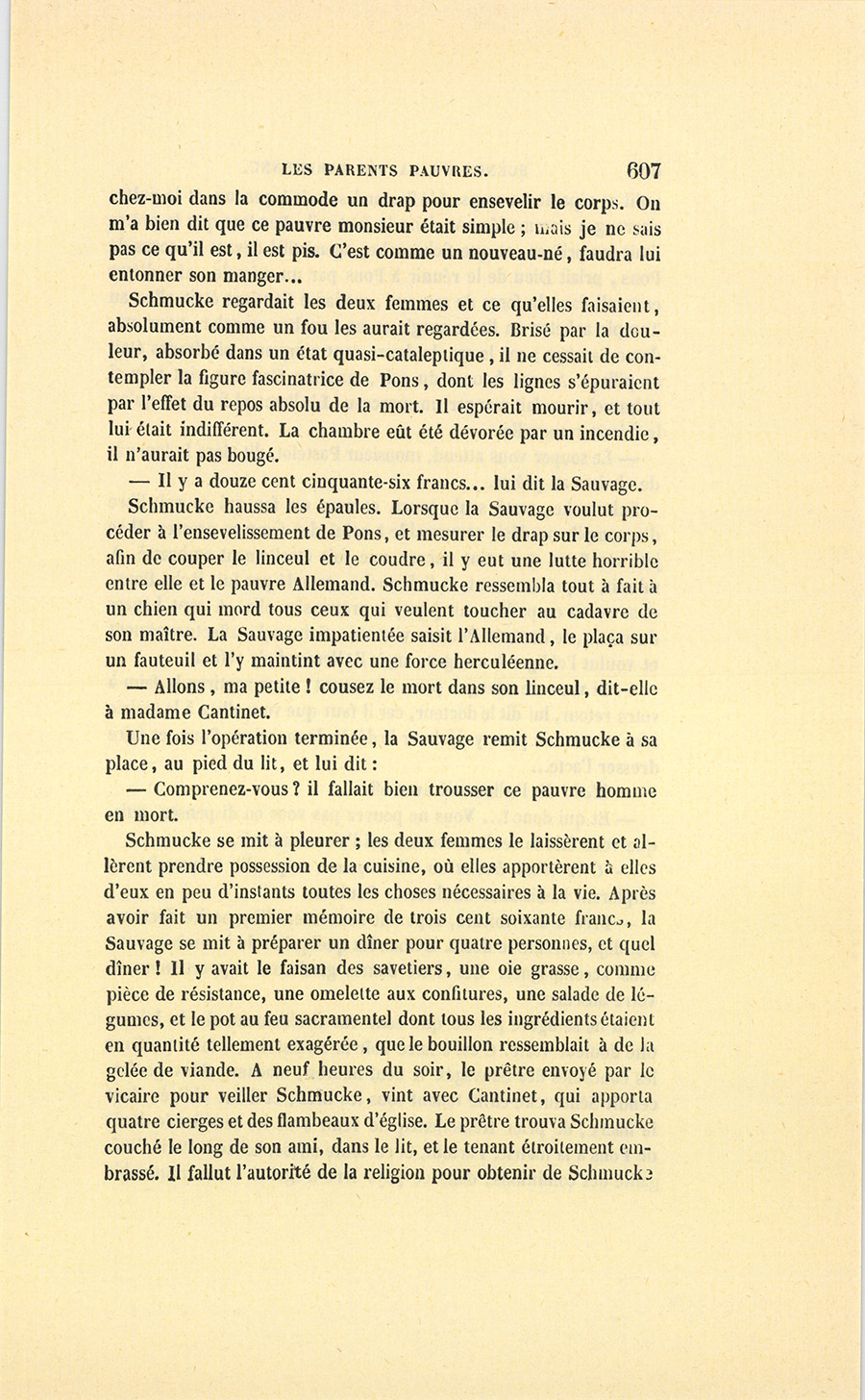 Ce féroce parvenu fut touché de cette noblesse et de cette reconnaissance pour une chose de rien aux yeux du monde, et qui, aux yeux de cet agneau divin, pesait, comme le verre d’eau de Bossuet, plus que les victoires des conquérants. Gaudissard cachait sous ses vanités, sous sa brutale envie de parvenir, et de se hausser jusqu’à son ami Popinot, un bon cœur, une bonne nature. Donc, il effaça {p. 641} ses jugements téméraires sur Schmucke, et passa de son côté.