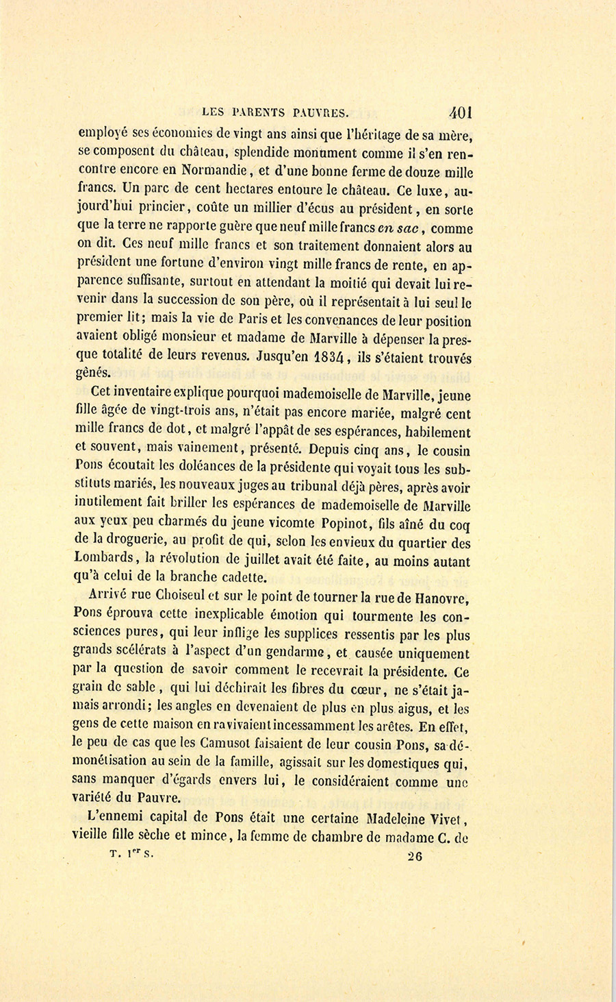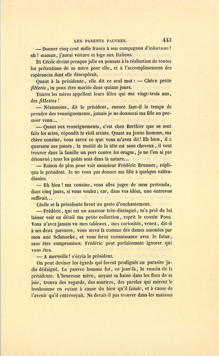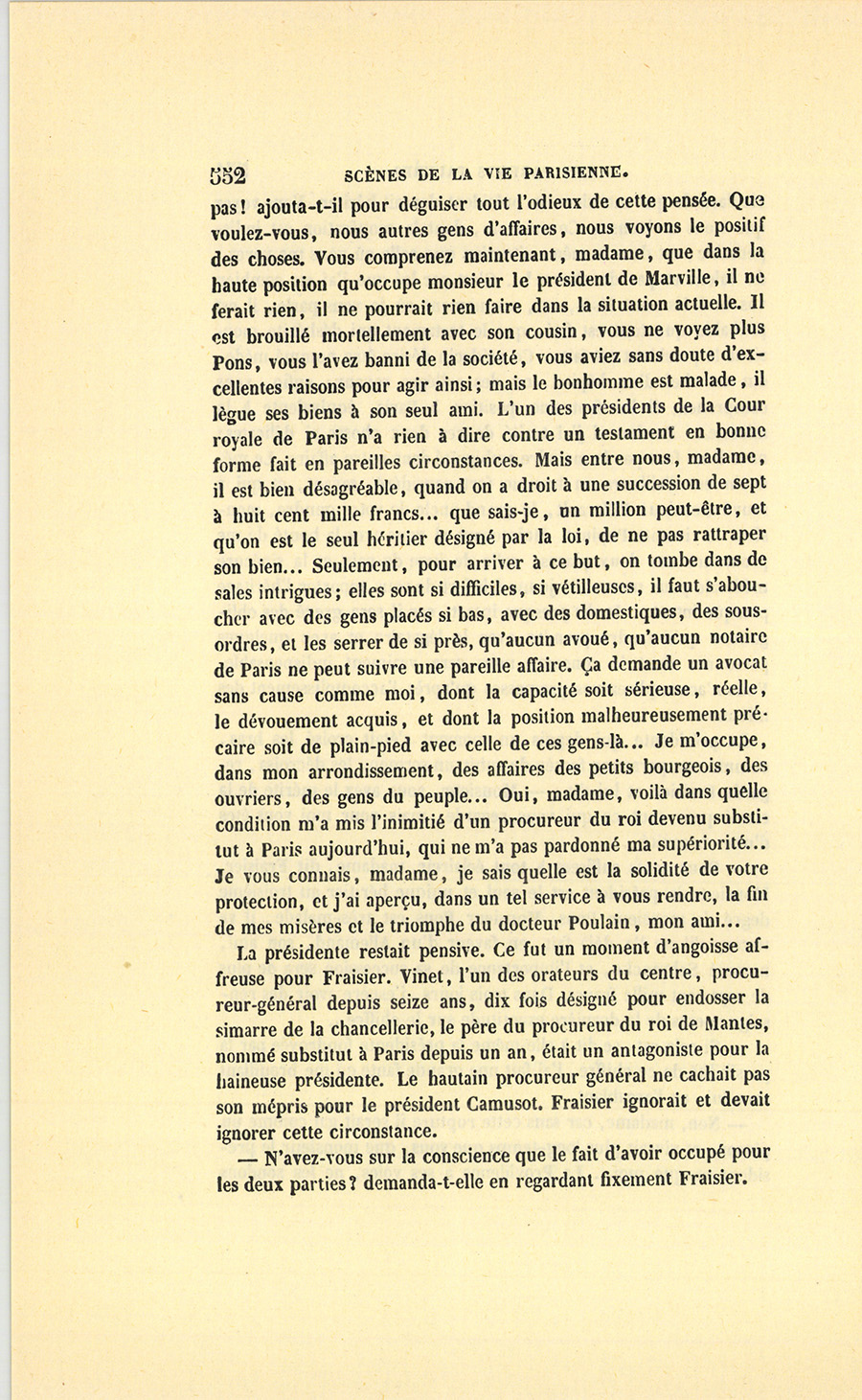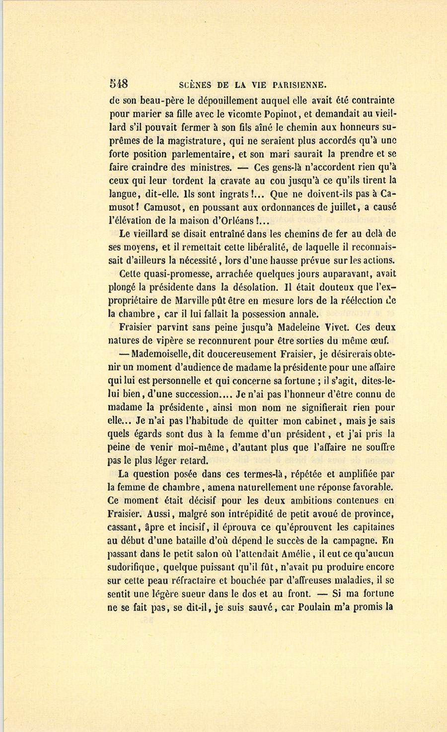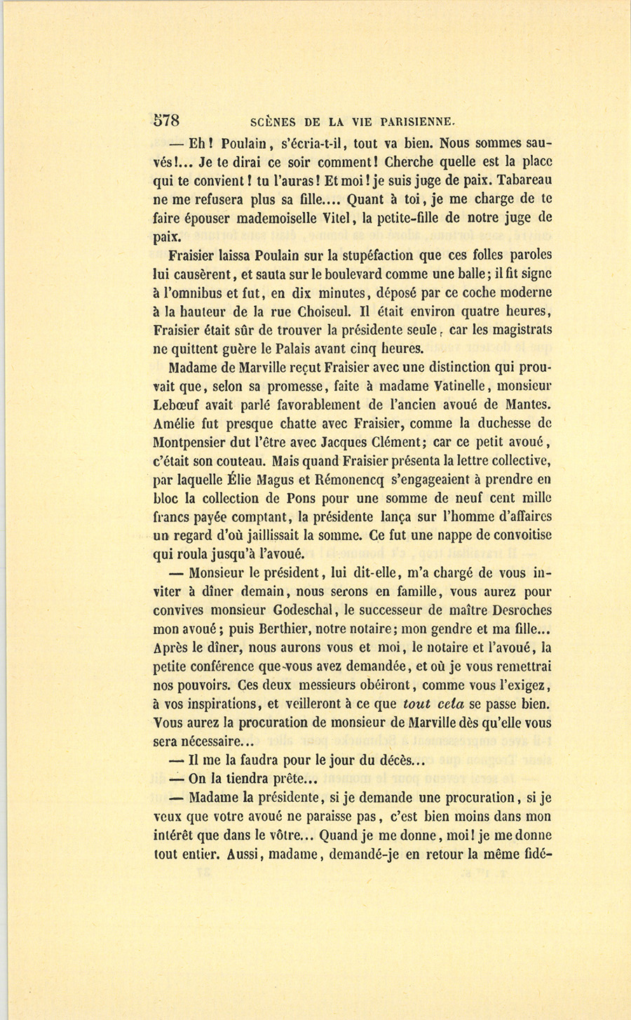 Fraisier, nommé juge de paix, est très-intime dans la maison du président, et très-apprécié par la présidente, qui n’a pas voulu lui voir épouser la fille à Tabareau ; elle promet infiniment mieux que cela à l’habile homme à qui, selon elle, elle doit non-seulement l’acquisition des prairies de Marville et le cottage, mais encore l’élection de monsieur le président, nommé député à la réélection générale de 1846.